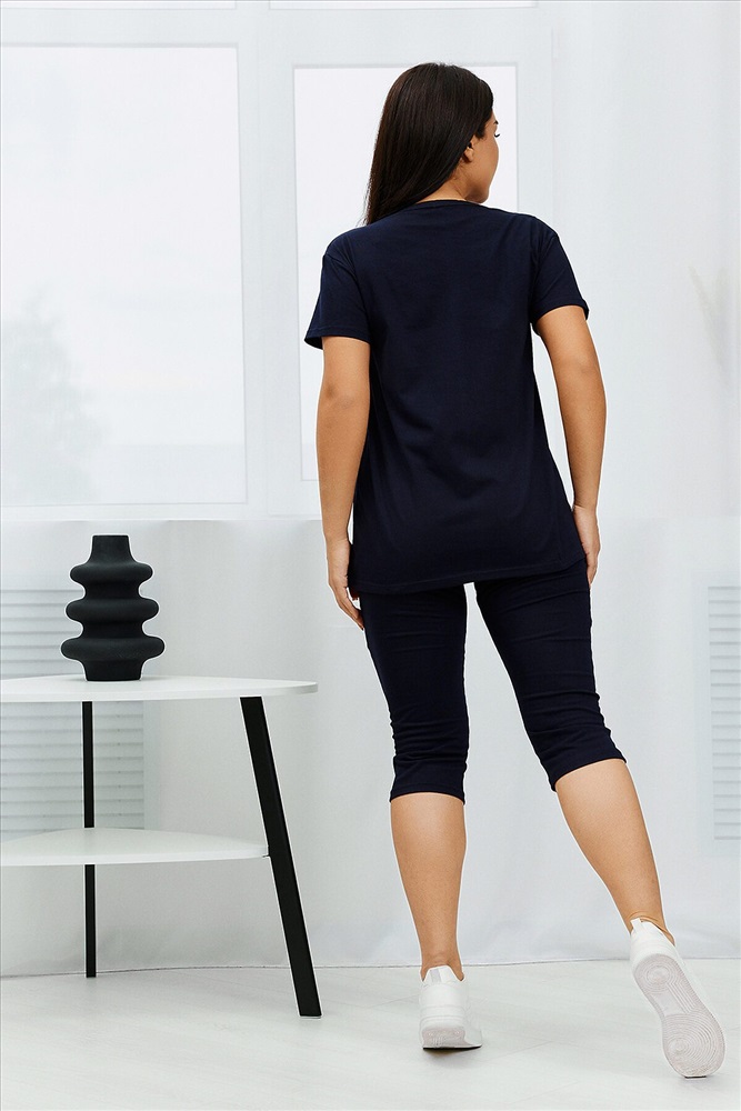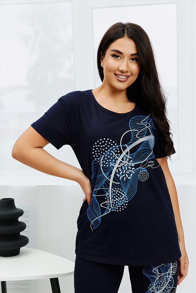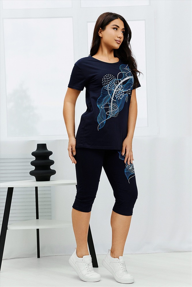 ID товара: 895123 Состав: 100% Хлопок Сезон: Весна/Лето Длина: Средняя Фасон: Прямой Рукав: Короткий Крой брючин: Облегающий Рисунок: Абстракция Основная ткань: Хлопок Стиль: Повседневный Вид ткани: Кулирка Страна бренда: Россия Страна производства: Россия Костюм женский из кулирного полотна состоит из футболки и бриджей. Футболка прямой силуэт, горловина круглая, рукав короткий втачной, низ изделия обработан на плоскошовной машине, на полочке принт. Бриджи - прямые, верх на резинке, низ обработан на плоскошовной машине. Комментарии к товару