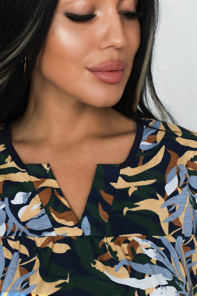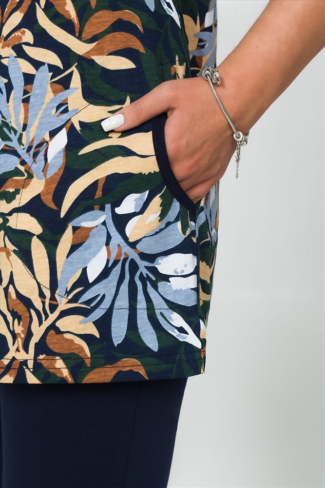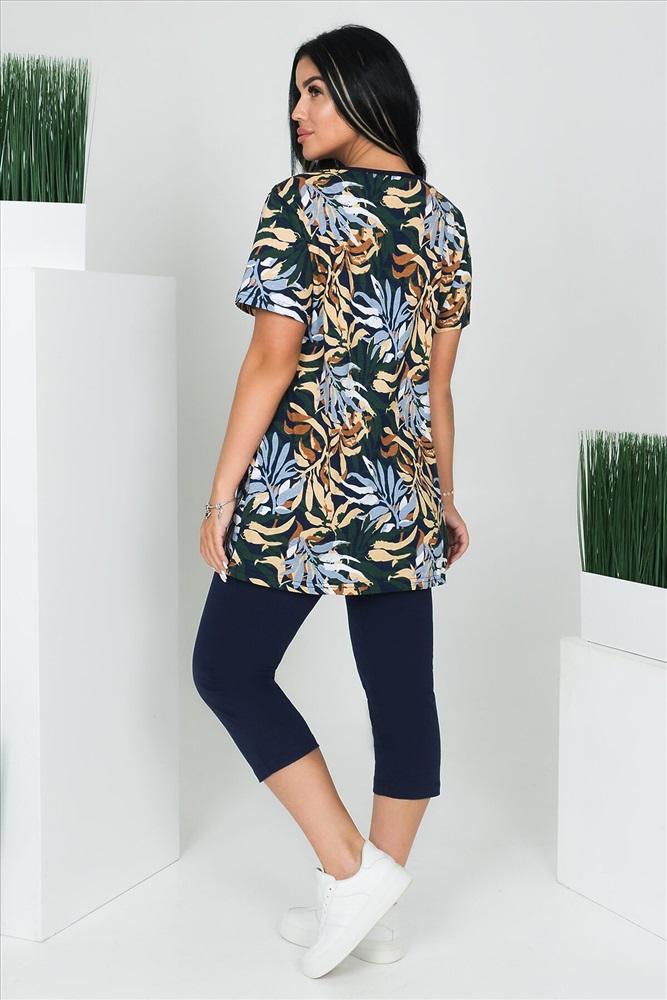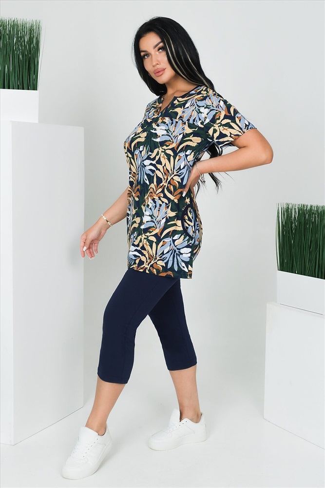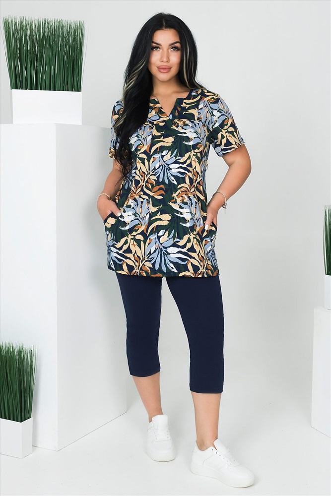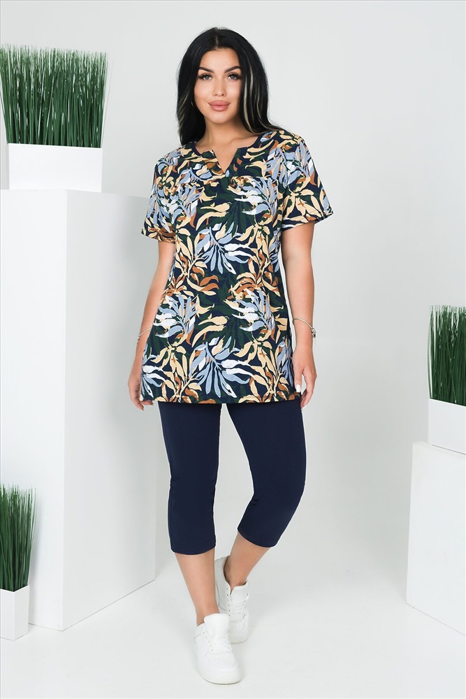 ID товара: 978112 Состав: 100% Хлопок Сезон: Весна/Лето Длина: Средняя Фасон: Полуприлегающий Рукав: короткие Крой брючин: Облегающий Рисунок: растительный Тип карманов: Накладные Декоративные элементы: Принт Основная ткань: Хлопок Стиль: повседневный Вид ткани: Кулирка Страна бренда: Россия Страна производства: Россия Костюм женский дачный из кулирного трикотажа состоит из туники и бридж. Туника свободной формы, длиной до середины бедер. Перед с кокеткой и со сборкой на грудь. Горловина округлой форма, с планками. Карманы боковые с окантованным входом. Рукава короткие втачные. Бриджи среднего облегания, длиной до середины икры. Пояс на резинке. Без карманов. Комментарии к товару