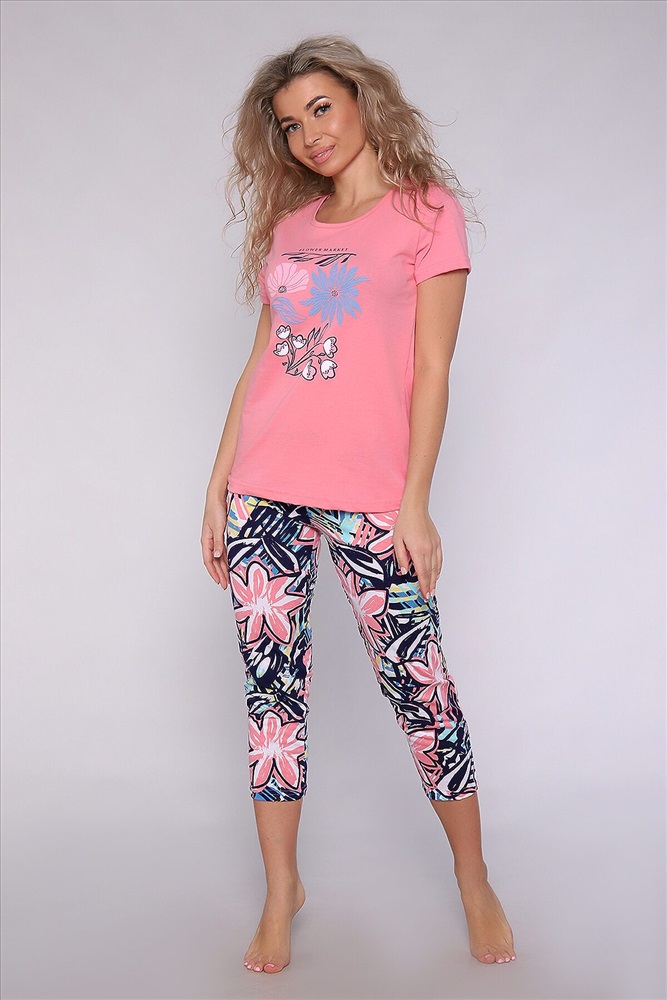 ID товара: 944248 Состав: 100% Хлопок Сезон: Демисезон Длина: Средняя Фасон: Прямой Рукав: короткие Основная ткань: Хлопок Стиль: Повседневный Вид ткани: Кулирка Страна бренда: Россия Страна производства: Россия Костюм из хлопковой кулирки футболка с бриджами без карманов. Бриджи с ярким солнечным рисунком, футболка с принтом. Хорошо подходит в качестве домашней одежды женщинам всех возрастов. Комментарии к товару