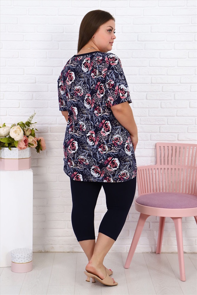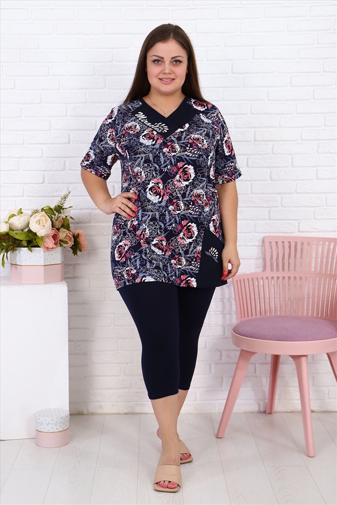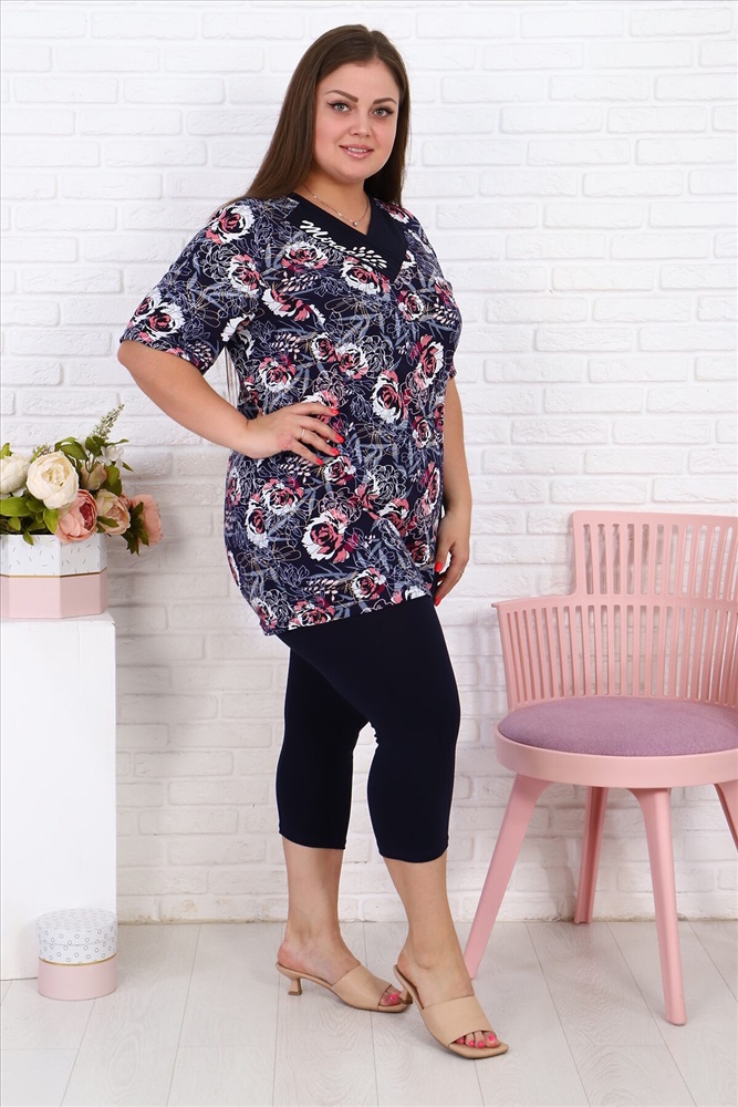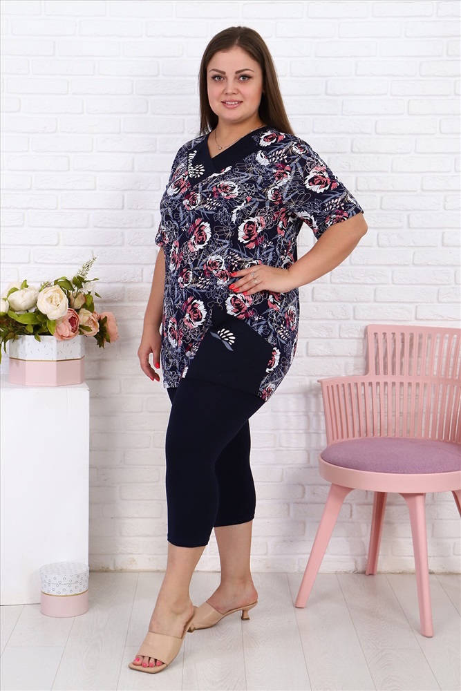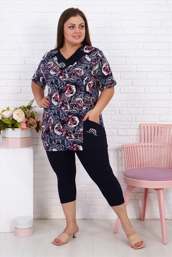 Страна производства: Россия Женский дачный костюм с леггинсами темно-синего однотонного цвета и туникой с карманом темно-синего цвета с розовыми и белыми цветами, небольшие принты на кармане и планке у ворота