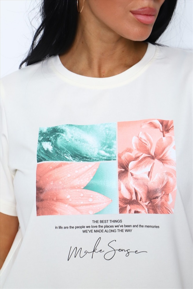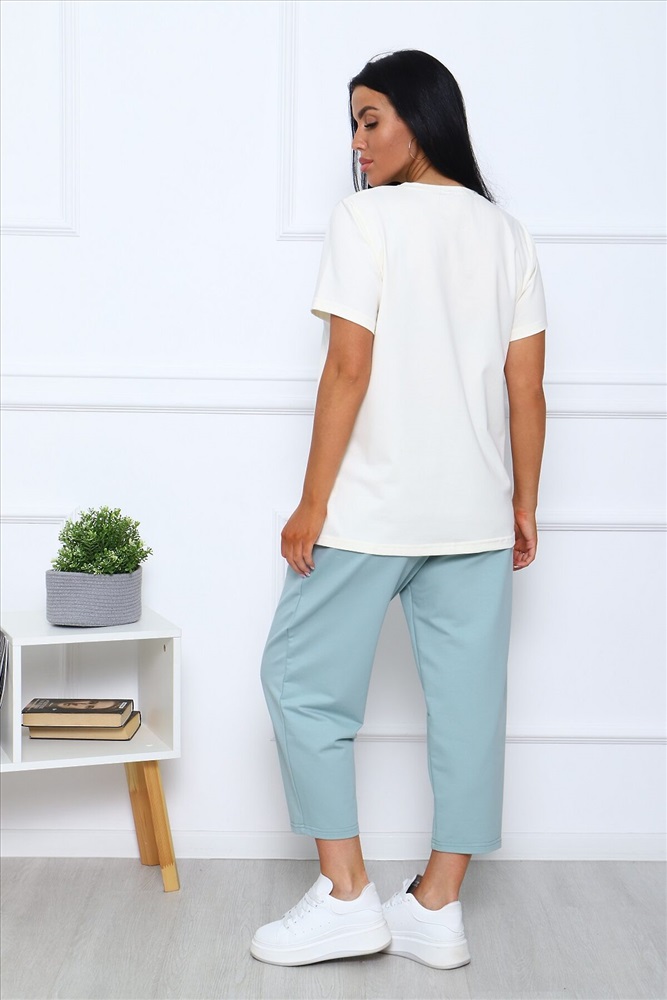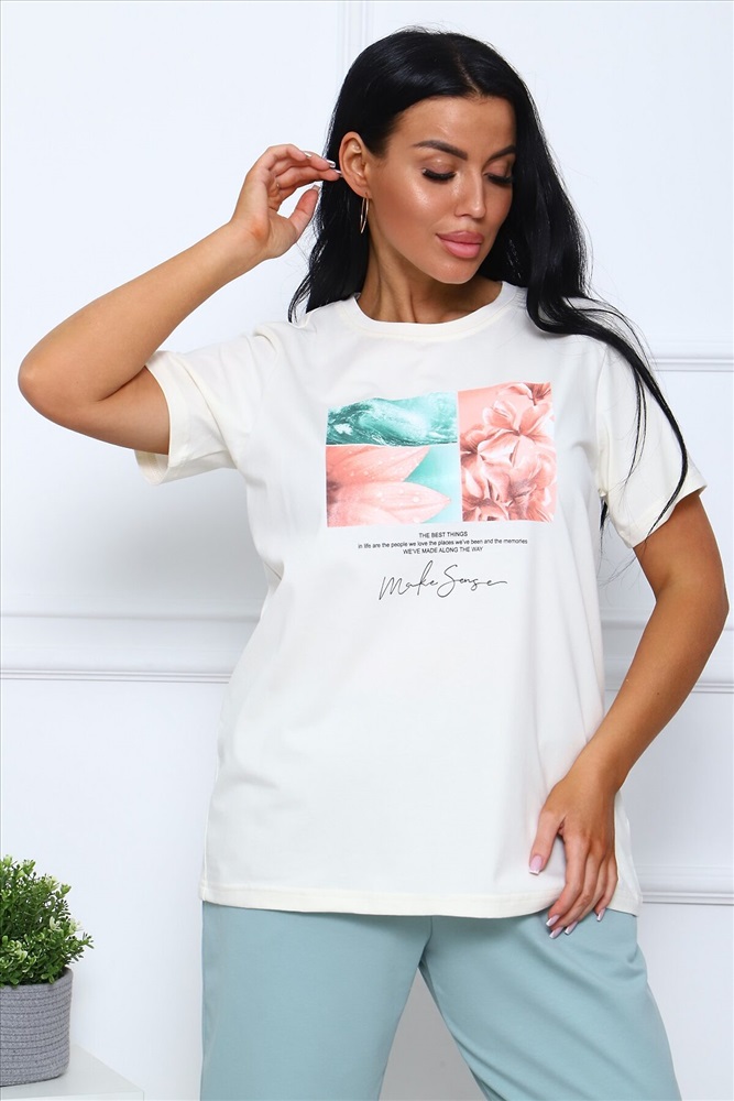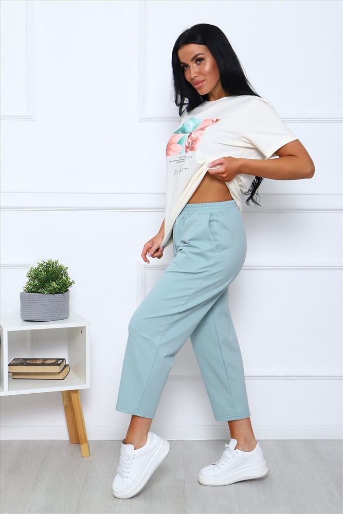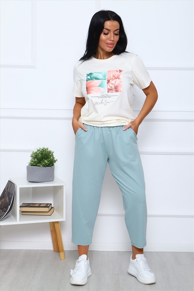 Страна производства: Россия Костюм женский в пастельных тонах: футболка базовая с короткими рукавами, с нежным цветочным принтом на груди, комфортные бриджи на широком эластичном поясе, с карманами в боковых швах.