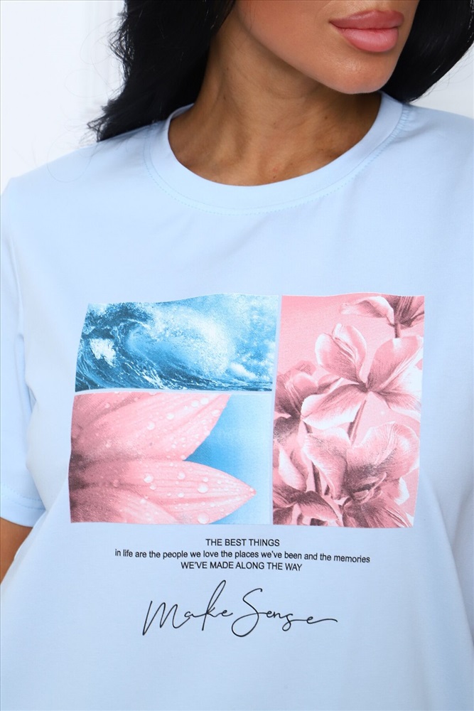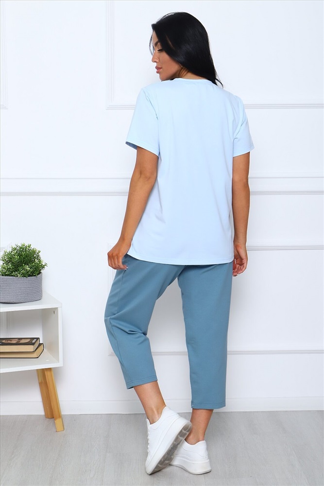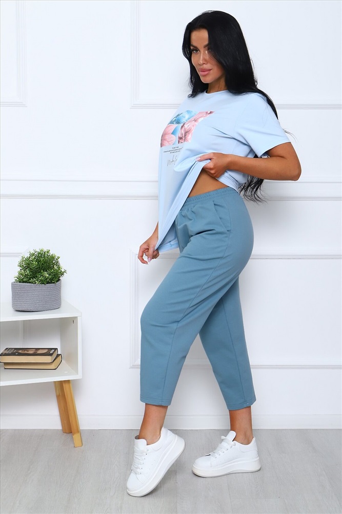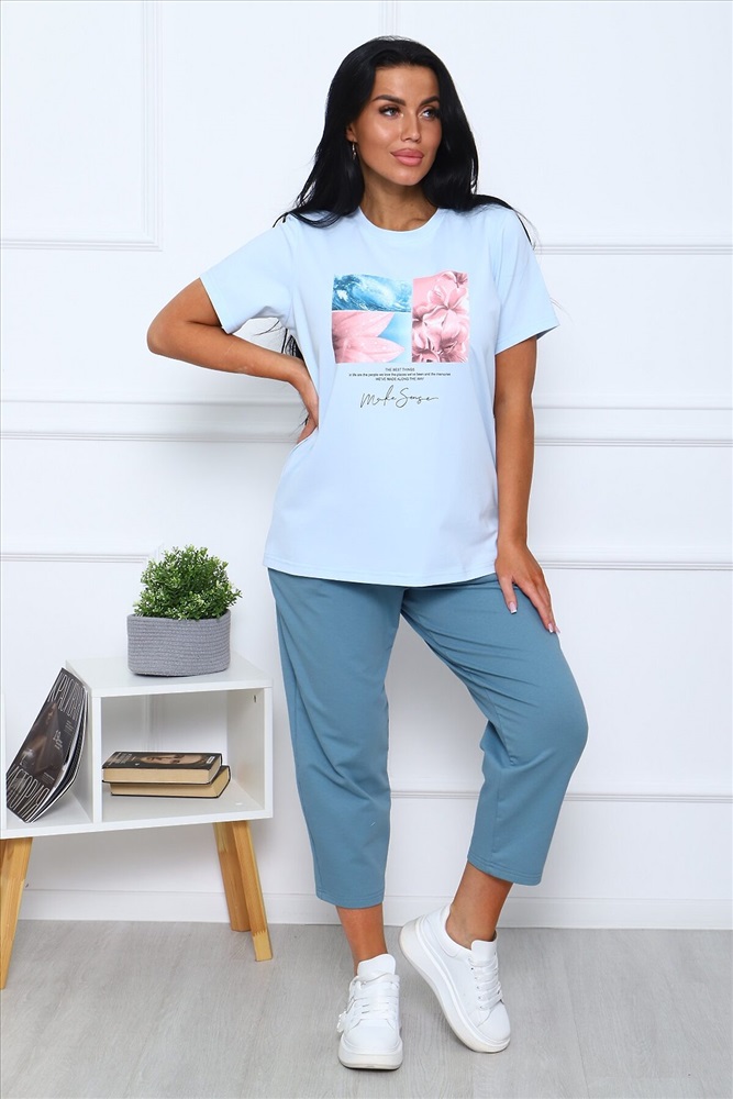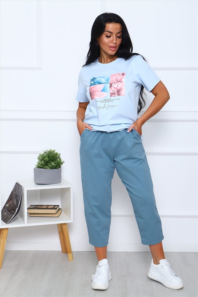 Страна производства: Россия Костюм женский в пастельных тонах: футболка базовая с короткими рукавами, с нежным цветочным принтом на груди, комфортные бриджи на широком эластичном поясе, с карманами в боковых швах.
