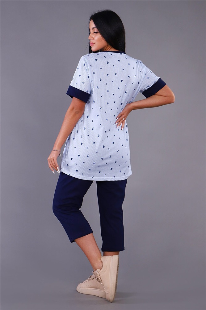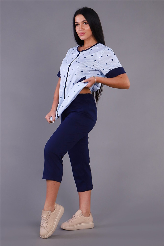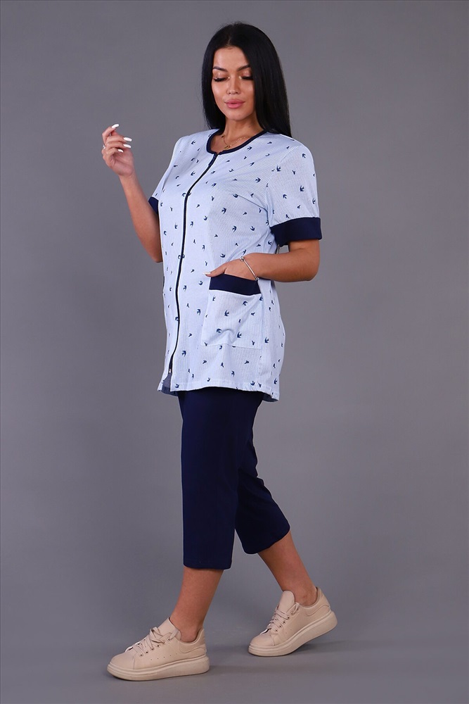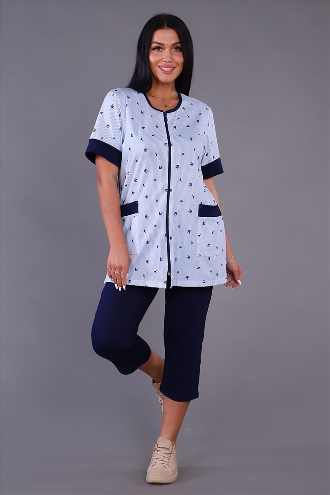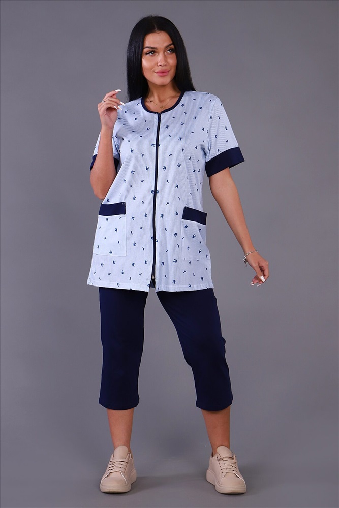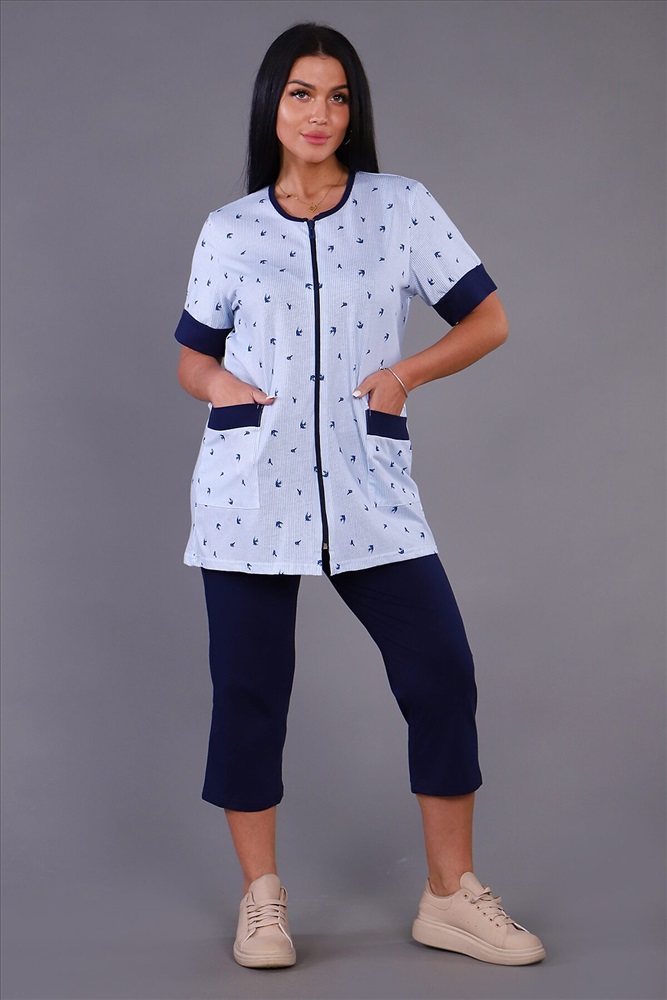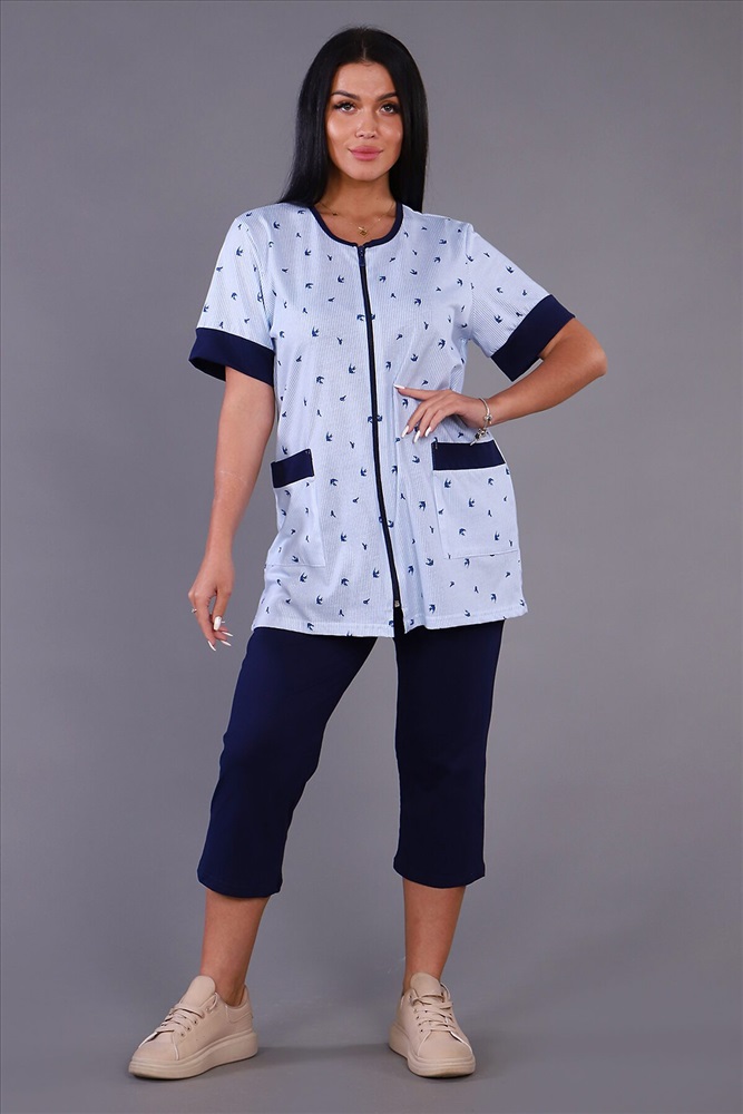 Женский костюм из кулирки футболка + бриджи. Футболка из набивной ткани на молнии с накладными карманами, короткие рукава с манжетами, бриджи из однотонной ткани. Идеальный костюм для отдыха дома, на даче.