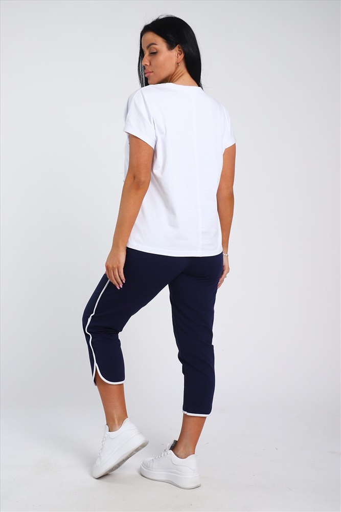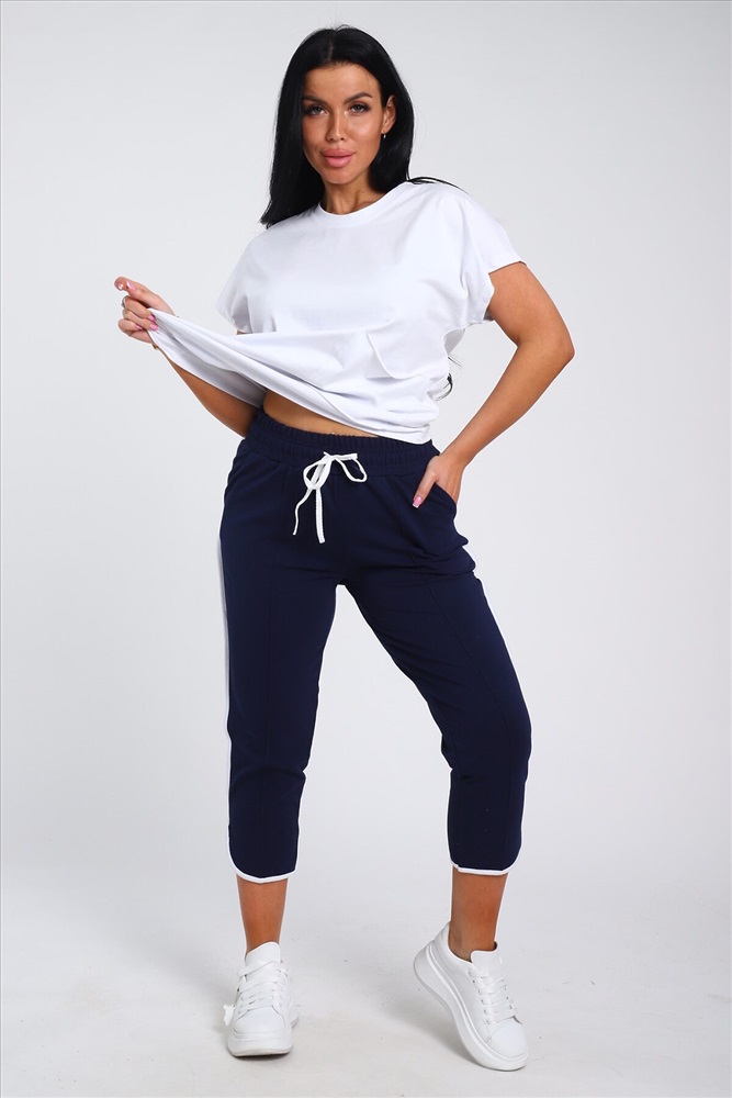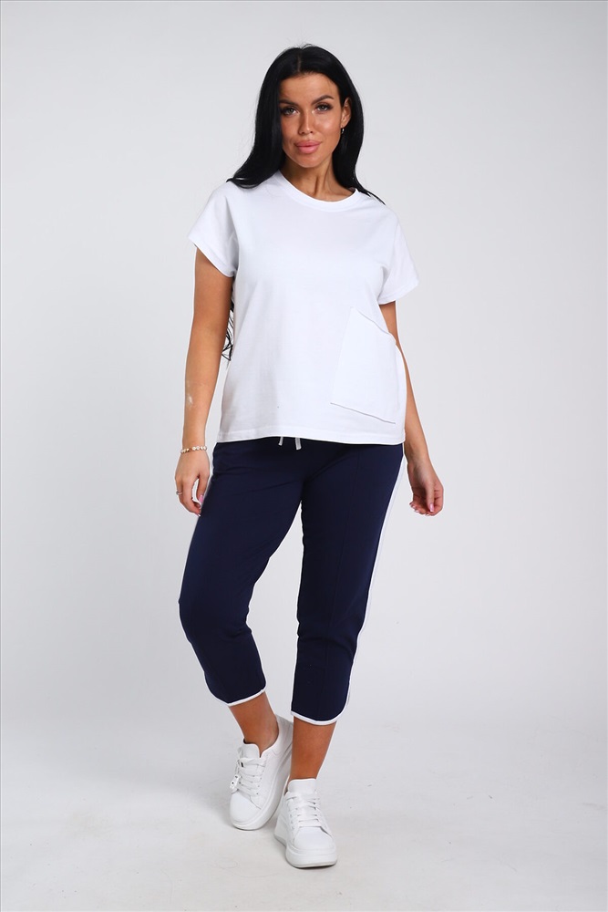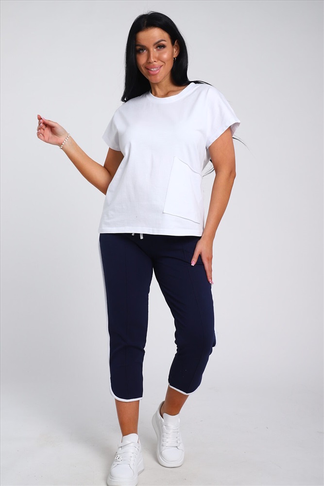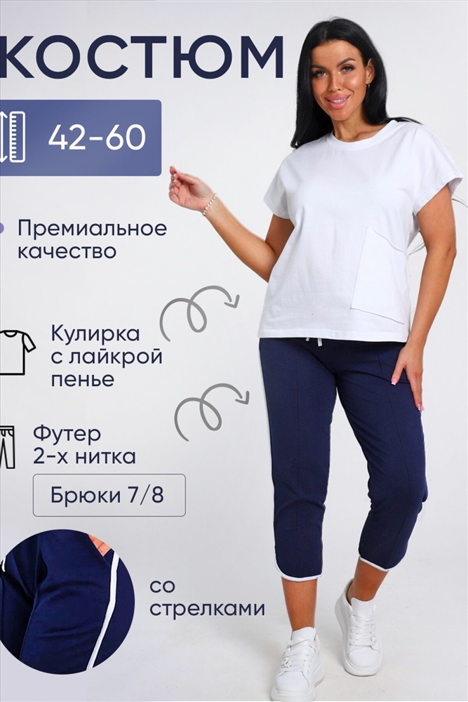 ID товара: 978375 Состав: 74% Хлопок, 21% Полиэстер, 5% Лайкра; 94% Хлопок, 6% Лайкра Сезон: Весна/Лето Длина: Средняя Фасон: Полуприлегающий Рукав: короткие Крой брючин: Зауженный Тип карманов: В шве Основная ткань: Хлопок Стиль: повседневный Вид ткани: Кулирка с лайкрой пенье, футер 2-х нитка Страна бренда: Россия Страна производства: Россия Представляем Вашему вниманию современный костюм, состоящий из брюк и футболки. Наша модель футболки полуприлегающего кроя, имеет спущенную пройму. Футболка отлично сочетается с укороченными брюками с отстроченной стрелкой спереди, двумя боковыми карманами, поясом на резинке и шнурком. Костюм имеет большую размерную сетку с 42р по 60 размер . Комментарии к товару