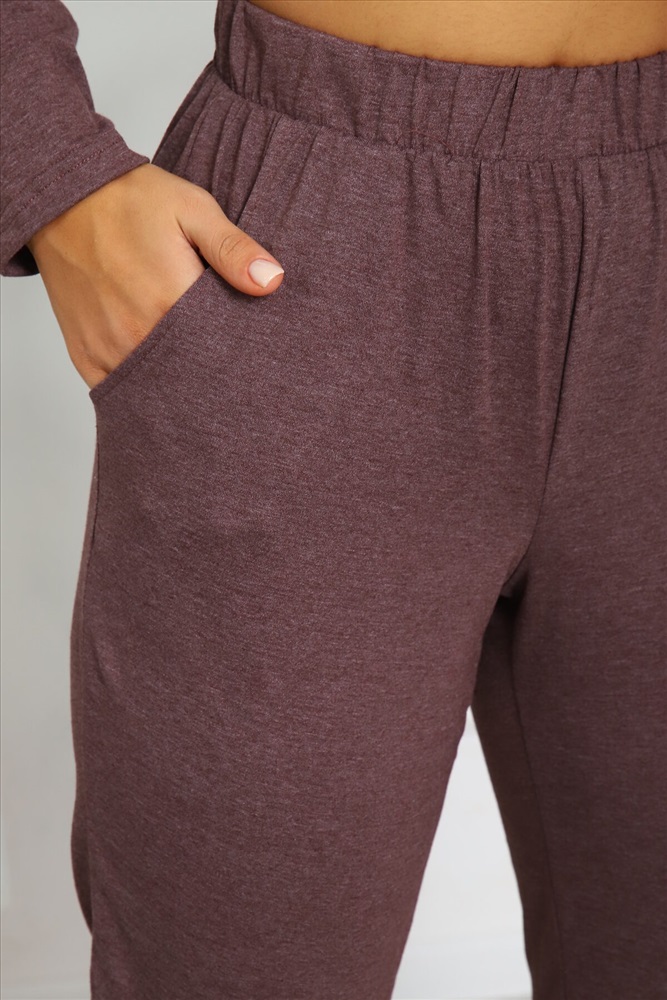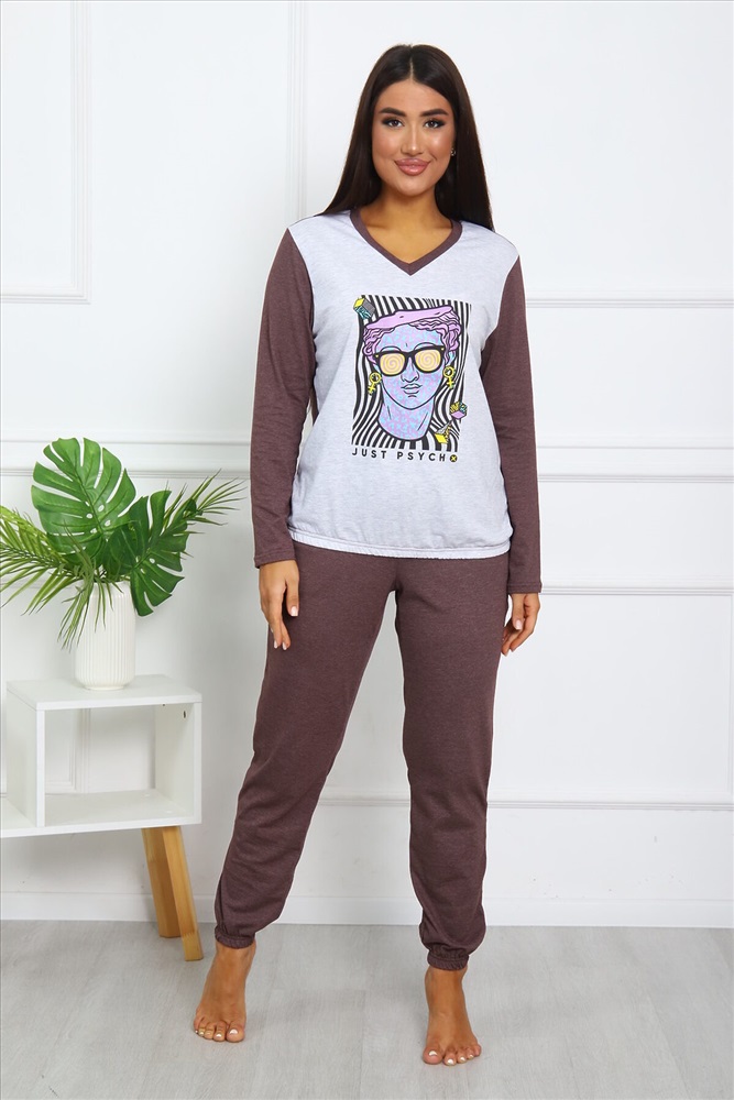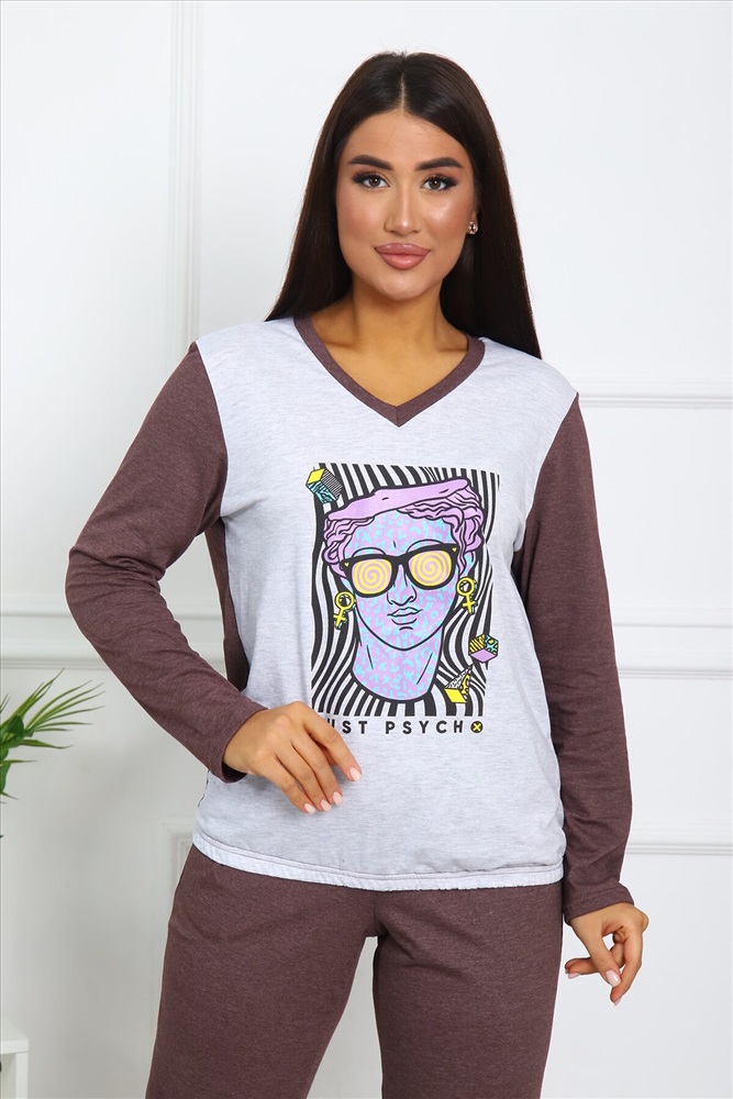 Страна производства: Россия Костюм женский выполнен из меланжированной кулирки. Кофта с длинным рукавом снизу на резинки, горловина окантована, на полочке выполнена печать. Брюки свободного силуэта, по бокам карманы, низ брюк на резинке