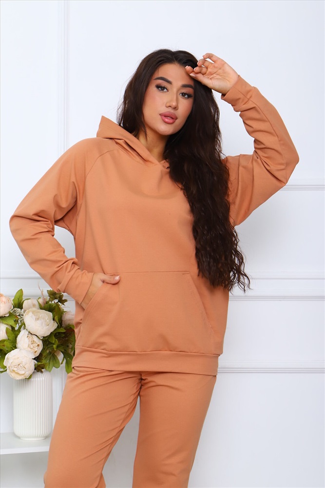 Костюм женский, выполнен из трикотажного полотна футер 2-х нитка. Костюм состоит из кофты и брюк. Кофта свободного кроя с капюшоном, рукава на манжетах, на полочке карман кенгуру. Брюки прямого кроя, с карманами.