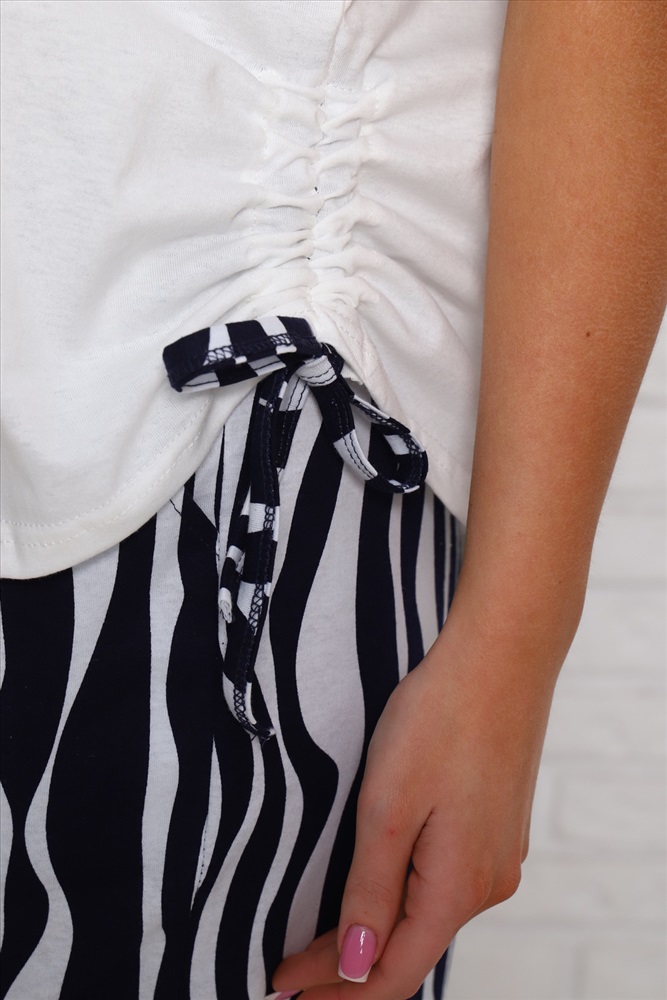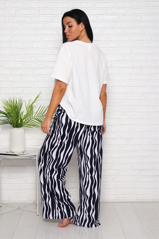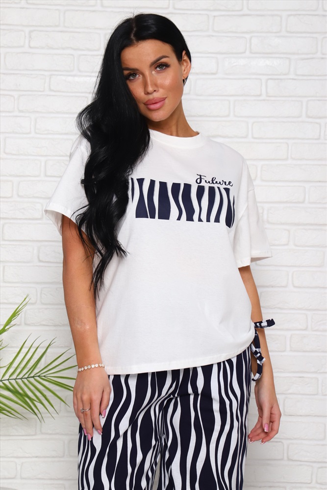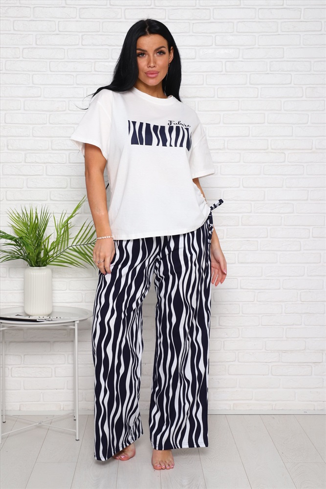 Застежка: без застежки Женский костюм выполнен из трикотажного полотна кулирка. Костюм состоит из футболки и брюк. Футболка свободного силуэта по горловине выполнена обтачка, на полочке пресутсвуют печать, сбоку кулиска. Брюки расклёшенного силуэта по бокам карманы.