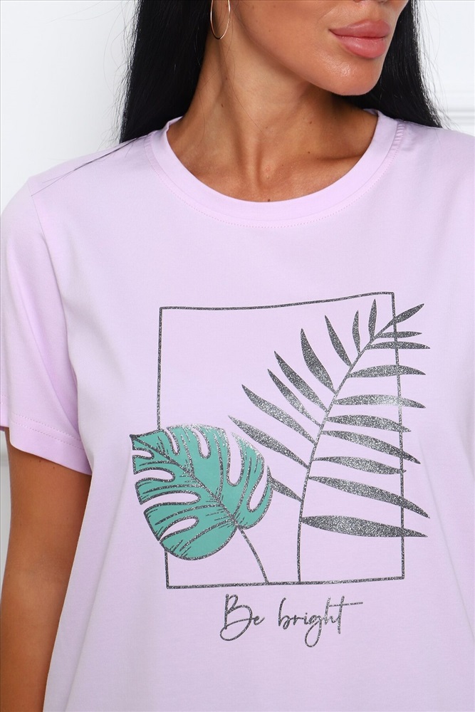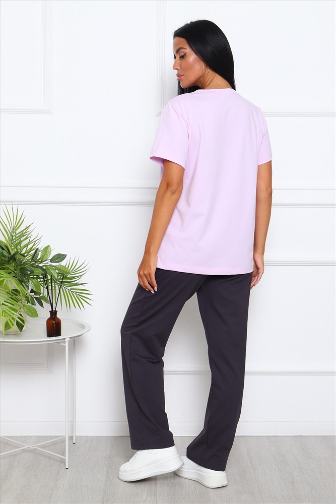 Костюм женский: брюки с удобными карманами в боковых швах, с комфортным поясом; футболка с короткими рукавами и стильным принтом с блёстками на полочке.