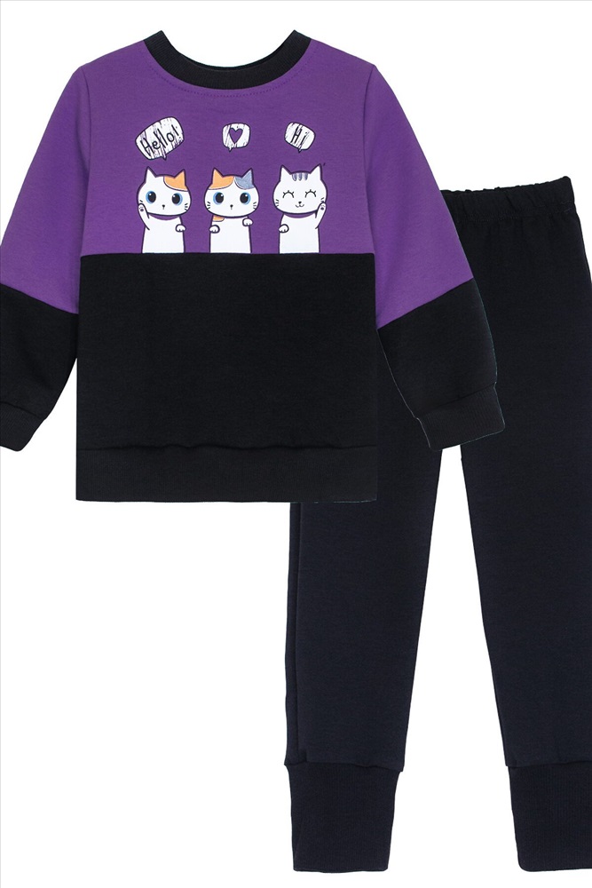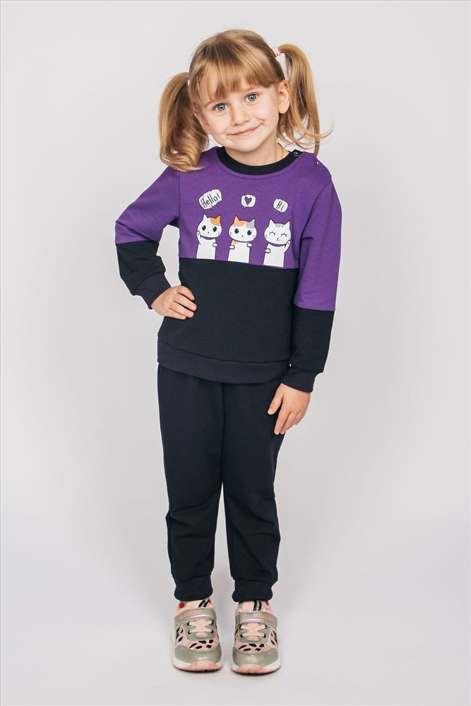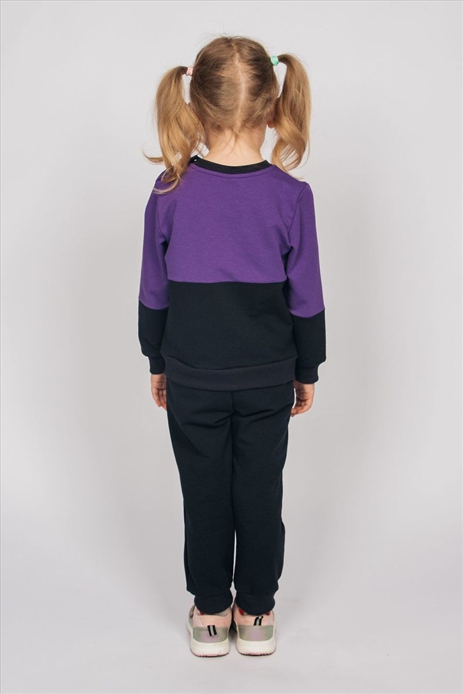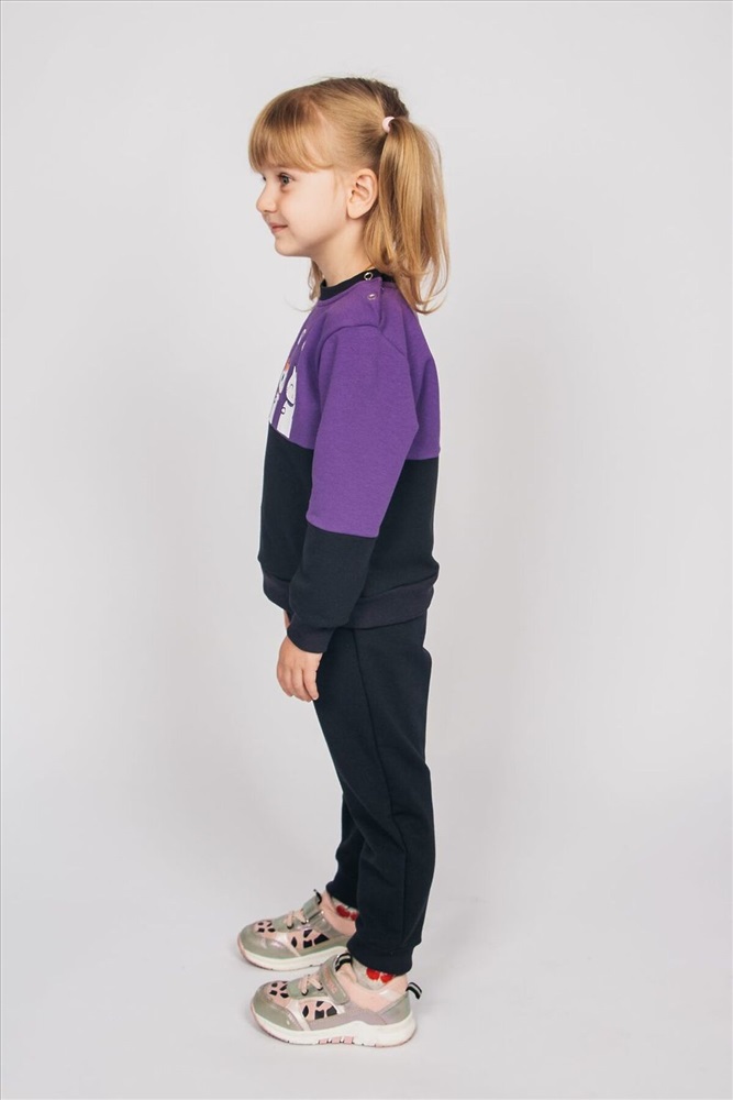 Комплект для девочки: джемпер и брюки из футера. Джемпер прямого силуэта и принтом на груди, состоящим из двух отрезных частей контрастных цветов. Со втачным рукавом и эластичными манжетами. Горловина круглая, обработана воротником из кашкорсе. 1 кнопка на воротнике, 1 по центру плеча. Брюки однотонные и на резинке по низу. Комплект подойдет для прогулок, активного отдыха и путешествий. Стильный комплект для повседневной носки.
