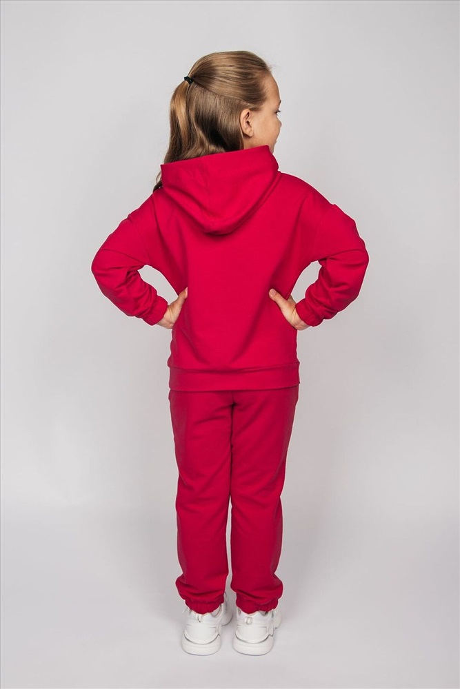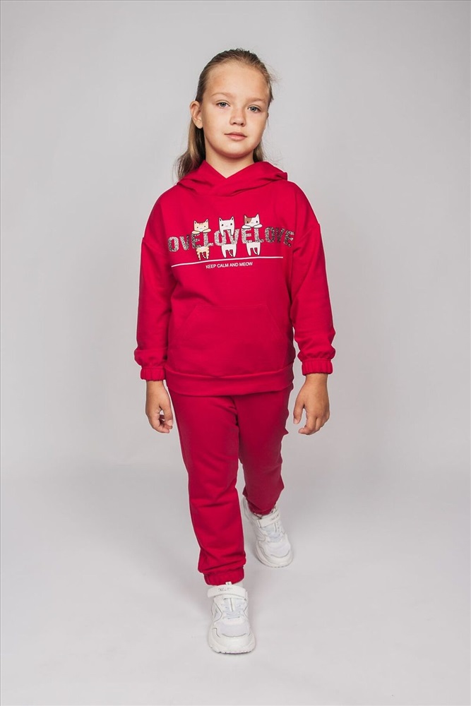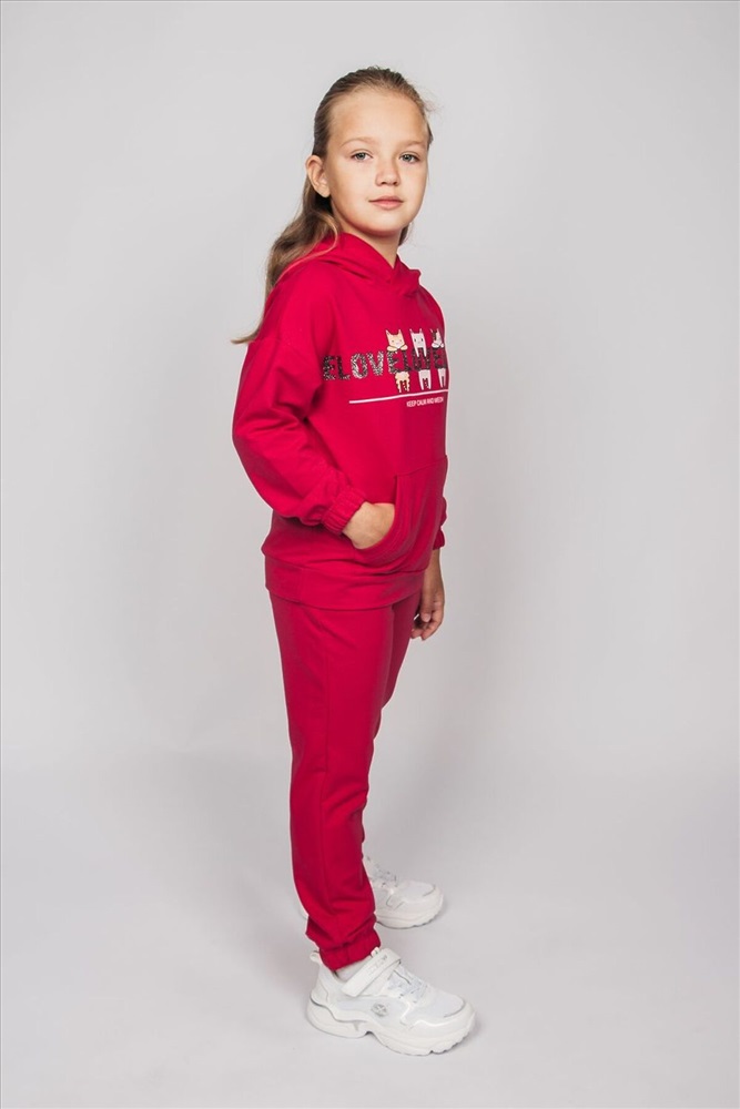 Комплект для девочки: джемпер и брюки из футера. Толстовка прямого силуэта со спущенным длинным рукавом. Горловина круглая, обработана воротником из кашкорсе. На полочке расположен карман кенгуру. Брюки прямого силуэта с карманами и манжетами по низу. Комплект подойдет для прогулок, активного отдыха и путешествий. Стильный комплект для повседневной носки.
