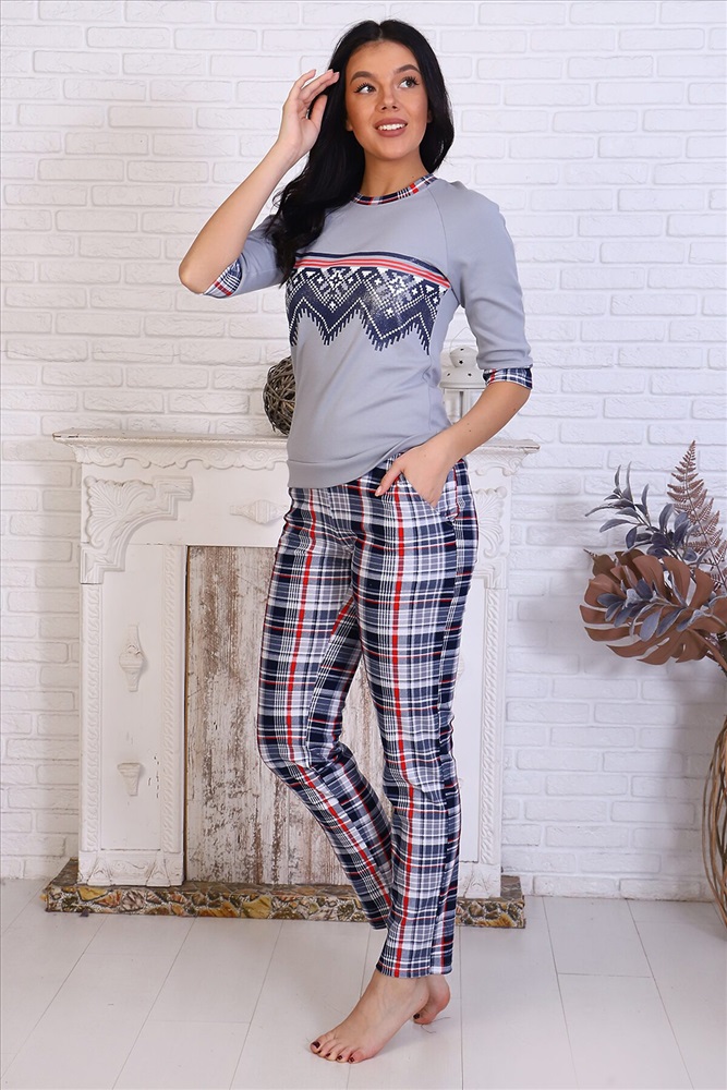 ID товара: 881323 Состав: 100% Хлопок Сезон: Демисезон Длина: Полная Фасон: Полуприлегающий Рукав: До локтя Декоративные элементы: Принт Основная ткань: Интерлок Страна бренда: Россия Страна производства: Россия Костюм женский состоит из кофты и брюк. Кофта прямой силуэт, горловина круглая, рукав - реглан 3\4 с манжетом, низ изделия на поясе, на полочке принт. Брюки прямого кроя, верх на поясе с резинкой, в боковых швах внутренние карманы, низ брюк обработан на плоскошовной машине. Комментарии к товару