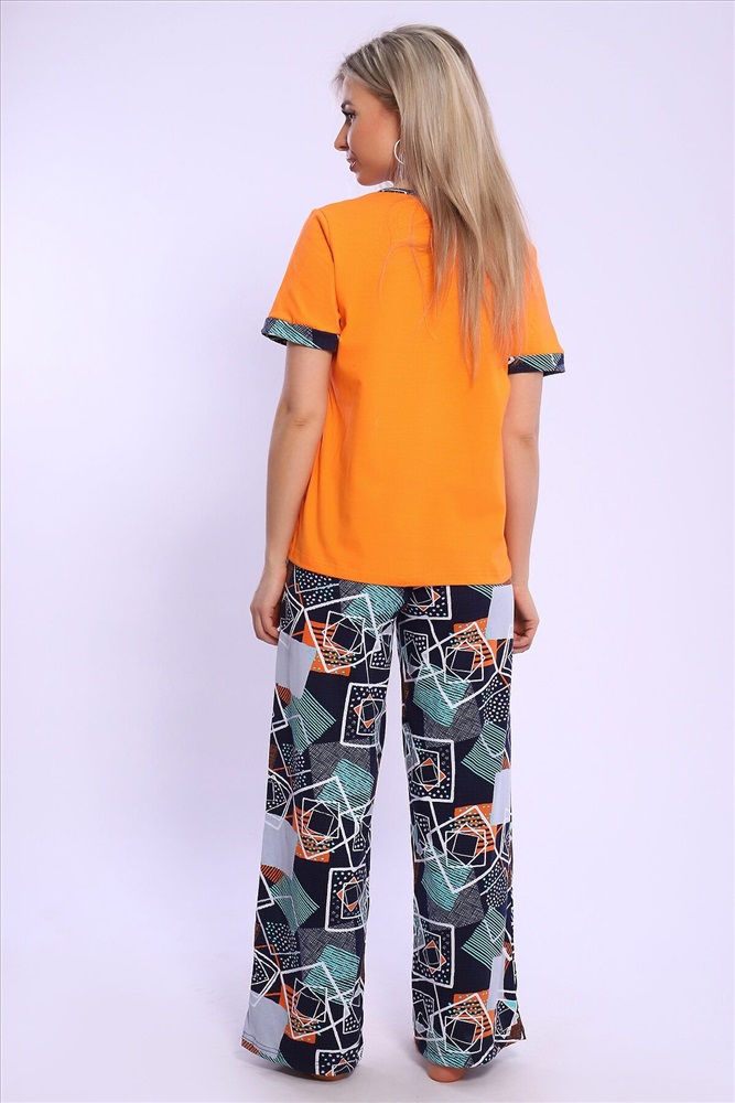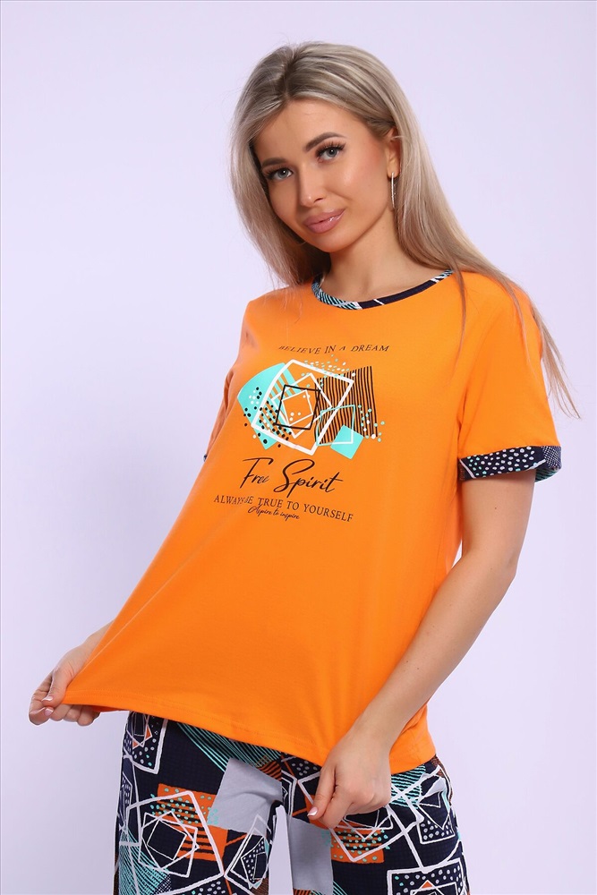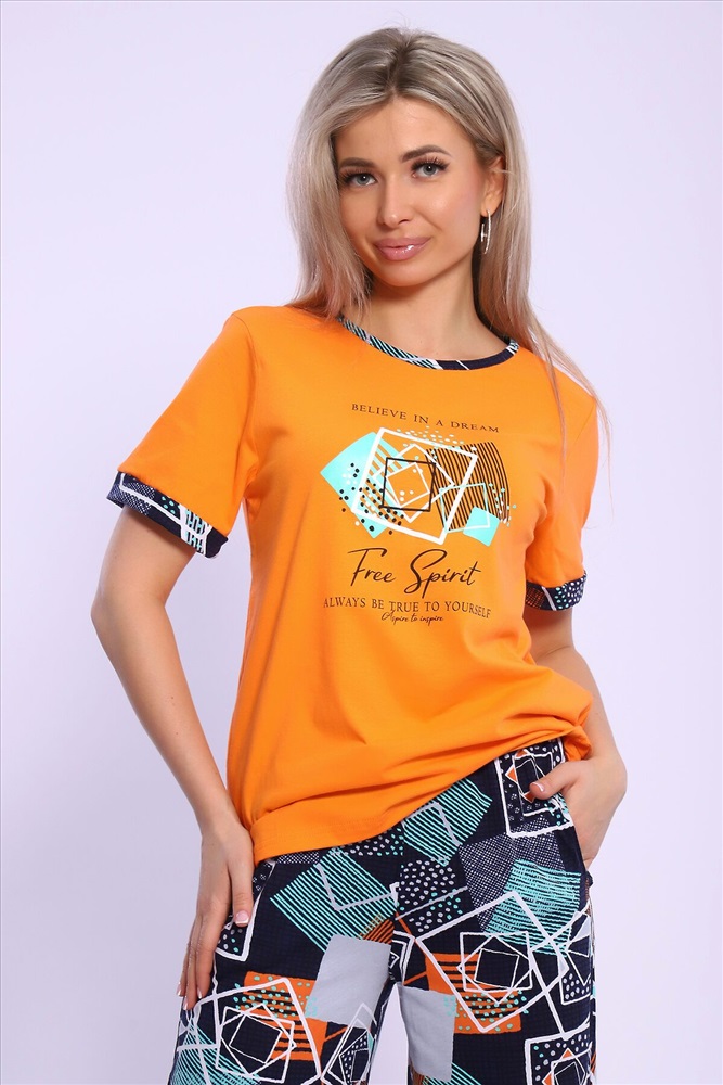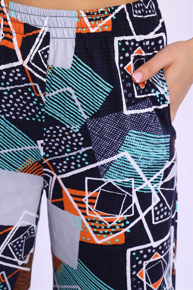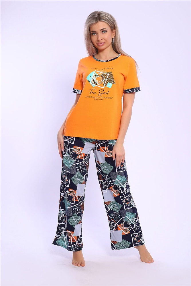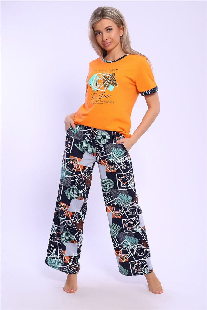 ID товара: 993873 Состав: 100% Хлопок Сезон: Весна/Лето Фасон: Прямой Рукав: Короткие Вид застежки: Завязки Крой брючин: Прямой Рисунок: Фантазийный Вид ткани: Кулирка Страна бренда: Россия Страна производства: Россия Костюм состоит из футболки и брюк. Брюки широкие с карманами. Футболка с короткими рукавами на манжетах и принтом на полочке. Комментарии к товару