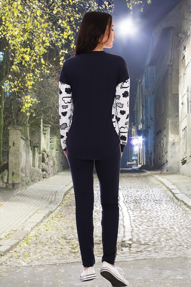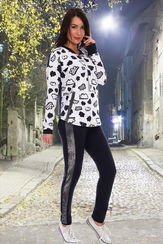 Страна производства: Россия Костюм состоит из куртки на молнии и брюк. Брюки прилегающие, на эластичном поясе, на манжете, с лампасами из отделочного полотна. Куртка прямого силуэта, со спущенным плечом, с фигурной горловиной и линией низа. Рукав длинный, на манжете. На полочке расположен фигурный карман с обтачками из отделочного полотна.