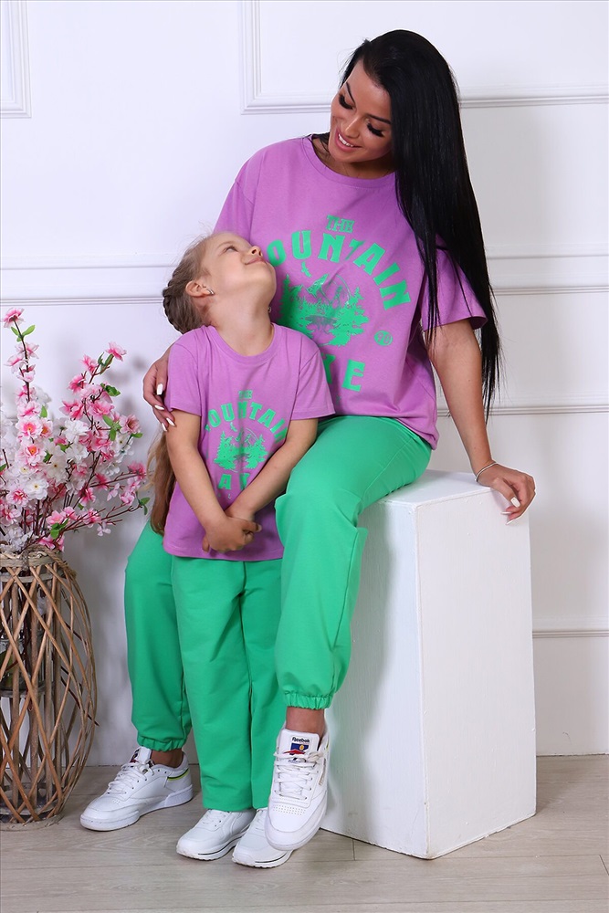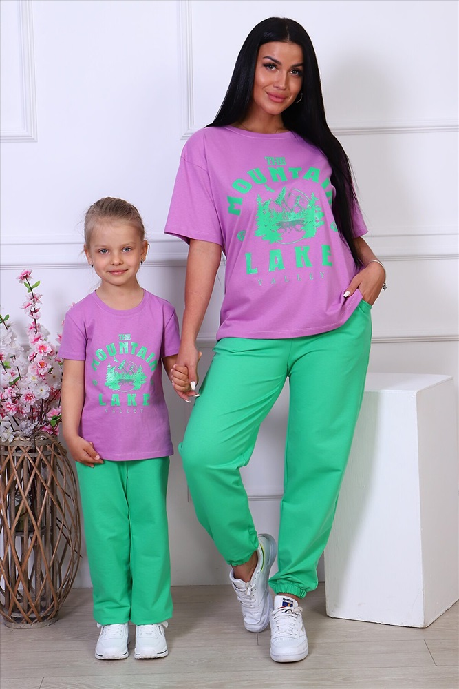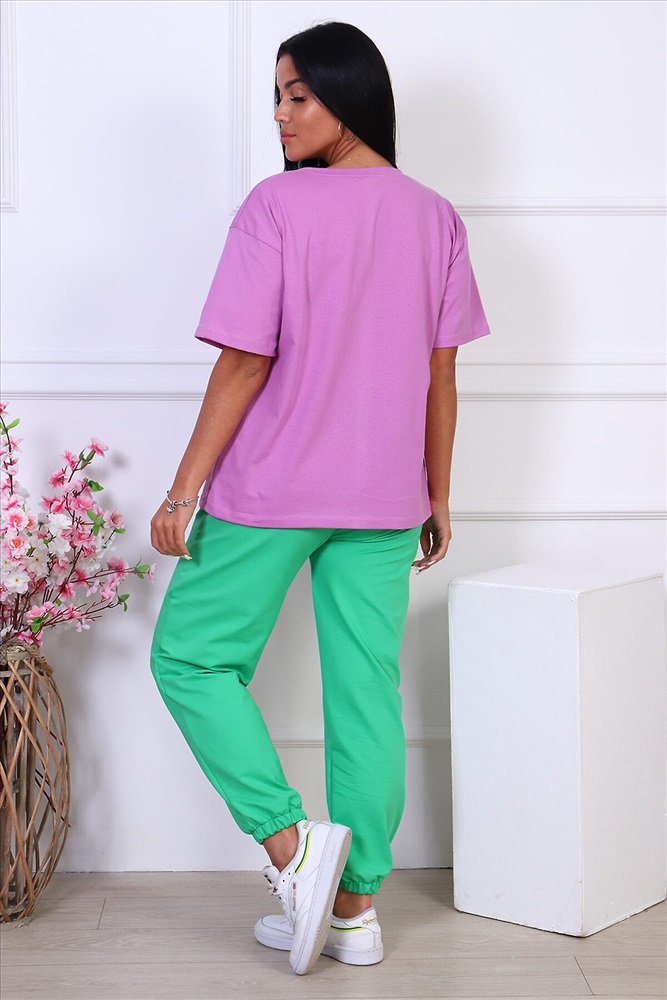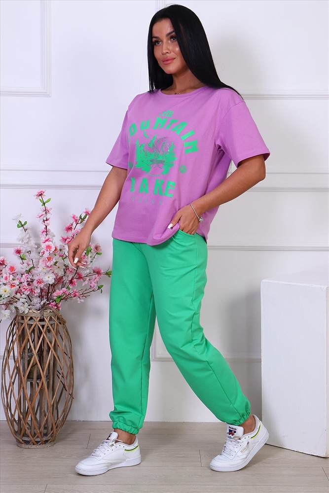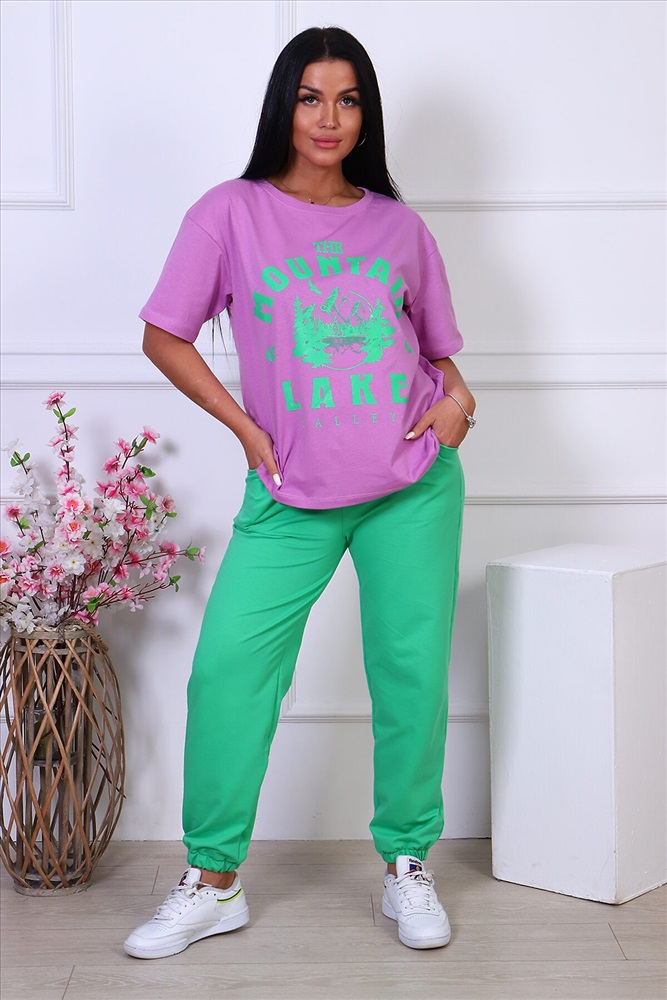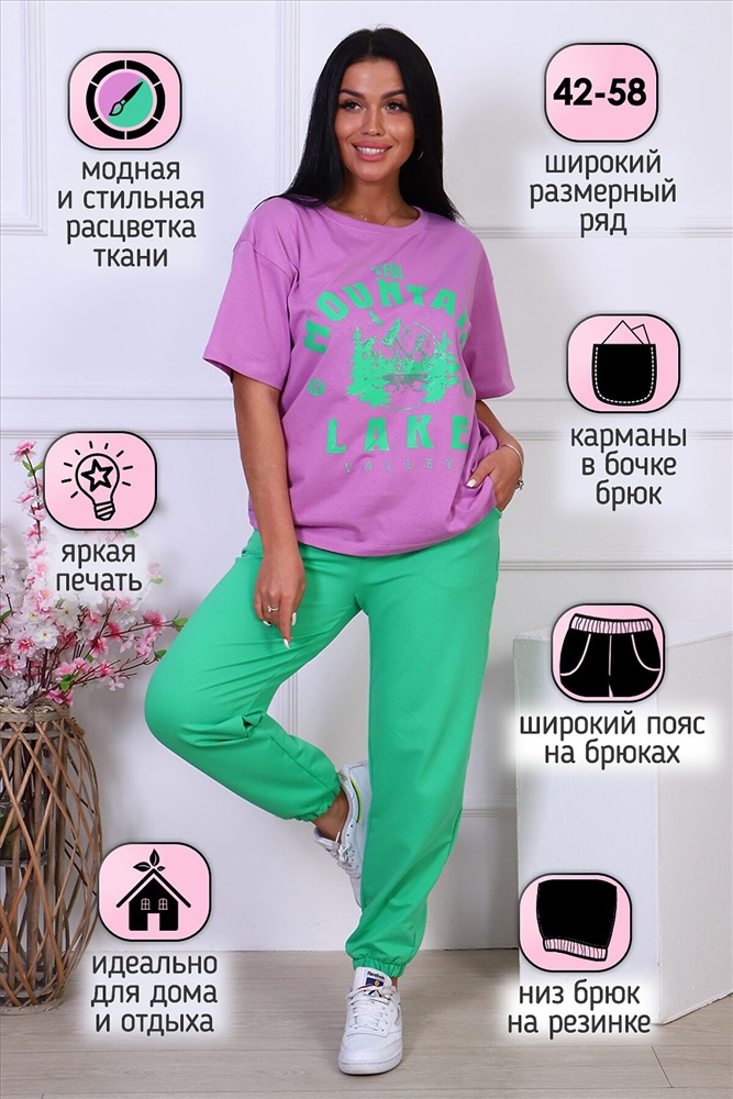 Костюм женский состоит из футболки и брюк. Футболка свободного силуэта со спущенной линией плеча из трикотажного полотна яркого и стильного цвета. На полочке печать. Рукав втачной, короткий. Горловина округлой формы, обработана обтачкой. Низ изделия и рукавов подогнут. Брюки из облегченного футера стильного оттенка, свободного силуэта, с притачным широким поясом. Карман формы хулиган. Низ изделия подогнут с резинкой.