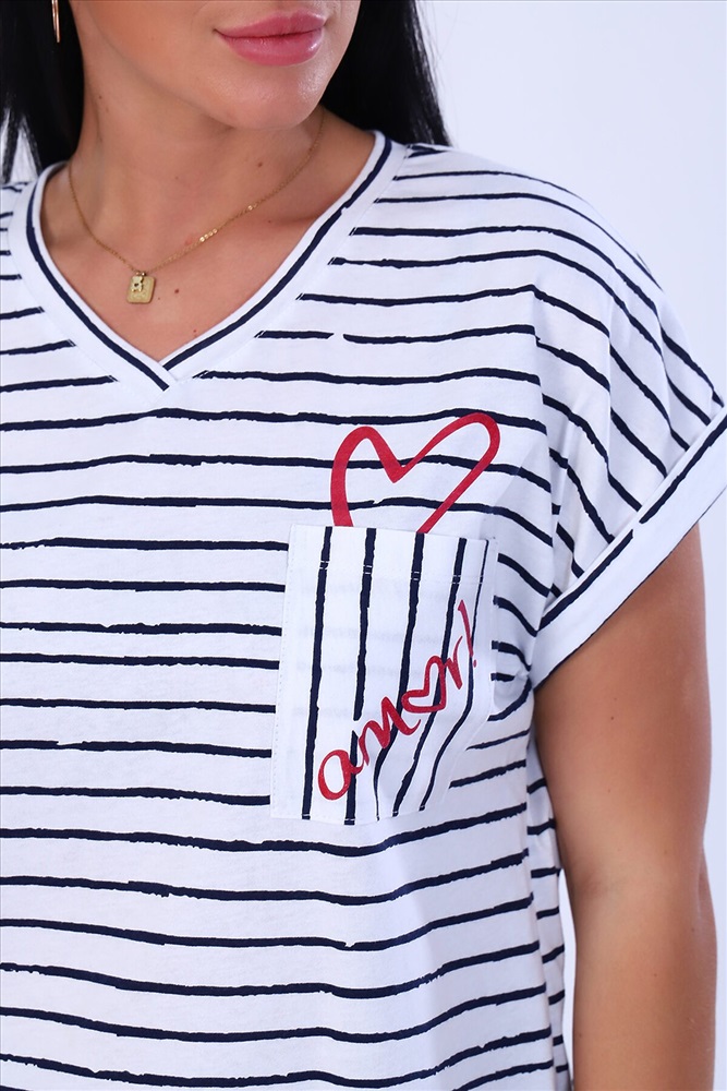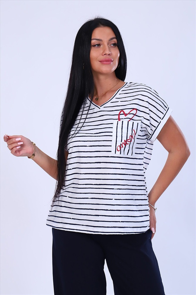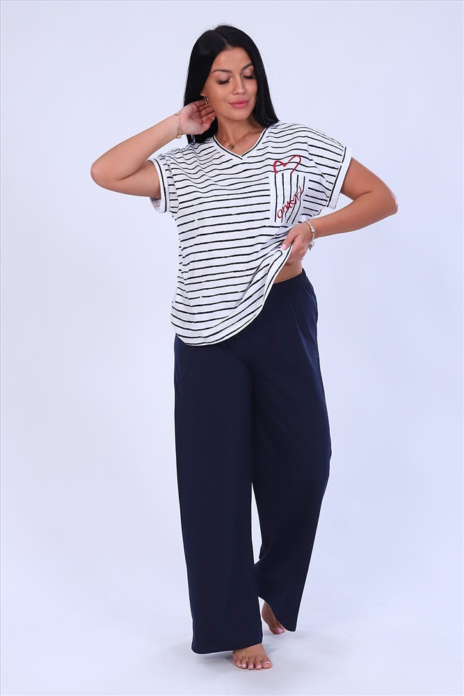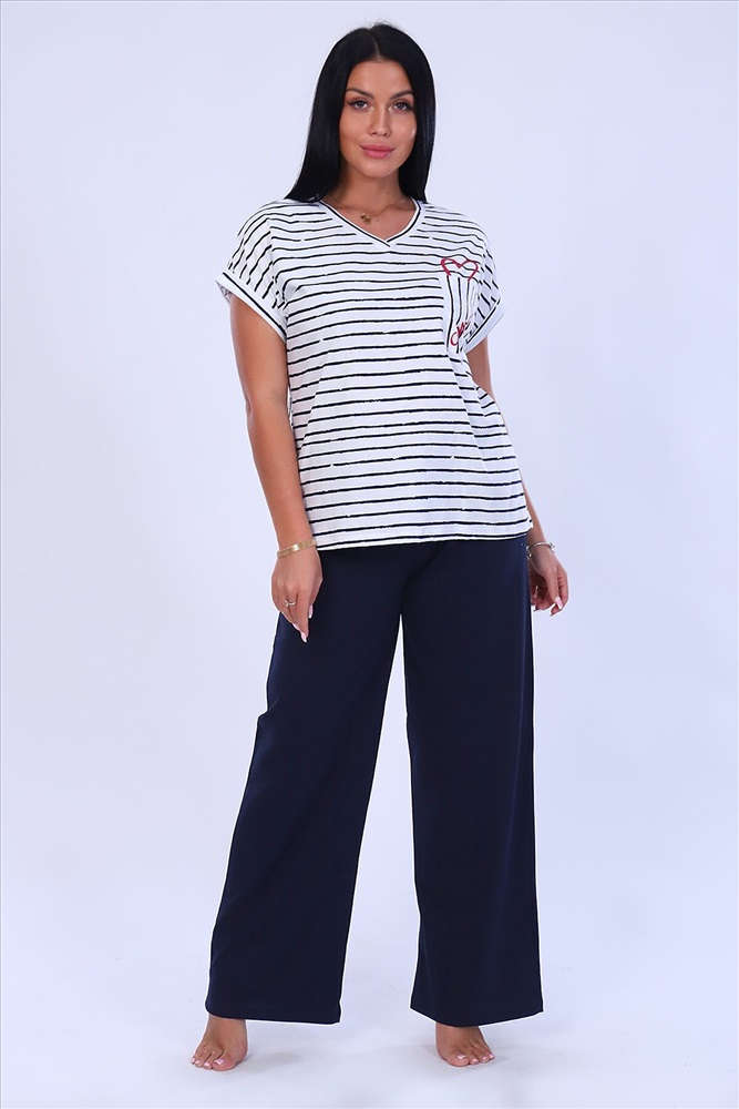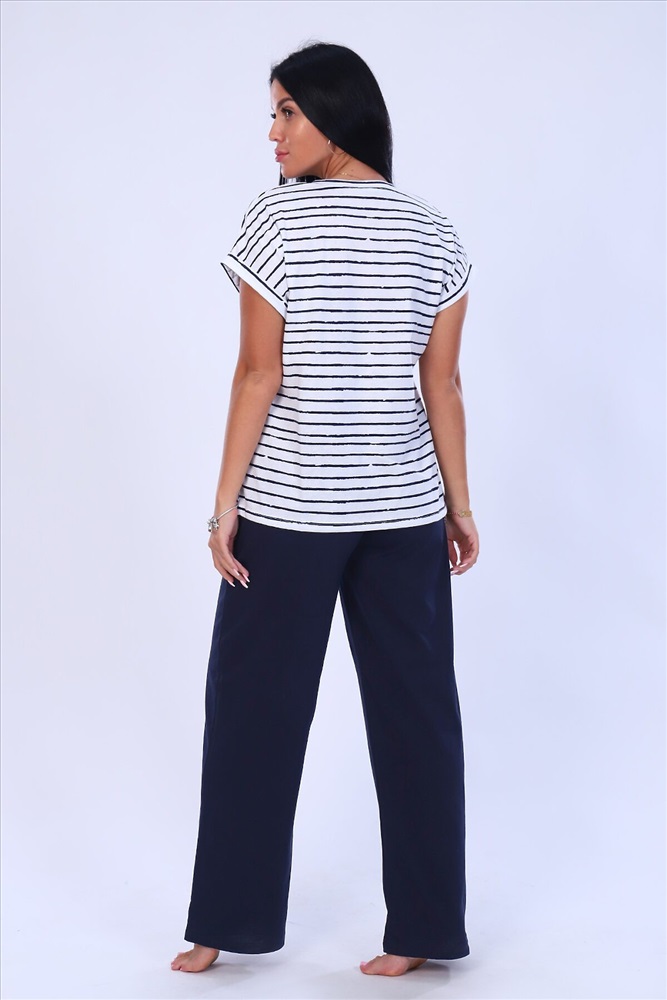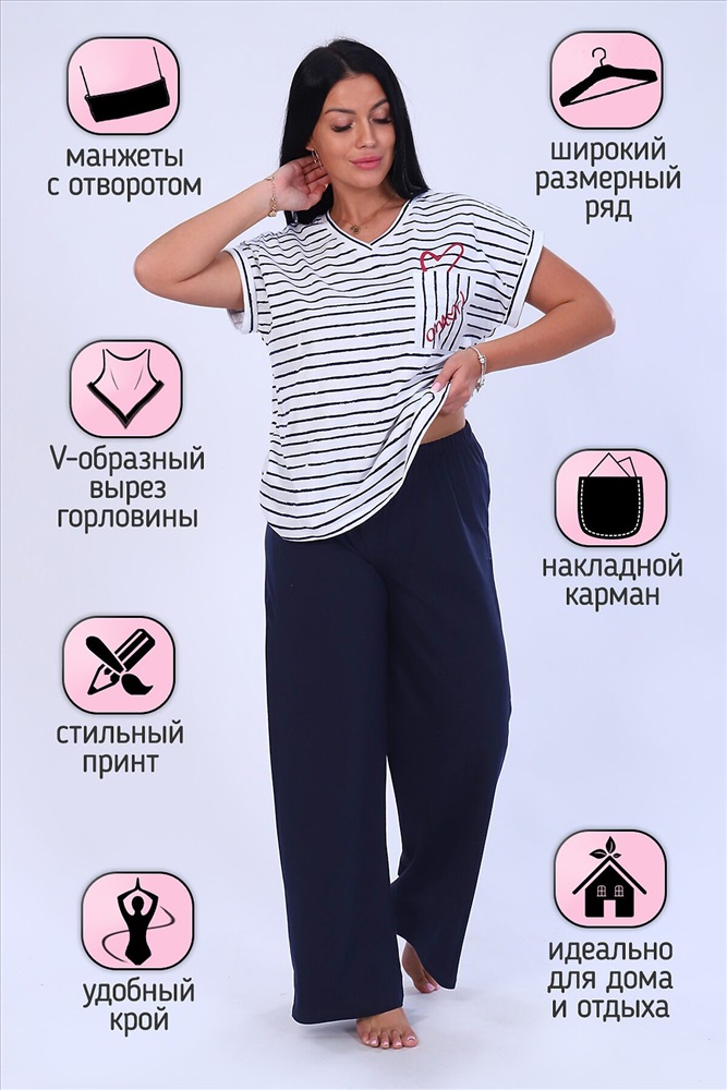 ID товара: 875378 Состав: 100% Хлопок Сезон: Весна/Лето Длина: Полная Фасон: Свободный крой Рукав: короткие Крой брючин: Прямой Рисунок: Полоски Декоративные элементы: Принт Основная ткань: Кулирка Стиль: повседневный Страна бренда: Россия Страна производства: Россия Костюм женский футболка и брюки. Футболка полуприлегающего силуэта, из трикотажного полотна с набивным рисунком. Полочка с принтом и накладным карманом. Горловина V-образной формы, обработана обтачкой. Рукав короткий, цельнокроенный, низ рукава обработан притачной манжетой с отворотом. Брюки из однотонного трикотажного полотна, свободного силуэта, с цельнокроенным поясом на резинке. Низ изделия подогнут. Комментарии к товару