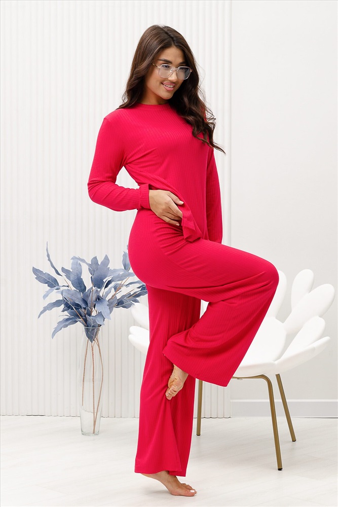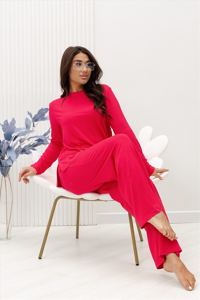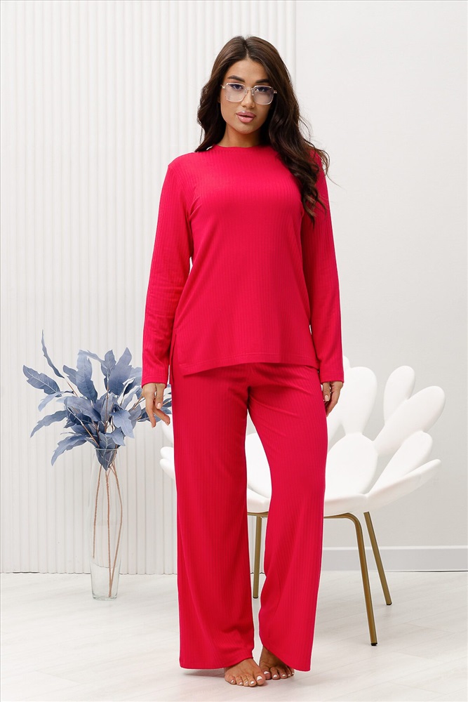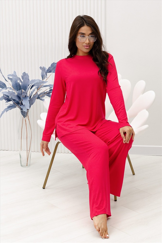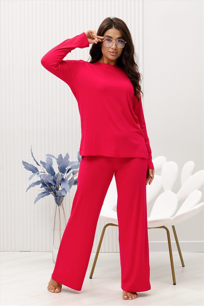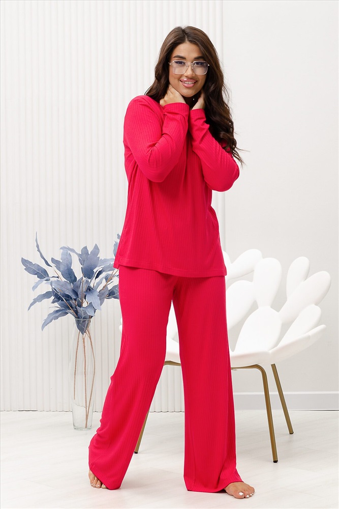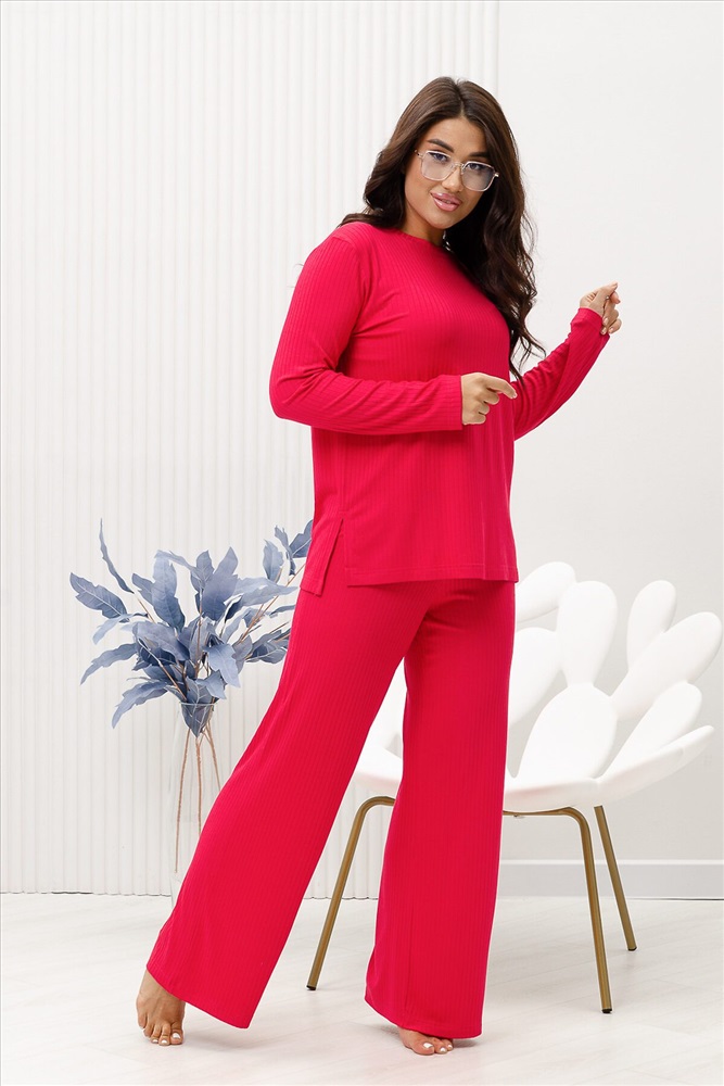 Красивый, стильный, уютный домашний костюм состоящий из брюк и кофты с длинным рукавом (лонгслив). Брюки свободные, широкие. Цельнокроеный пояс брюк с комфортной широкой резинкой имеет аккуратный вид за счёт обработки на многоигольной поясной машине. Лонгслив свободного кроя с разрезами по бокам (спинка длиннее переда) имеет полноценный длинный рукав, округлую горловину обработанную планкой и отстрочкой. Комплект выполнен из вискозного полотна с плетением в рубчик, так называемым лапша, которая остаётся в тренде уже не первый сезон. Вискоза универсальный материал - легко пропускает воздух, дышит, благодаря этому свойству, в изделиях из вискозы комфортно и в холодное время года, и в тёплое. Ткань отличается мягкостью и лёгкостью, вещи из неё нежные и приятные на ощупь и внешне привлекательны. Добавление лайкры прибавляет эластичности, поэтому материал хорошо тянется. Благодаря особенностям материала создаётся лёгкий струящийся образ. В таком ансамбле можно принимать внезапно пришедших гостей. Универсальный фасон, создающий модный образ, подойдёт как молодым девушкам, так и дамам солидного возраста.
