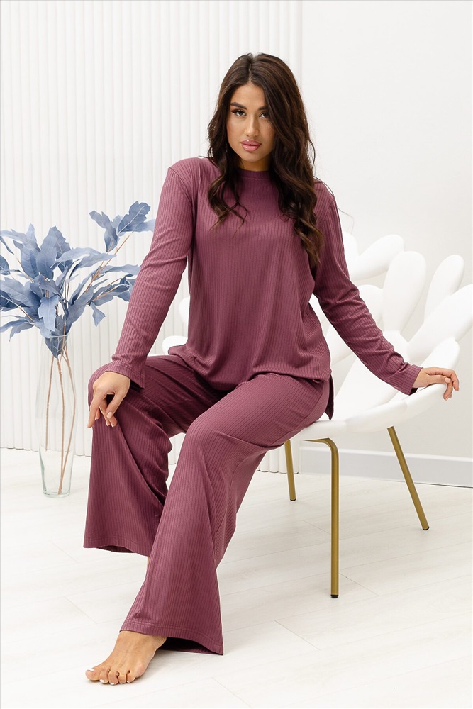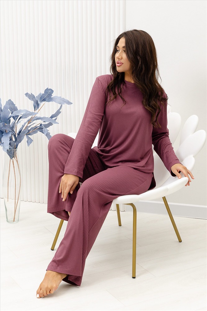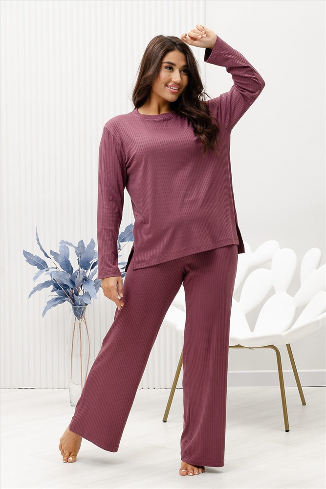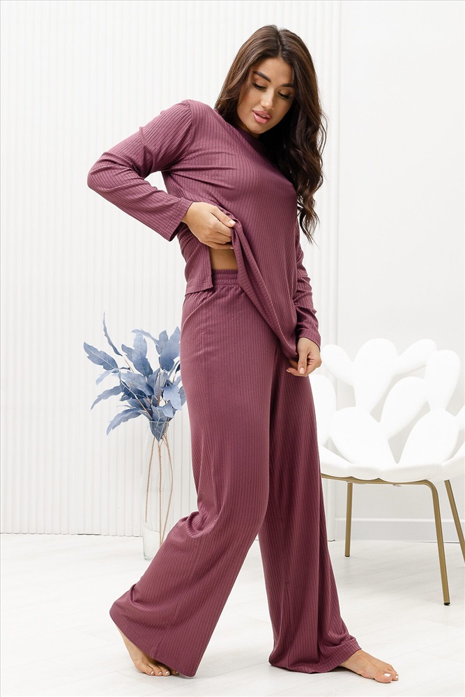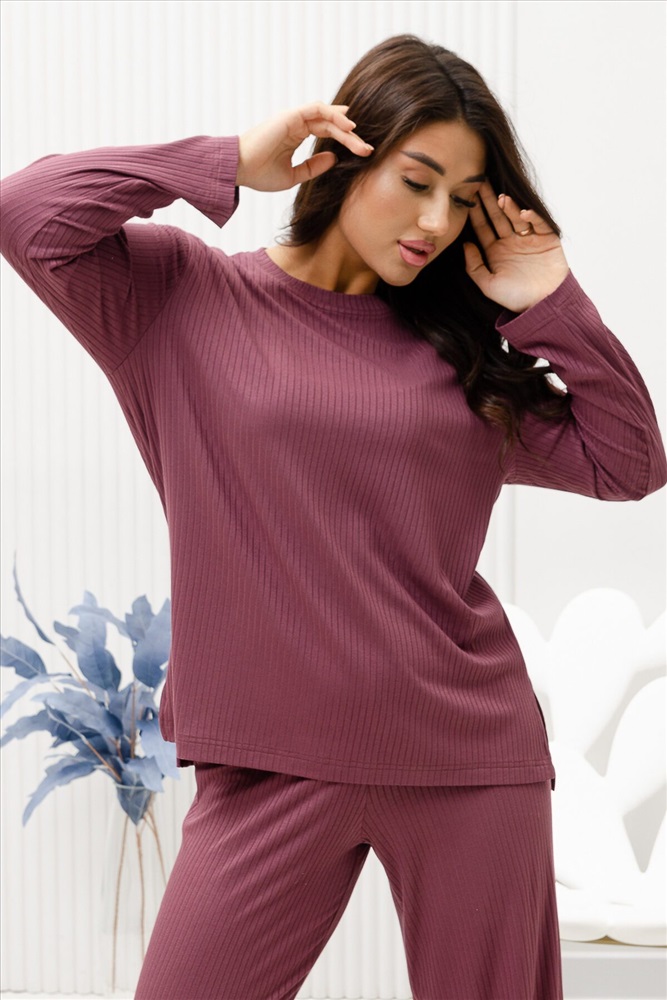 Красивый, стильный, уютный домашний костюм состоящий из брюк и кофты с длинным рукавом (лонгслив). Брюки свободные, широкие. Цельнокроеный пояс брюк с комфортной широкой резинкой имеет аккуратный вид за счёт обработки на многоигольной поясной машине. Лонгслив свободного кроя с разрезами по бокам (спинка длиннее переда) имеет полноценный длинный рукав, округлую горловину обработанную планкой и отстрочкой. Комплект выполнен из вискозного полотна с плетением в рубчик, так называемым лапша, которая остаётся в тренде уже не первый сезон. Вискоза универсальный материал - легко пропускает воздух, дышит, благодаря этому свойству, в изделиях из вискозы комфортно и в холодное время года, и в тёплое. Ткань отличается мягкостью и лёгкостью, вещи из неё нежные и приятные на ощупь и внешне привлекательны. Добавление лайкры прибавляет эластичности, поэтому материал хорошо тянется. Благодаря особенностям материала создаётся лёгкий струящийся образ. В таком ансамбле можно принимать внезапно пришедших гостей. Универсальный фасон, создающий модный образ, подойдёт как молодым девушкам, так и дамам солидного возраста.
