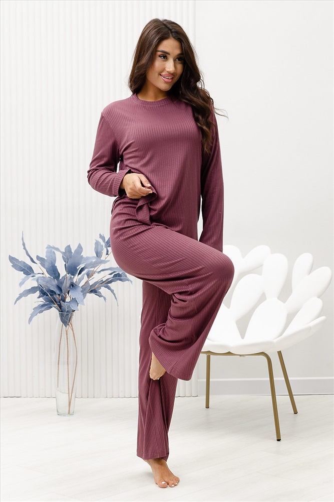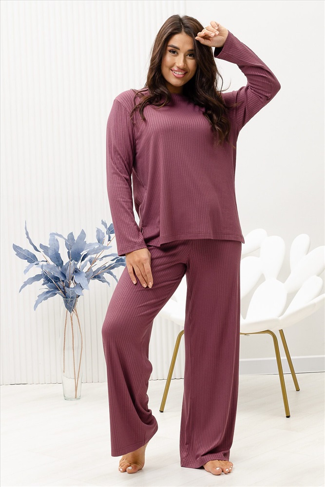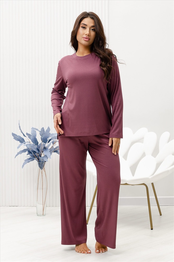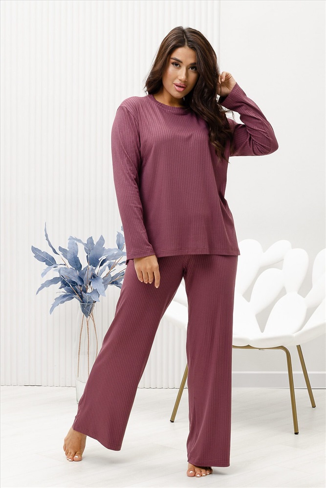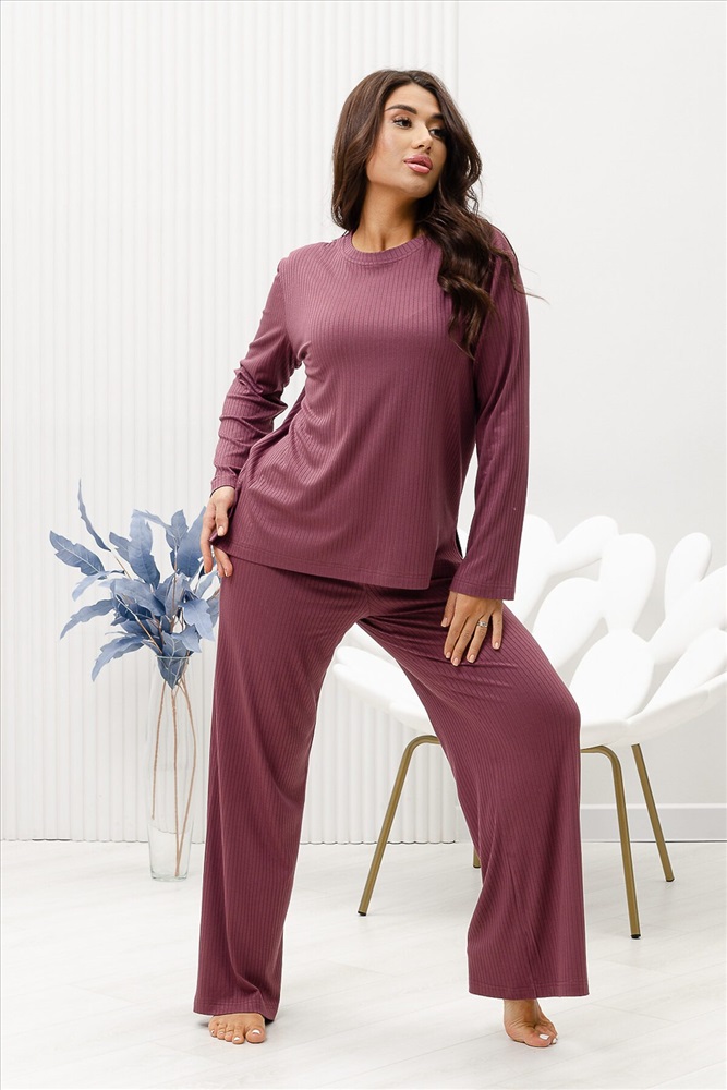 Красивый, стильный, уютный домашний костюм состоящий из брюк и кофты с длинным рукавом (лонгслив). Брюки свободные, широкие. Цельнокроеный пояс брюк с комфортной широкой резинкой имеет аккуратный вид за счёт обработки на многоигольной поясной машине. Лонгслив свободного кроя с разрезами по бокам (спинка длиннее переда) имеет полноценный длинный рукав, округлую горловину обработанную планкой и отстрочкой. Комплект выполнен из вискозного полотна с плетением в рубчик, так называемым лапша, которая остаётся в тренде уже не первый сезон. Вискоза универсальный материал - легко пропускает воздух, дышит, благодаря этому свойству, в изделиях из вискозы комфортно и в холодное время года, и в тёплое. Ткань отличается мягкостью и лёгкостью, вещи из неё нежные и приятные на ощупь и внешне привлекательны. Добавление лайкры прибавляет эластичности, поэтому материал хорошо тянется. Благодаря особенностям материала создаётся лёгкий струящийся образ. В таком ансамбле можно принимать внезапно пришедших гостей. Универсальный фасон, создающий модный образ, подойдёт как молодым девушкам, так и дамам солидного возраста.