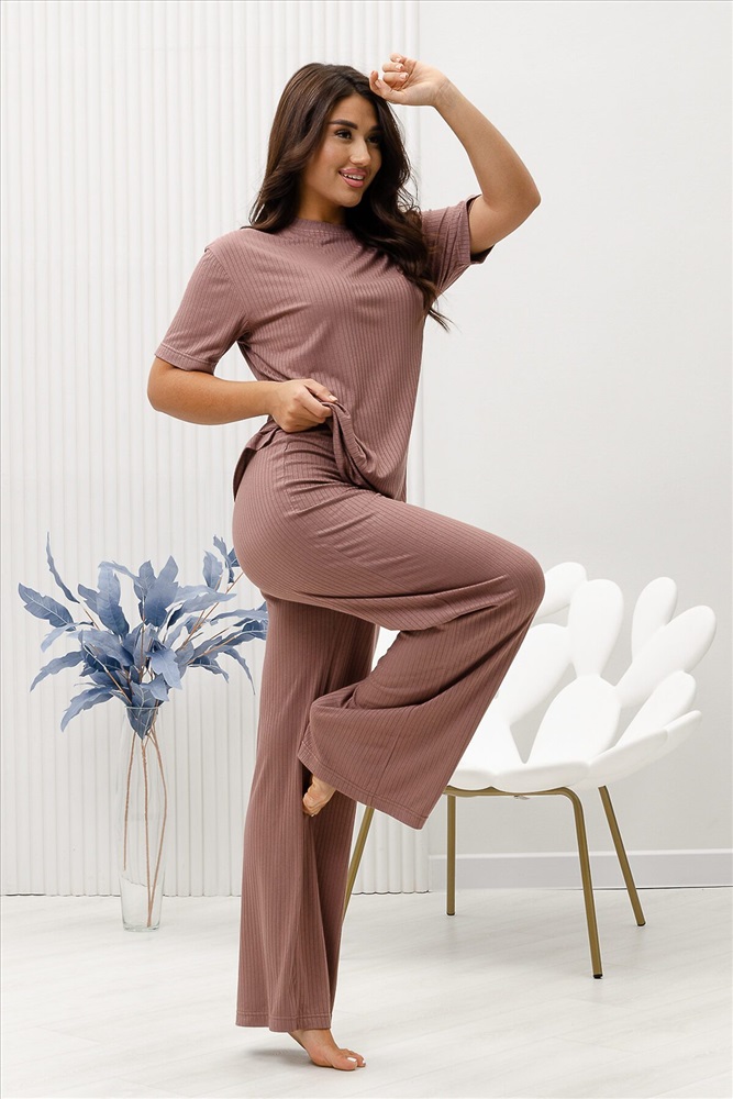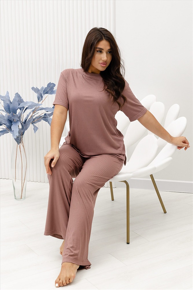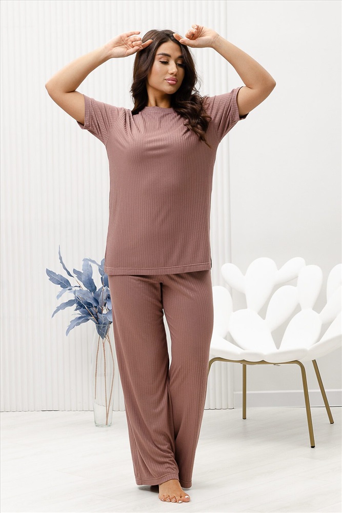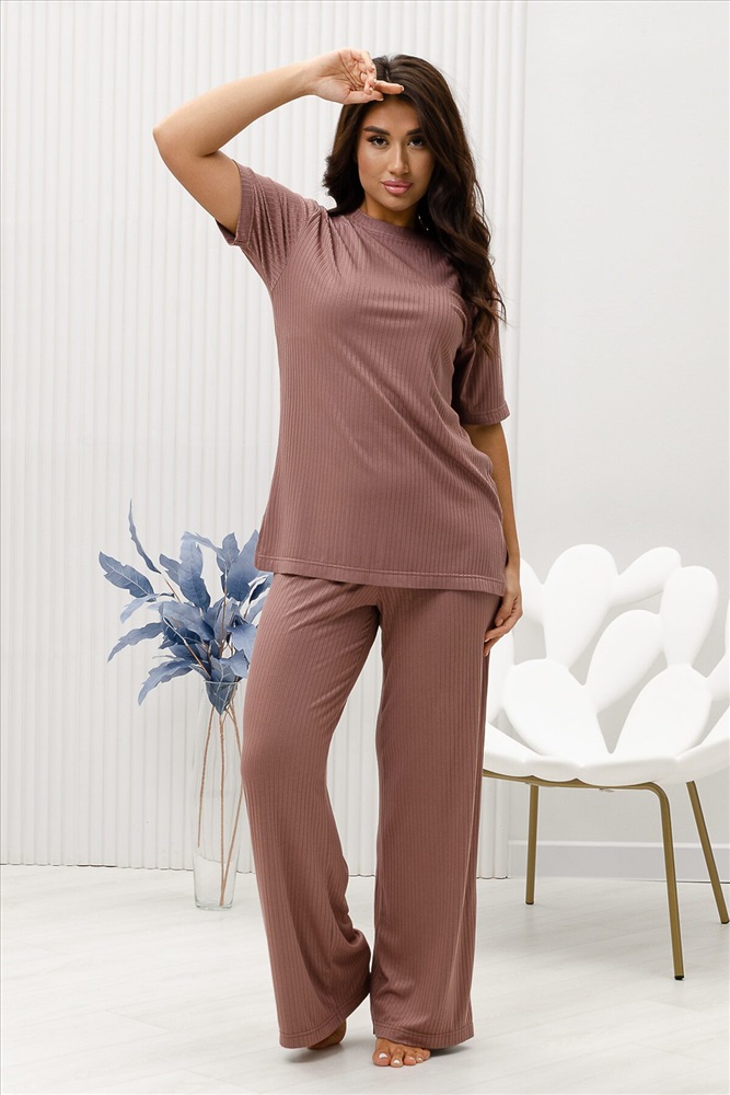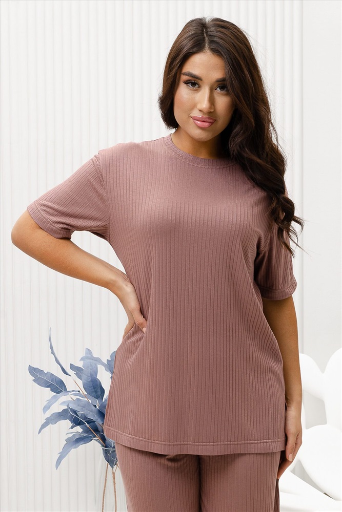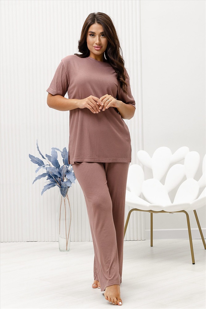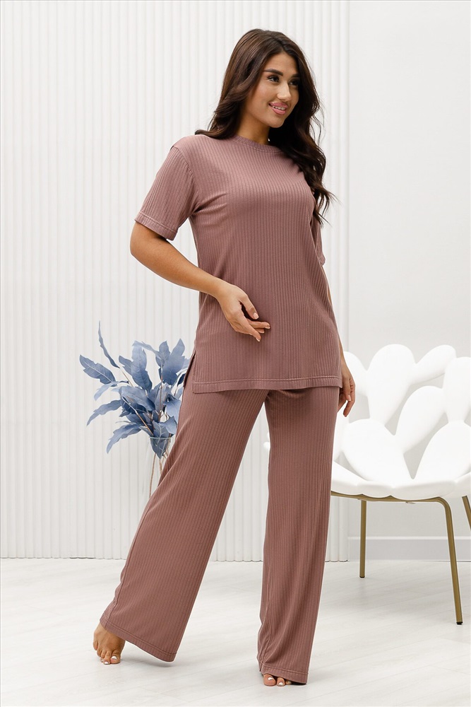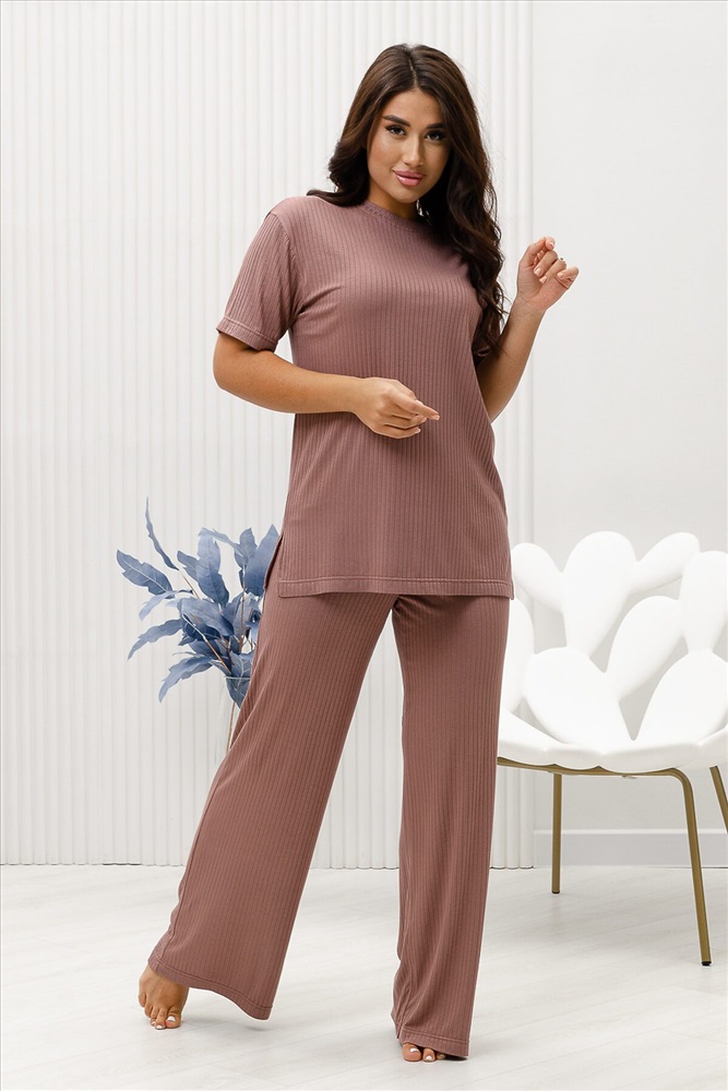 Красивый, стильный, уютный домашний костюм состоящий из брюк и удлинённой футболки. Брюки свободные, широкие. Цельнокроеный пояс брюк с комфортной широкой резинкой имеет аккуратный вид за счёт обработки на специальной поясной машине. Футболка свободного кроя с разрезами по бокам со спущенной проймой; округлая горловина обработана планкой и отстрочена. Комплект выполнен из вискозного полотна с плетением в рубчик, так называемым лапша, которая остаётся в тренде уже не первый сезон. Вискоза универсальный материал - легко пропускает воздух, дышит, благодаря этому свойству, в изделиях из вискозы комфортно и в холодное время года, и в тёплое. Ткань отличается мягкостью и лёгкостью, вещи из неё нежные и приятные на ощупь и внешне привлекательны. Добавление лайкры прибавляет эластичности, поэтому материал хорошо тянется. Благодаря особенностям материала создаётся лёгкий струящийся образ. В таком ансамбле можно принимать внезапно пришедших гостей, проводить свободное время, летом ходить на прогулки. Универсальный фасон, создающий модный образ, подойдёт как молодым девушкам, так и дамам солидного возраста.