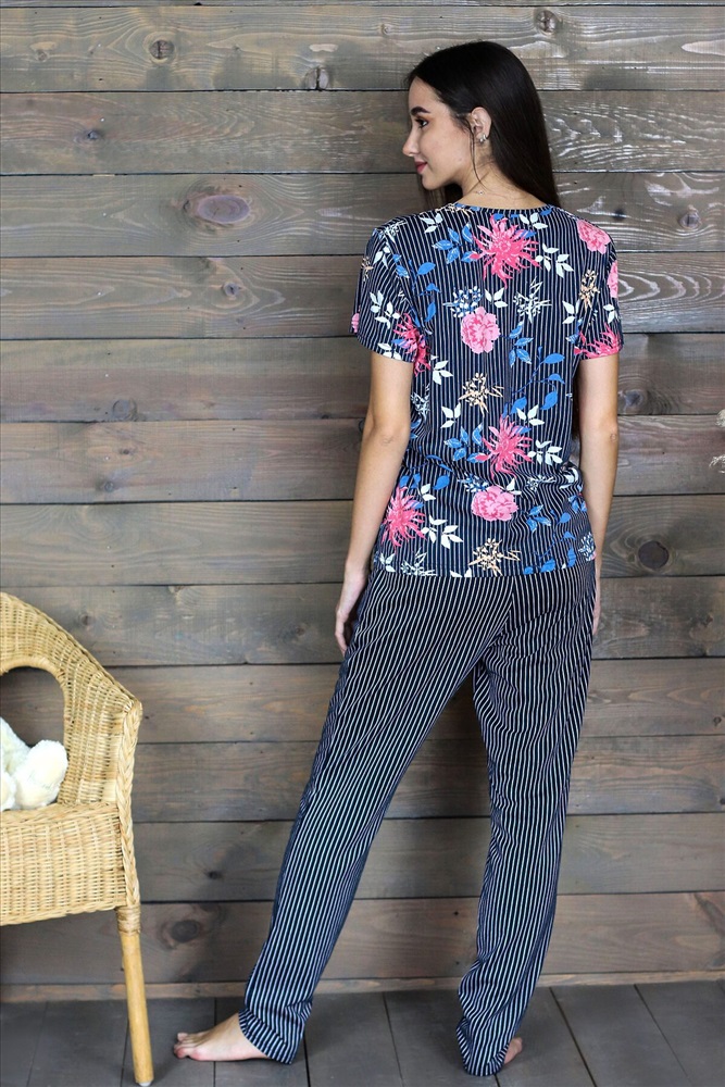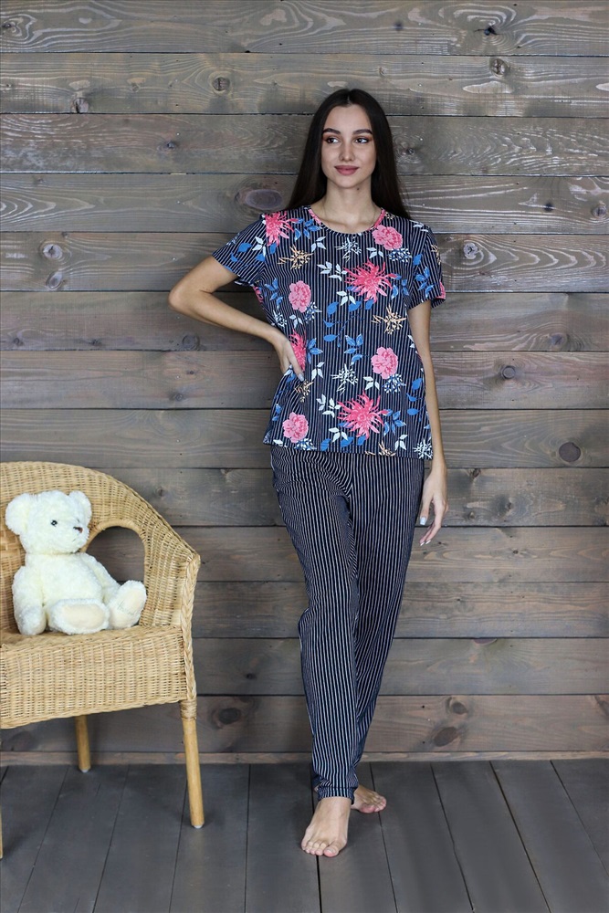 ID товара: 880917 Состав: 100% Хлопок Сезон: Демисезон Длина: Полная Фасон: Полуприлегающий Рукав: короткие Декоративные элементы: Принт Основная ткань: Кулирка Страна бренда: Россия Страна производства: Россия Костюм женский с брюками. Футболка свободного силуэта, с втачным коротким рукавом. Горловина округлой формы. Низ изделия подогнут. Брюки свободного силуэта, с притачным поясом и карманами. Низ изделия подогнут. Комментарии к товару