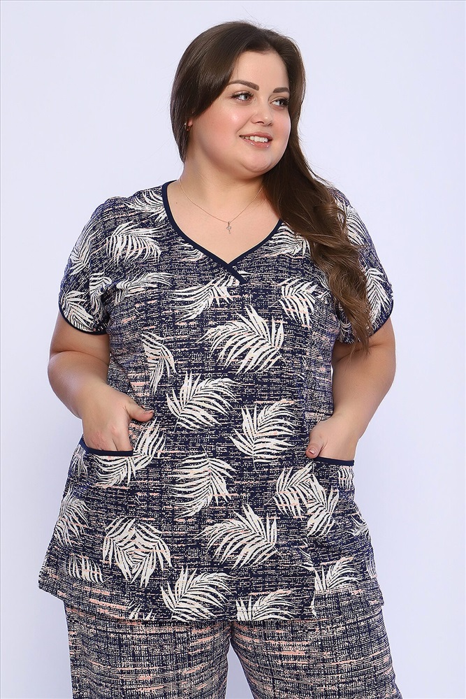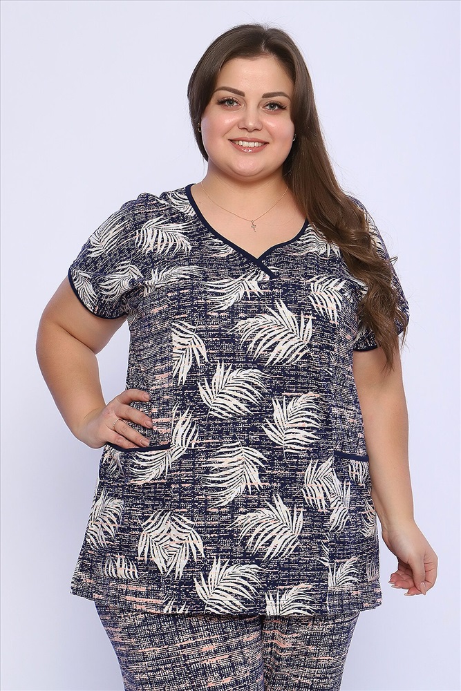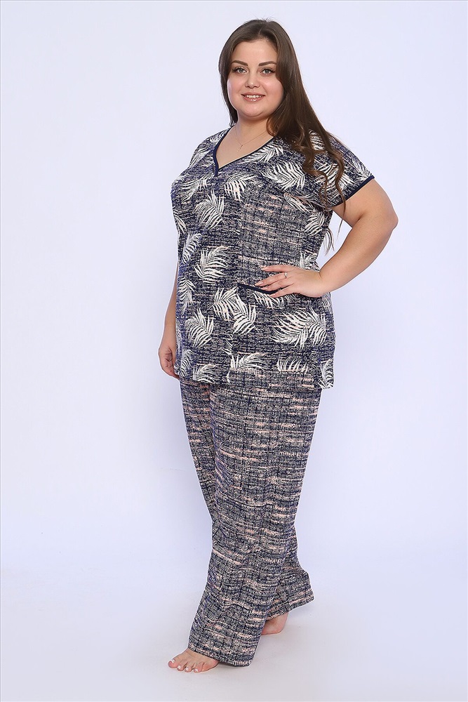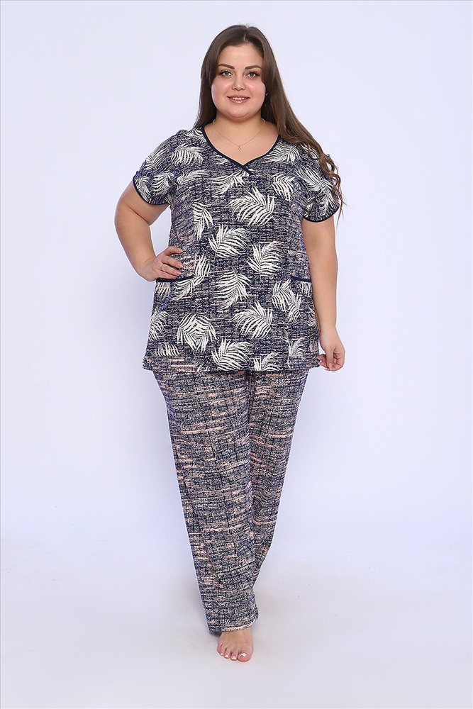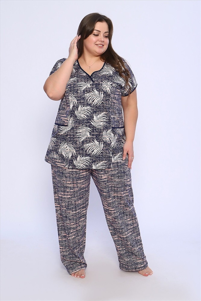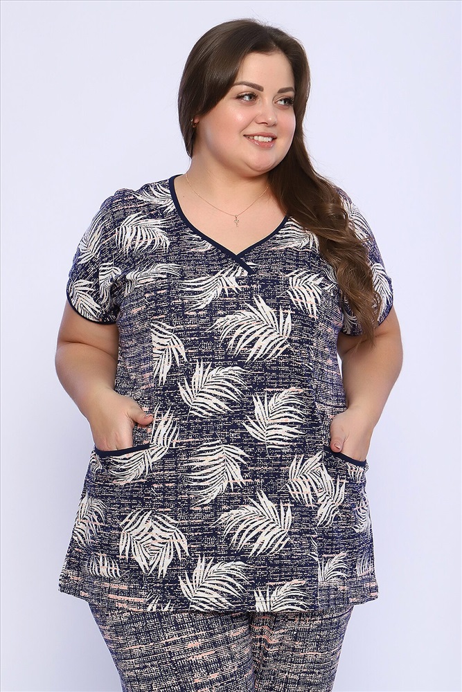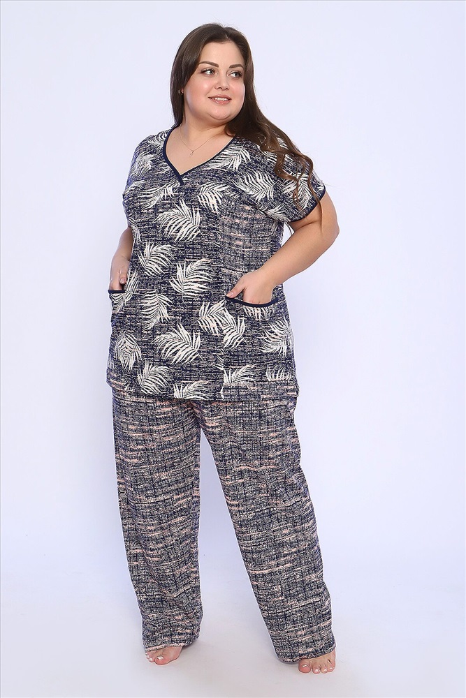 Страна производства: Россия Костюм состоит из блузки и брюк. Брюки полной длины с притачной резинкой, низ изделия обработан швом в подгибку. Блузка со спущенной проймой, по бокам два функциональных кармана.