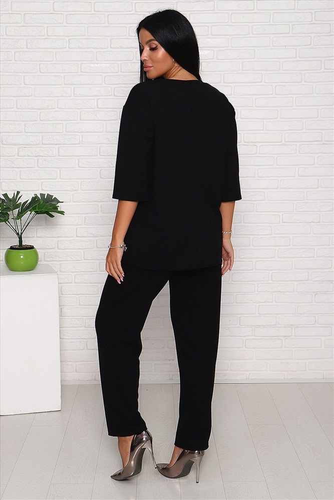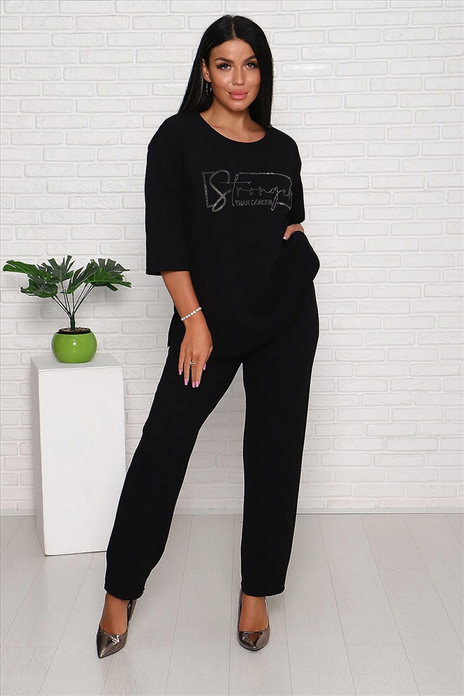 Модель свободного силуэта, на передней части верха стильный принт из страз. Костюм изготовлен из трикотажной комфортной ткани креп, она приятна к телу и на ощупь,не мнётся. Смотрится костюм стильно и современно, подойдёт и для повседневной носки , уместен и для торжества. Длина рукава в замерах указана от начала горловины