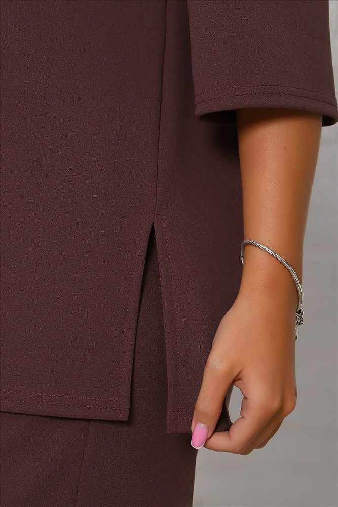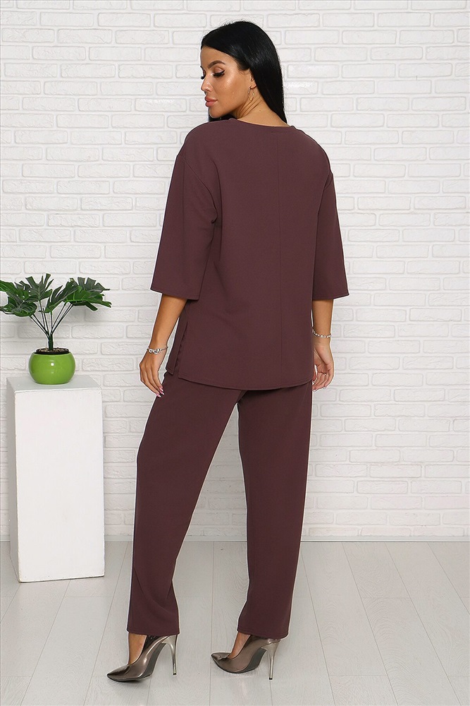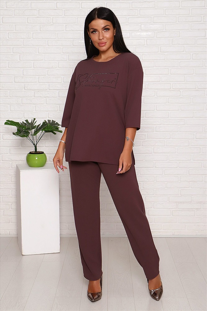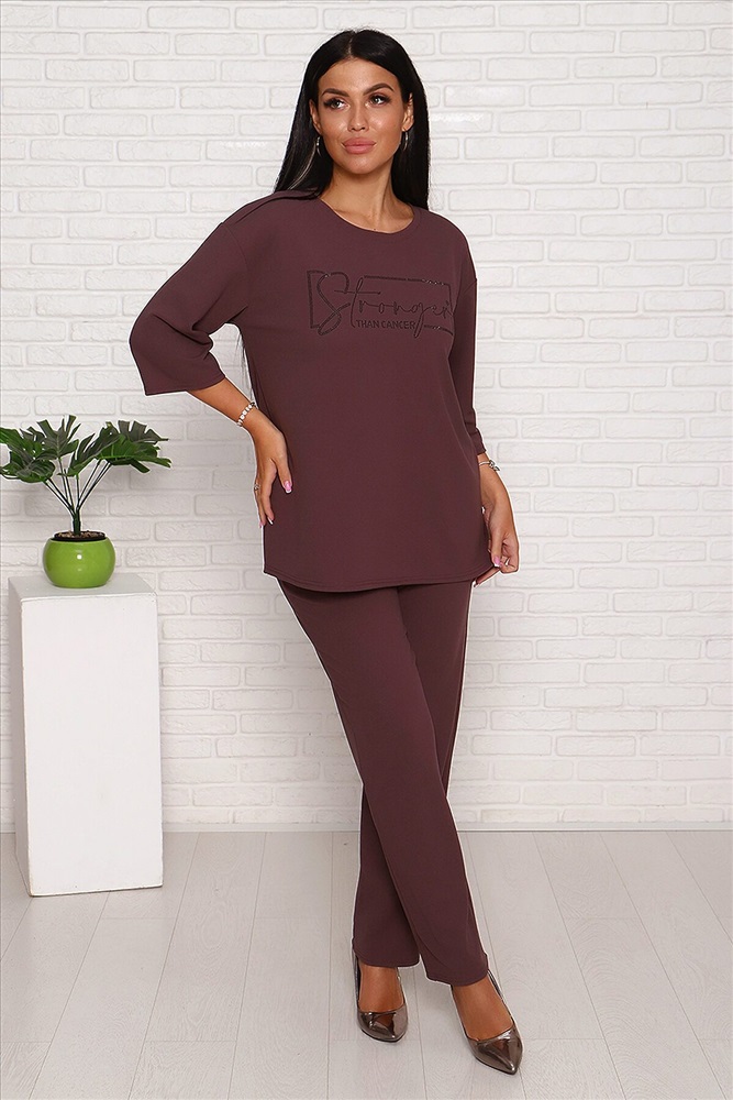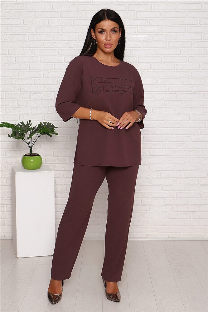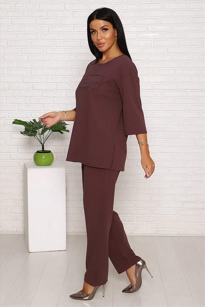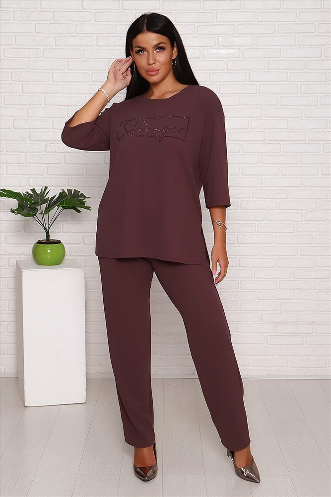 Модель свободного силуэта, на передней части верха стильный принт из страз. Костюм изготовлен из трикотажной комфортной ткани креп, она приятна к телу и на ощупь,не мнётся. Смотрится костюм стильно и современно, подойдёт и для повседневной носки , уместен и для торжества. Длина рукава в замерах указана от начала горловины