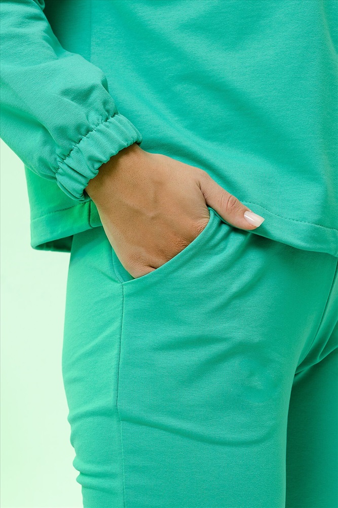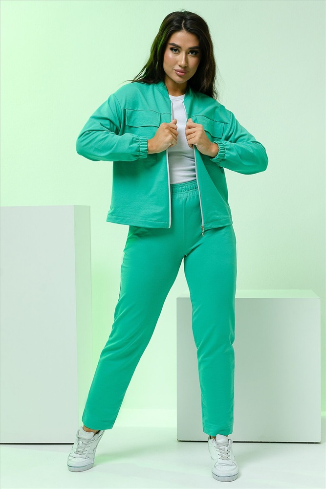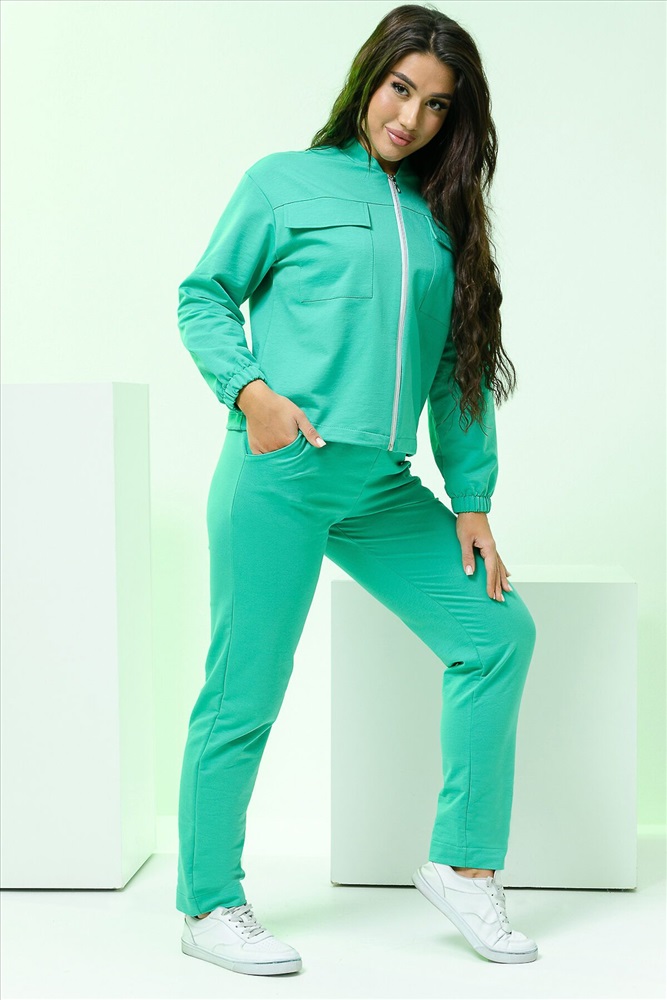 Страна производства: Россия Костюм женский из футера двух нитки. Костюм состоит из курточки и брюк. Брюки с боковыми карманами и на притачном поясе. Курточка с длинным рукавом . Полочка застегивается на молнию. На полочке расположена кокетка и накладные карманы с клапанами. Низ изделия фиксируется резинкой. Низ рукавов на резинке.