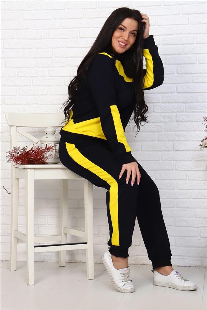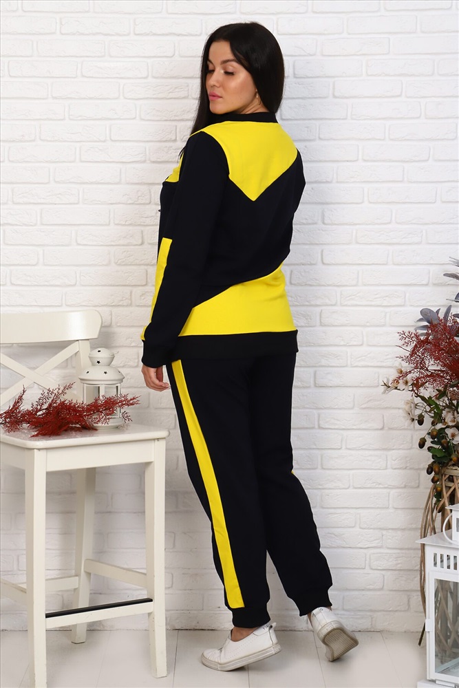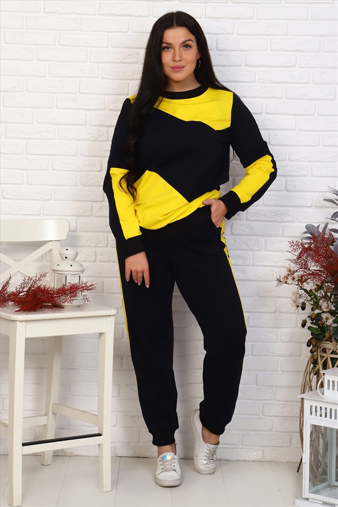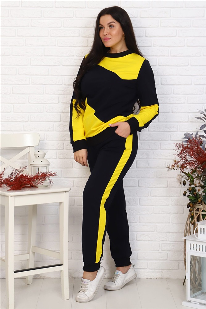 Страна производства: Россия Женский комплект спортивного костюма. Свитшот, полочка и спинка доходят до линии бедер. В верхней и нижней частях полочки и спинки располагаются фигурные вставки контрастного цвета. Горловина обработана обтачкой в цвет основного материала, низ - поясом из рибаны. Рукава рубашечного покроя длиной до запястья, со вставками из ткани отделки, с манжетами из рибаны в цвет основного материала. Брюки спортивные прямые. Нижний срез обработан манжетами из рибаны. По боковым швам лампасы из ткани контрастного цвета шириной 4 см. Верхний срез обработан притачным поясом с эластичной тесьмой шириной 3 см и шнуром. Имеются боковые карманы на передних половинках.