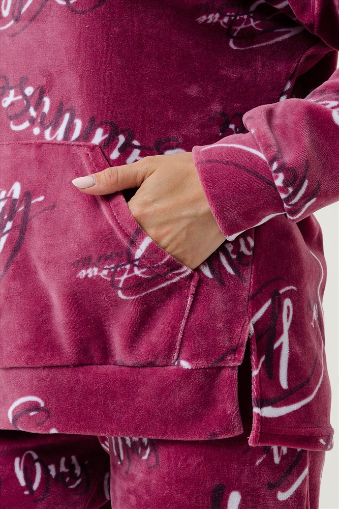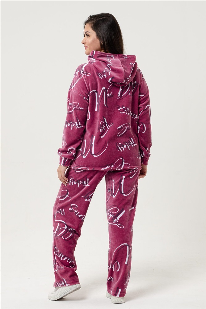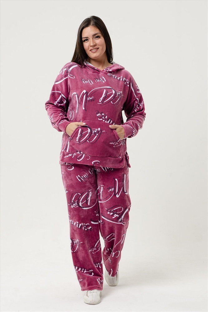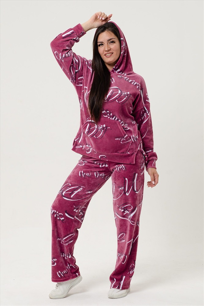 Костюм женский с брюками, толстовка с капюшоном, карманом-кенгуру. Боковой шов плавна переходит на перед, внизу которого небольшие разрезы. На передней половинке внизу пояс. Длинный рукав с манжетом. Брюки-трубы с удобной посадкой. Костюм уютный, теплый для дома и отдыха в прохладное время года.