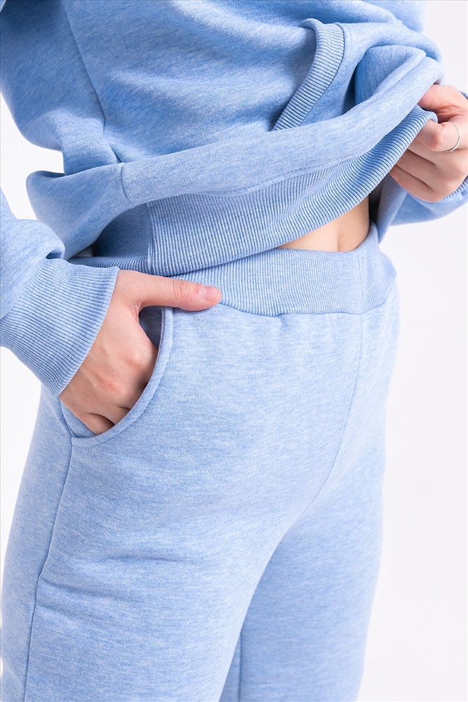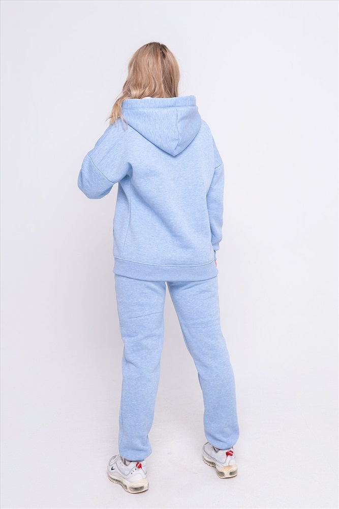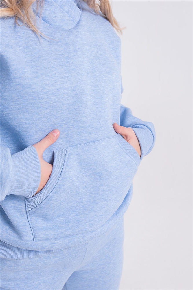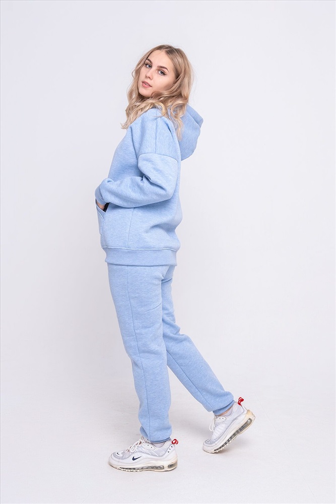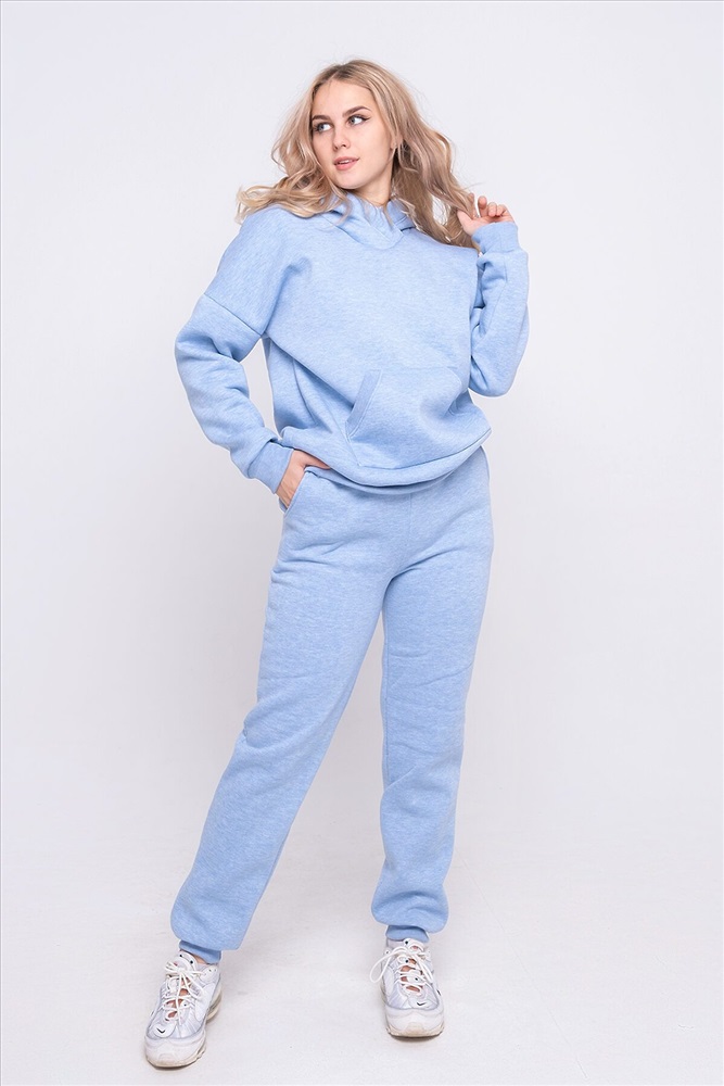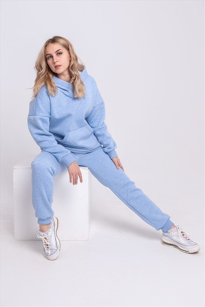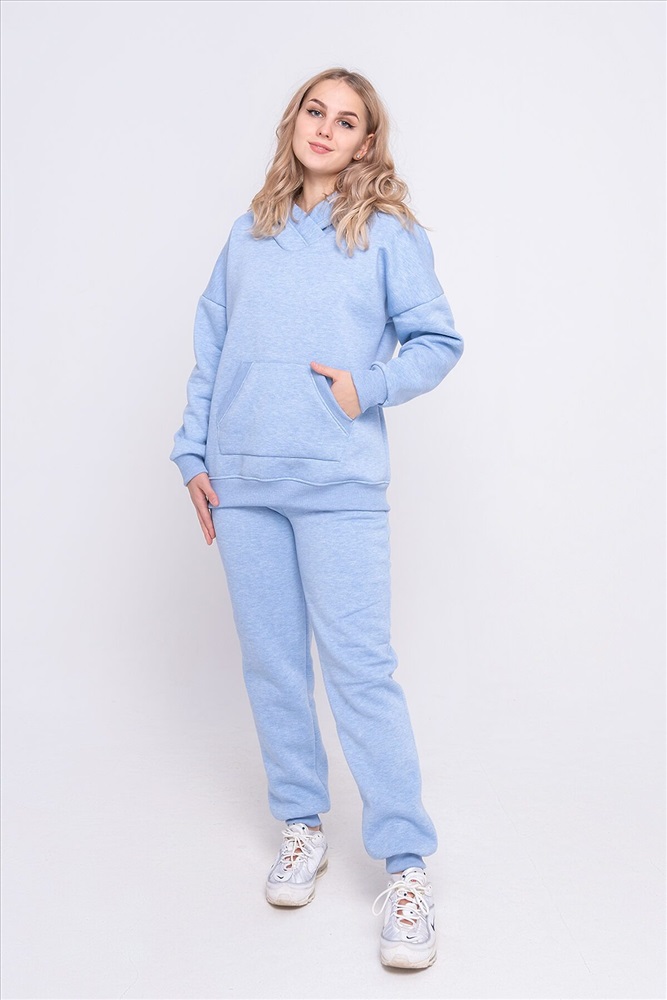 Теплый костюм свободного покроя из футера с начесом. Толстовка с капюшоном и карманом-кенгуру. Манжеты, пояс и вход в карман выполнены из кашкорсе идентичного цвета. Брюки средней посадки с боковыми карманами, низ брюк на манжетах. Костюм хорошо подходит для холодного времени года, не стесняет движений и позволяет свободно заниматься спортом.