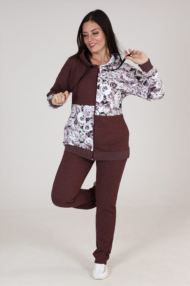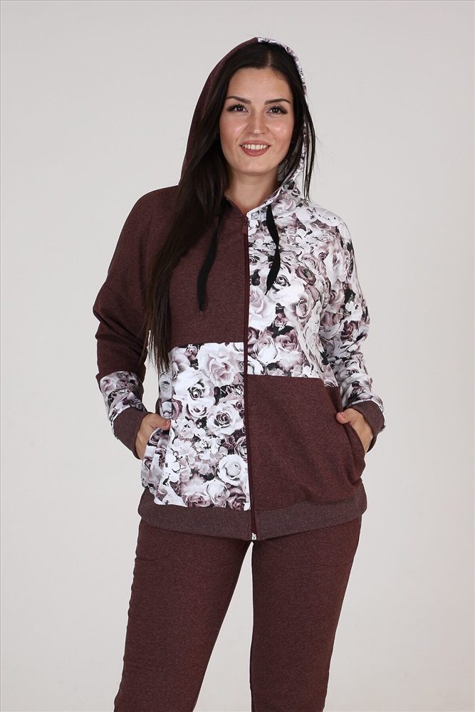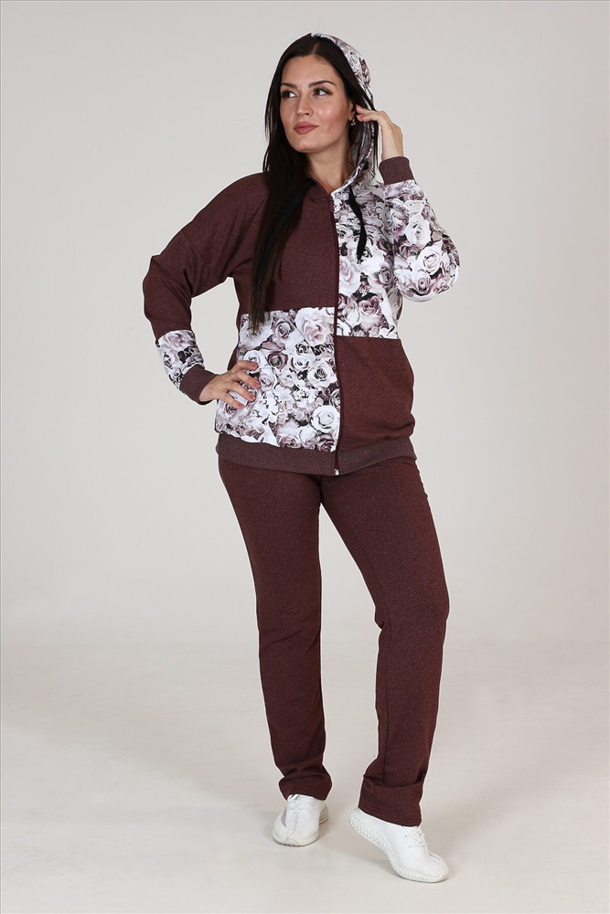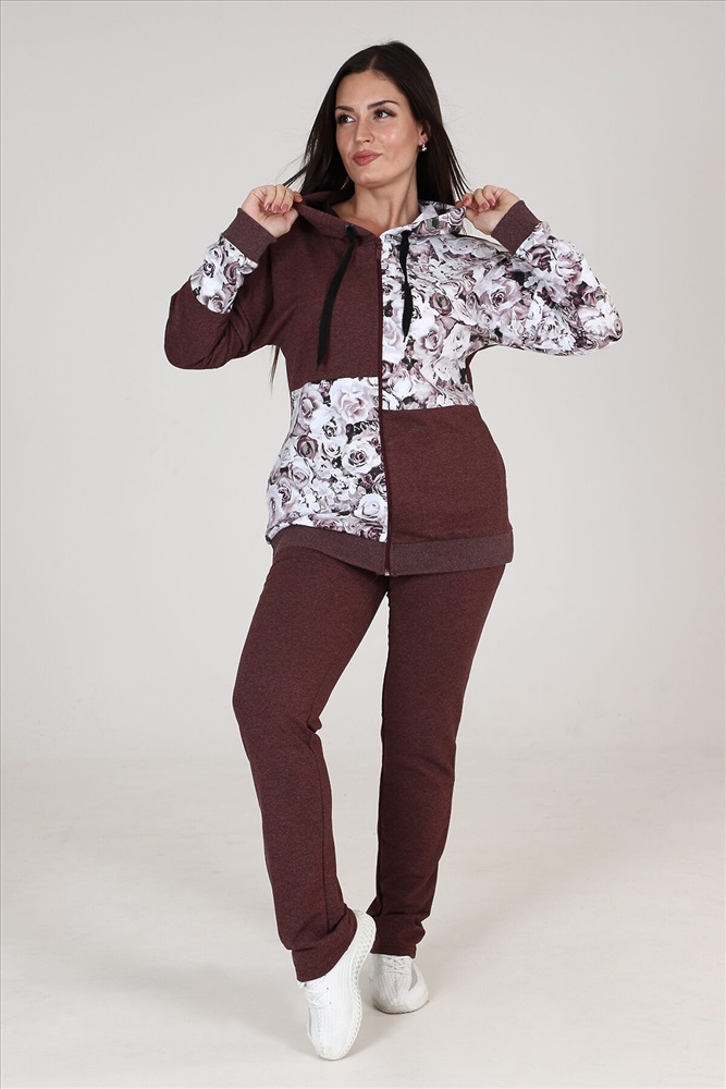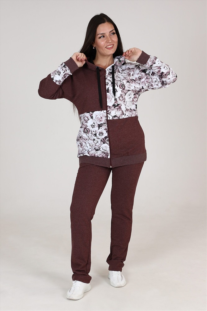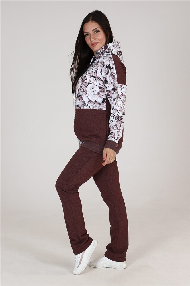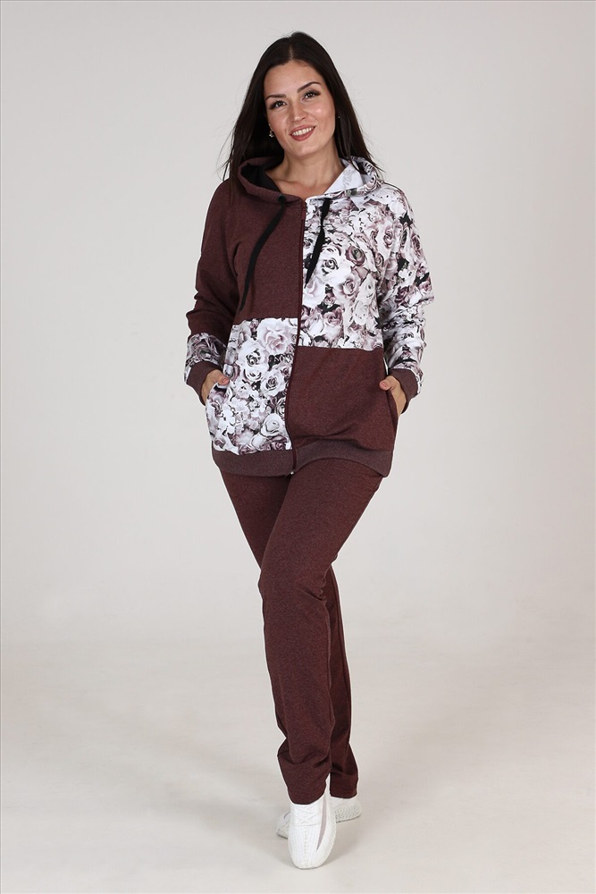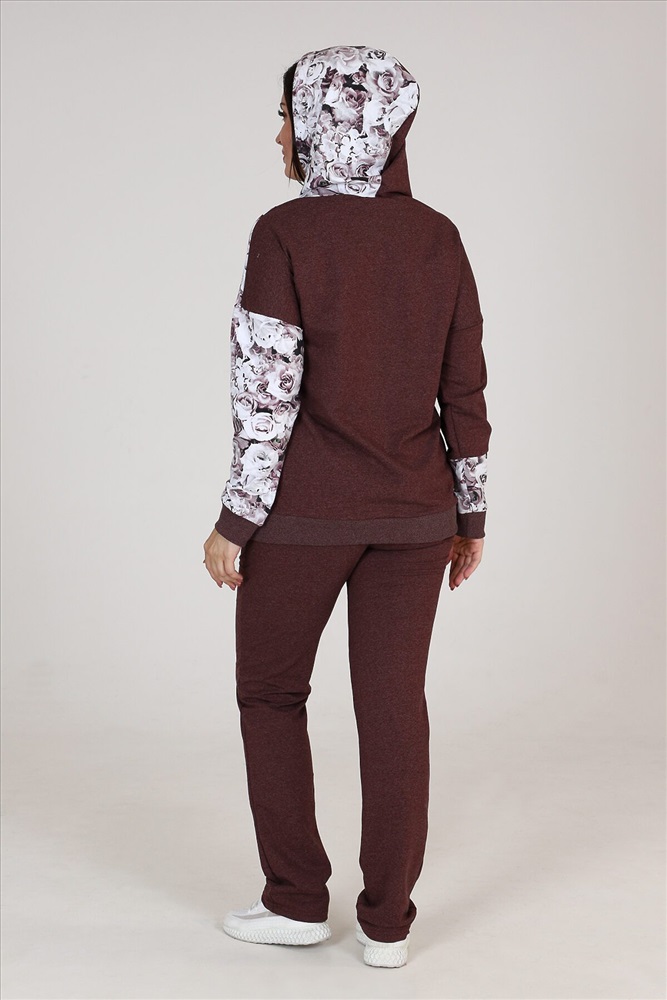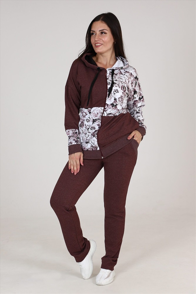Страна производства: Россия Женский костюм из футера - куртка на молнии с брюками. Куртка асимметричного кроя со спущенной проймой и капюшоном изготовлена из двух тканей компаньонов. Левая верхняя сторона, нижняя правая, левый рукав, нижняя часть правого рукава и половина капюшона отшиты из набивного футера. В боковых швах находятся карманы, в капюшоне люверсы и шнурки. Брюки полной длинны с карманами. Пояс и манжеты куртки, листочки карманов и пояс брюк изготовлены из кашкорсе основного цвета костюма.