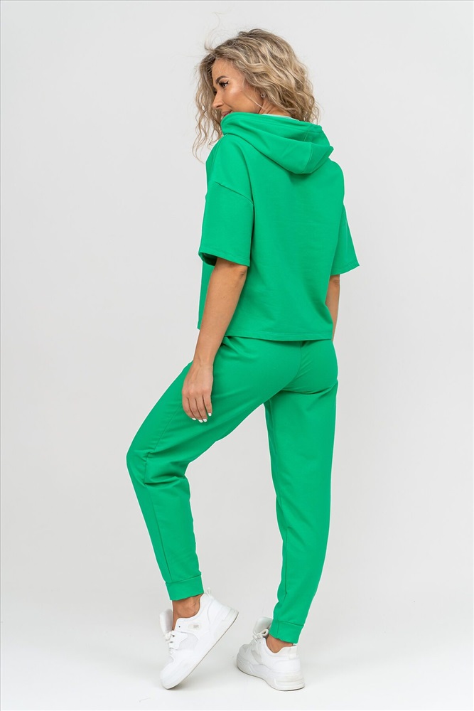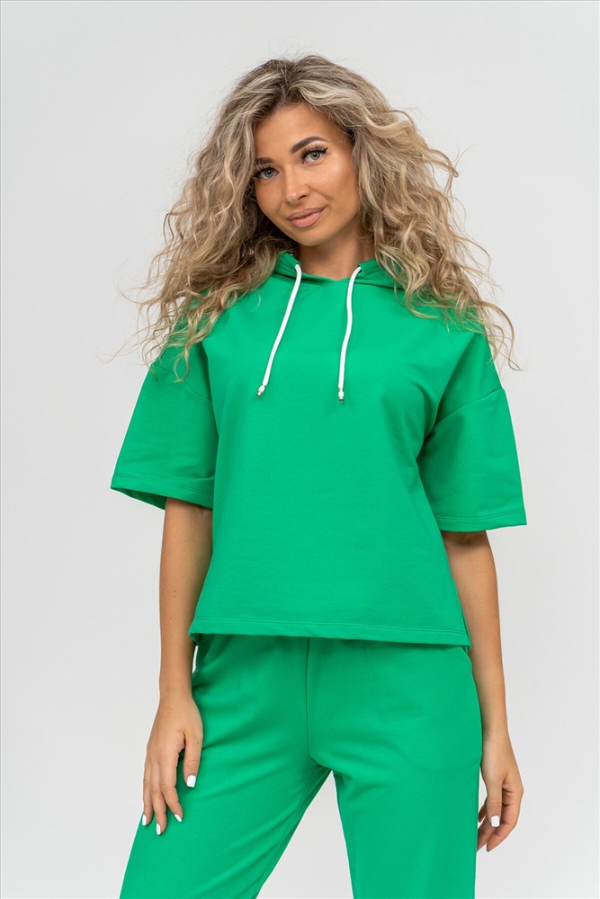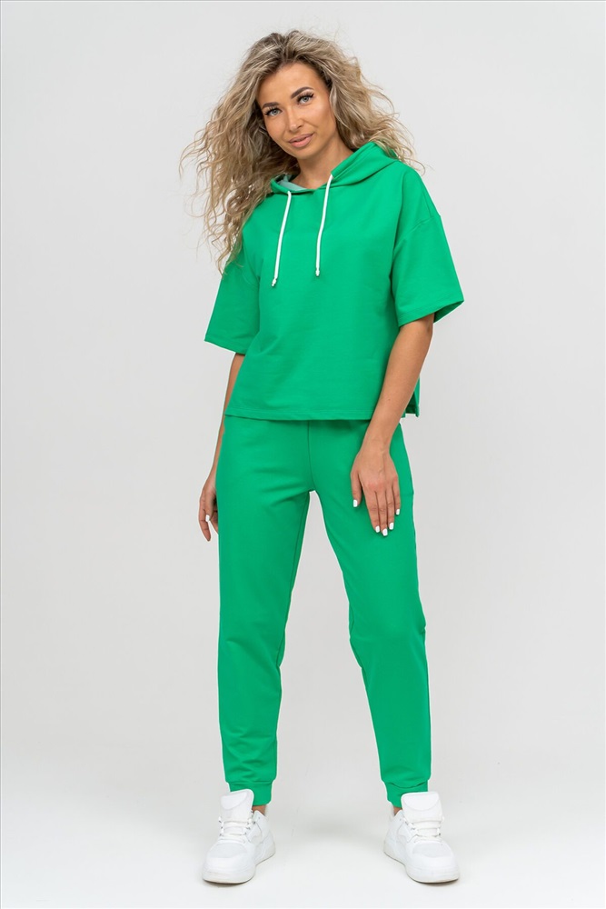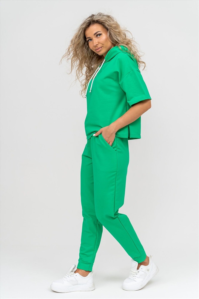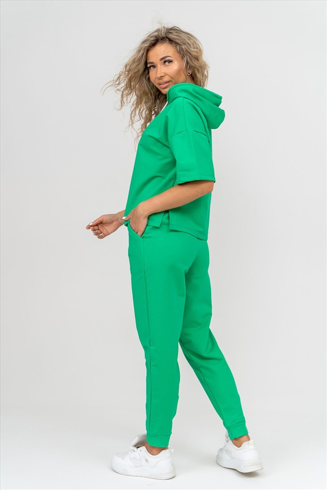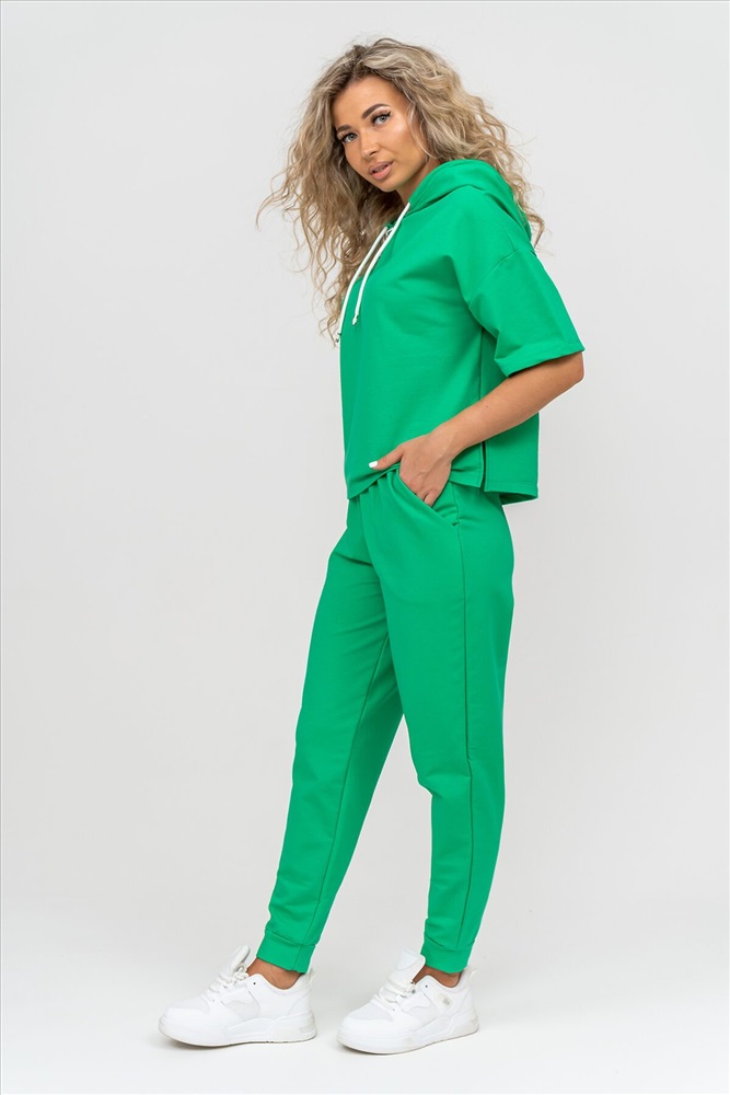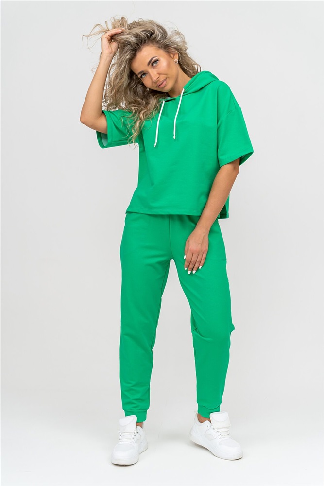 ID товара: 1019106 Состав: 72% Хлопок, 20% Полиэстер, 8% Лайкра Сезон: Весна/Лето Фасон: Свободный крой Рукав: Короткие Крой брючин: Зауженный Тип карманов: Втачные Вид ткани: Футер 2-х нитка Страна бренда: Россия Страна производства: Россия Женский костюм выполнен из футера высокого качества с хлопком и небольшим добавлением полиэстера и лайкры, что позволяет изделию не скатываться и оставлять идеальный внешний вид на долгое время. Костюм состоит из толстовки и брюк. Толстовка с капюшоном и шнурком. Линия плеча спущена, рукав укороченный, по бокам имеются небольшие разрезы. Брюки представленны с вместительными боковыми карманами. Манжеты брюк выполнены из основного материала, а пояс на специализированной поясной машине, что делает швы ровными и качественными. Свободный крой прекрасно будет смотреться на дамах с любыми формами. Костюм такого плана представлен в широкой размерной сетке, что позволяет выбрать его как девушке, так и женщине. Однотонный костюм модных расцветок будет удачным выбором для поездок в отпуск, на пикник, для школы, для активного отдыха и прогулок по городу. Будет гармонично сочетаться как с кроссовками, так и с туфлями, балетками или босоножками. Используя эту модель в качестве домашнего костюма, Вы поймёте, что это именно тот самый идеальный вариант, в котором будете себя чувствовать удобно, комфортно и современно. Костюм с брюками - это настоящая находка для тех, кто ценит свою индивидуальность! Ориентируясь по таблице замеров, обратите внимание, что замеры длины рукава проводились от точки основания шеи. Комментарии к товару