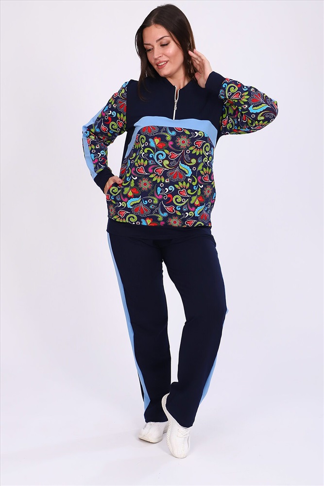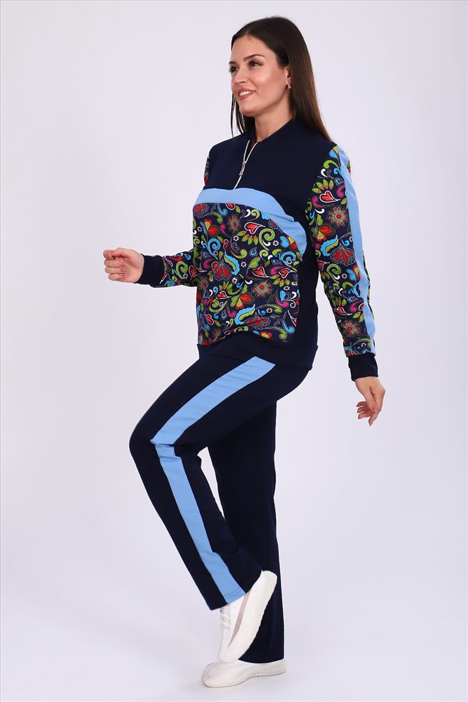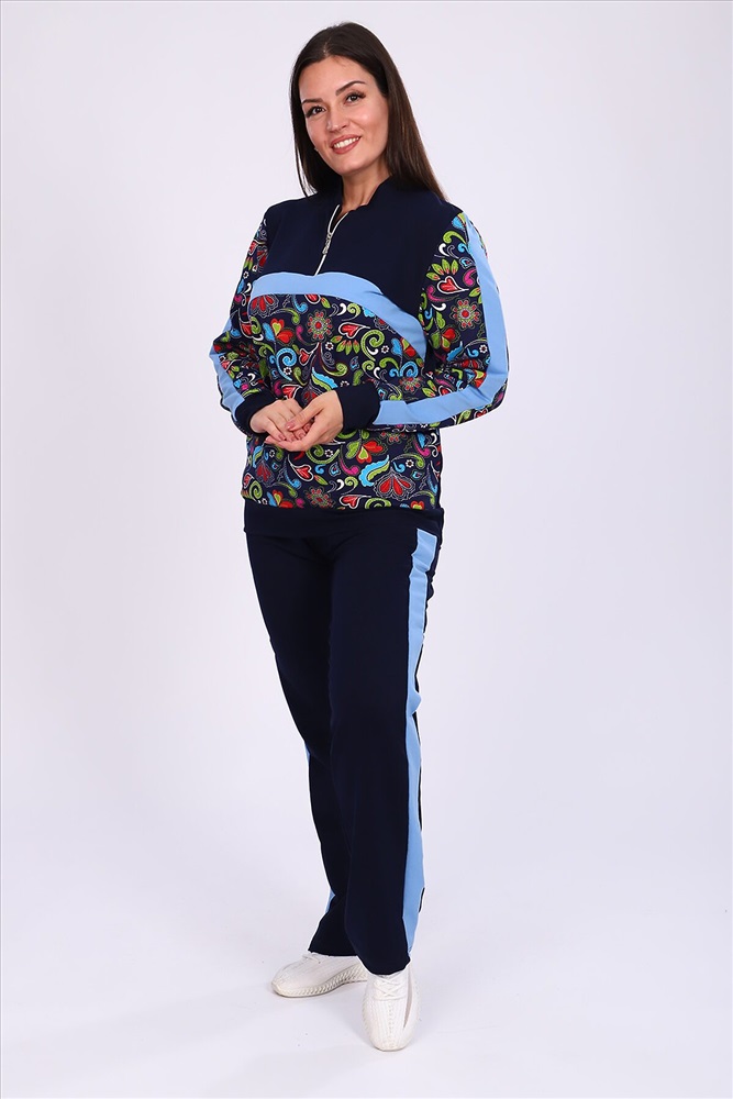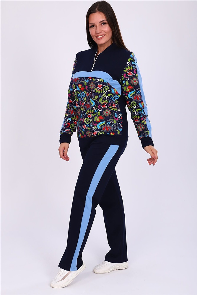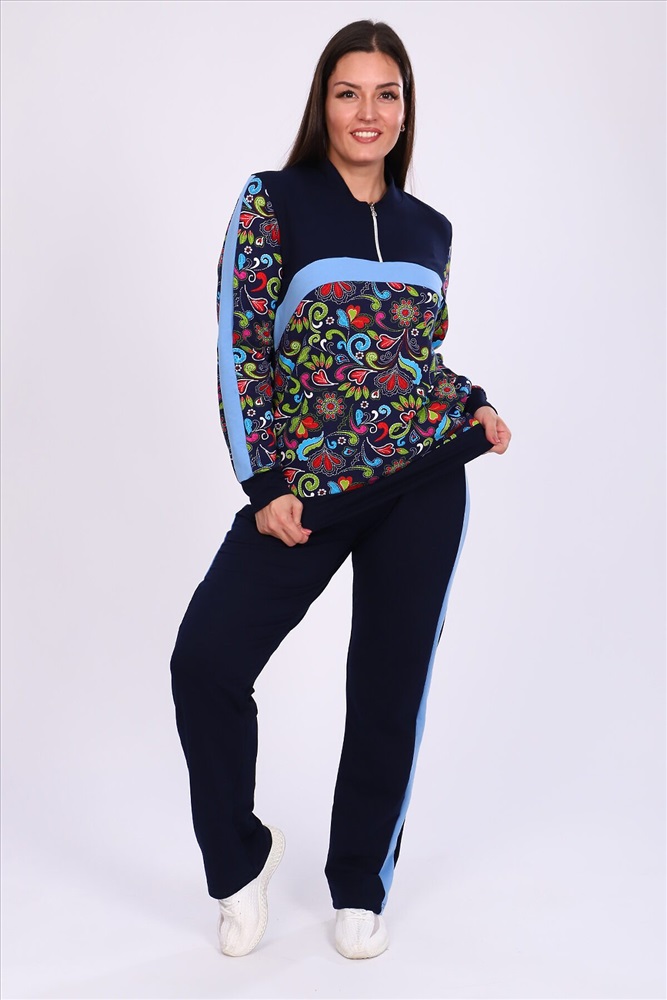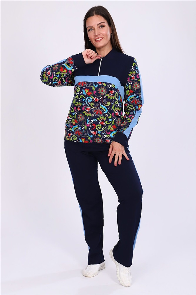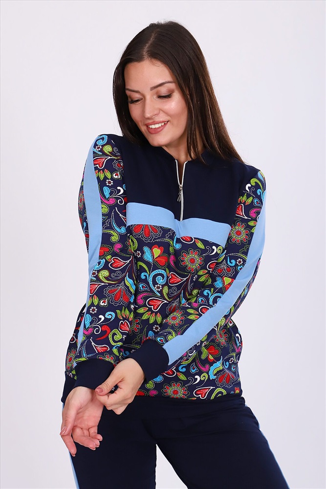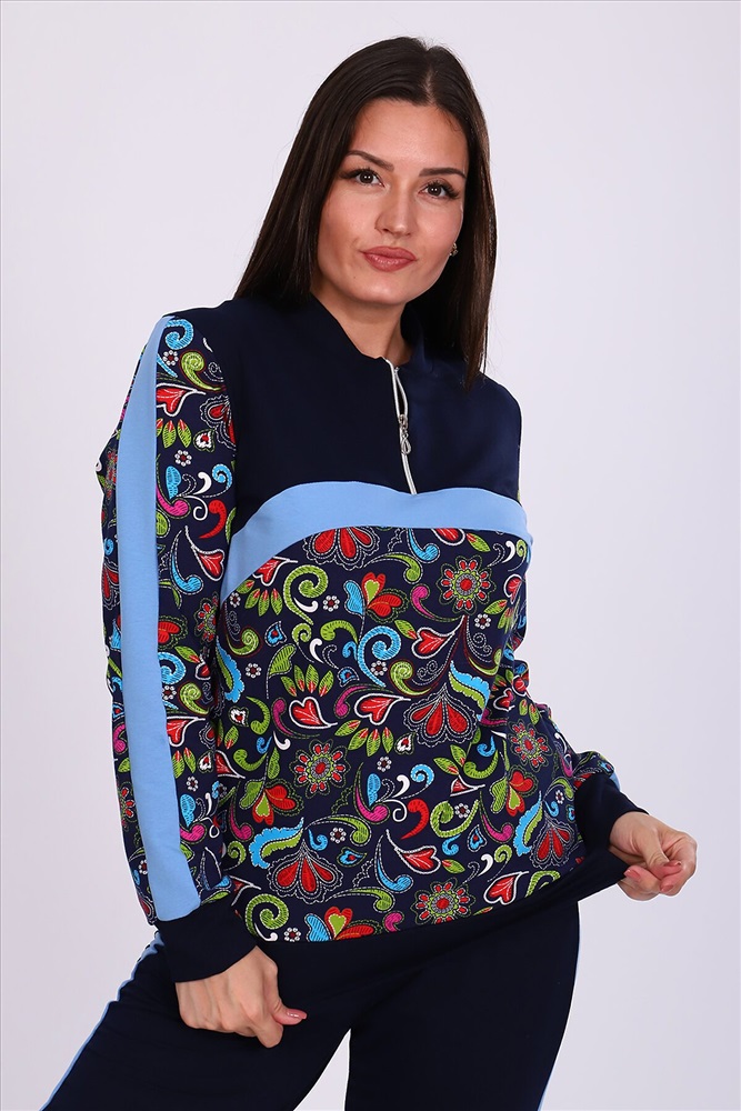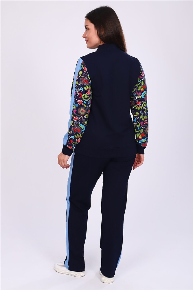 Страна производства: Россия Костюм женский состоит из однотонных брюк и комбинированной кофты. Кофта с воротником-стойкой и застежкой-молнией до середины груди. Рукав на манжете. Брюки прямые с лампасом по боковому шву.