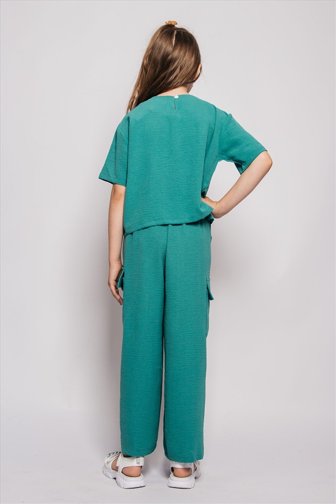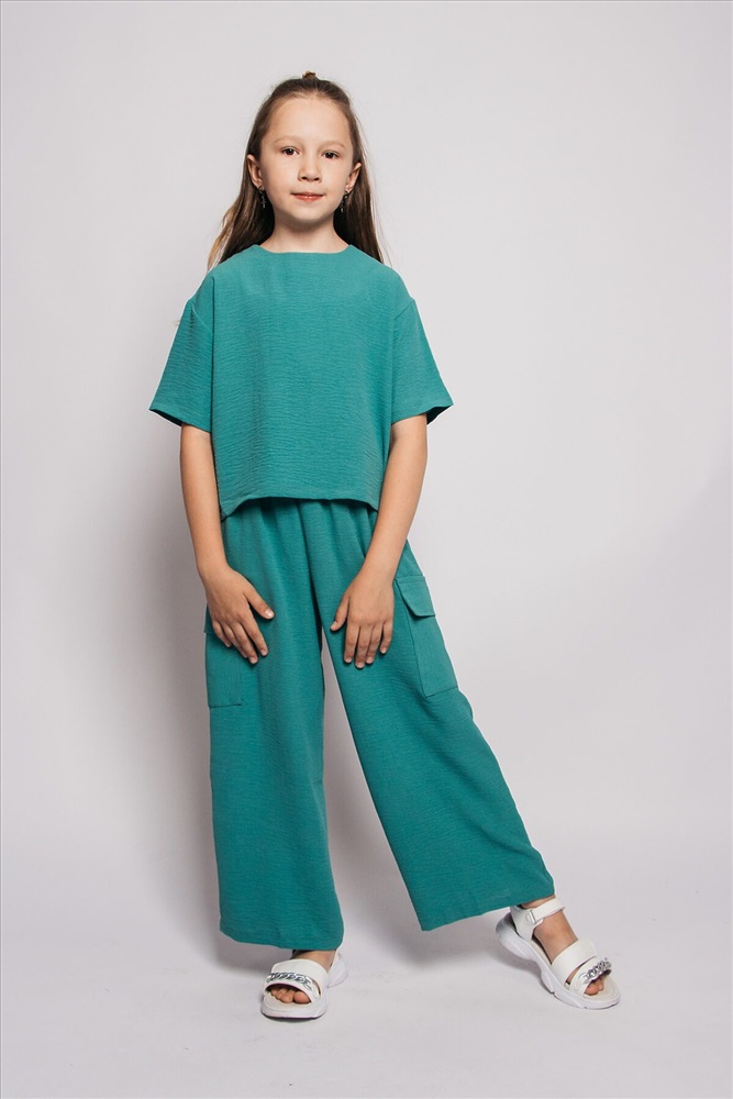 Костюм для девочки летний - это настоящая находка для модных детей подростков, состоящий из футболки и брюк! Он выполнен из легкой и дышащей ткани - что обеспечивает комфорт даже в самые жаркие дни. Изделие не требует специального ухода: достаточно машинной стирки на деликатном режиме при 40 градусах. Этот стильный, яркий комплект станет самой любимой вещью в гардеробе вашего ребенка. Штанишки можно сочетать с красивой футболкой, широкой толстовкой на молнии, спортивной блузой и удобной обувью, в этом прогулочном костюме ребенку будет комфортно, уютно и тепло в любую погоду. Футболка для девочки прямого силуэта со спущеным коротким рукавом. Горловина круглая обработана обтачкой из основного полотна. Низ изделия и рукавов обработан швом в подгибку. Брюки широкие с завышенной линией талии, силуэт расширяется сразу же от пояса и дальше остается прямым. На боковых швах брюк выполнен накладной карман с клапаном из основного материала.