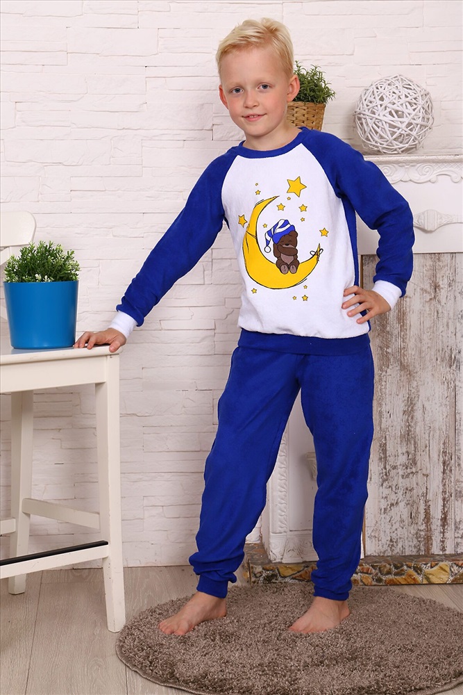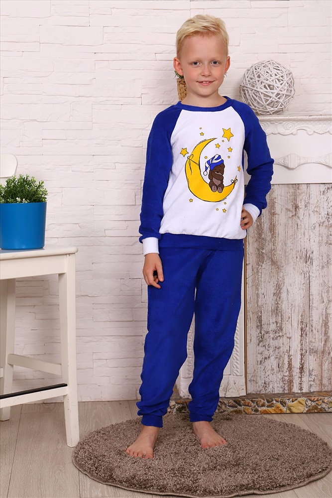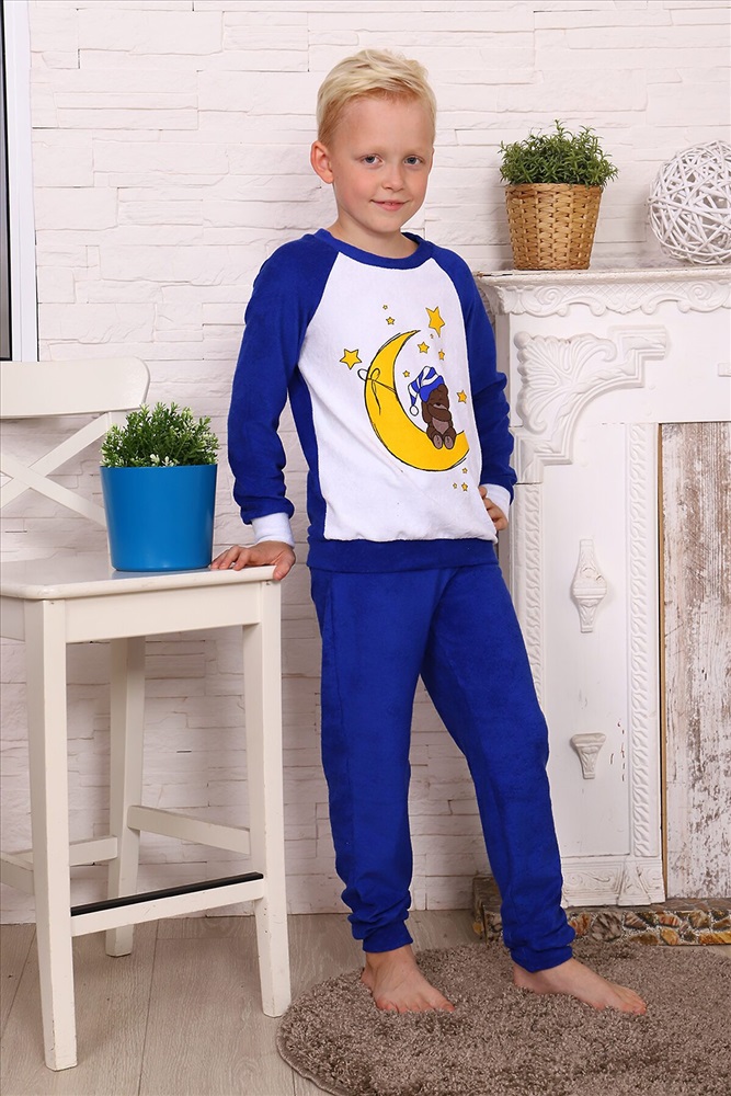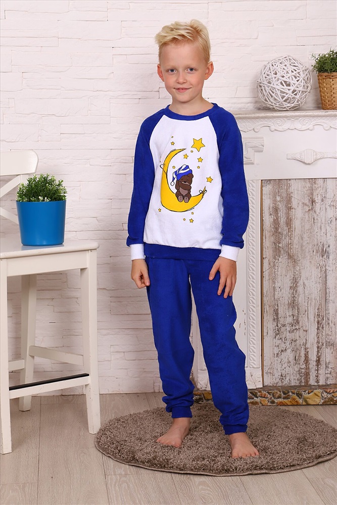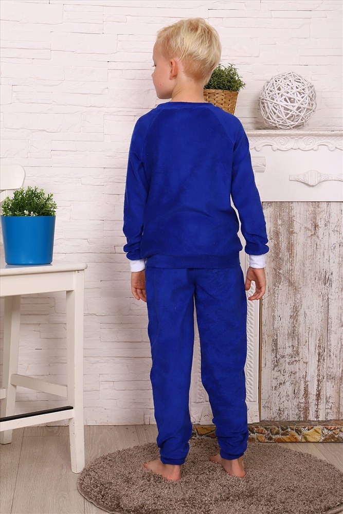 ID товара: 881424 Состав: Хлопок 100% Сезон: Демисезон Длина: Полная Фасон: Прямой Рукав: длинные Декоративные элементы: Принт Основная ткань: Махра Страна бренда: Россия Страна производства: Россия Костюм для мальчика домашний из махры. Брюки на манжете, кофта рукав реглан, спереди печать Комментарии к товару