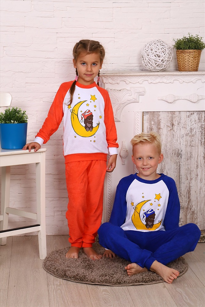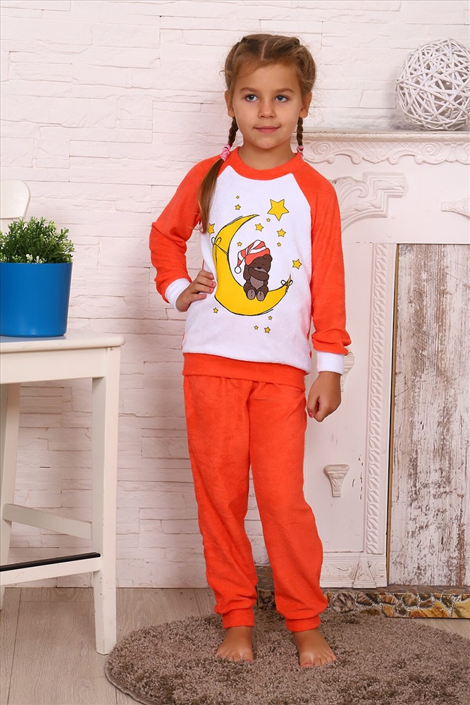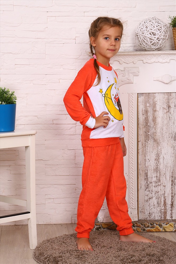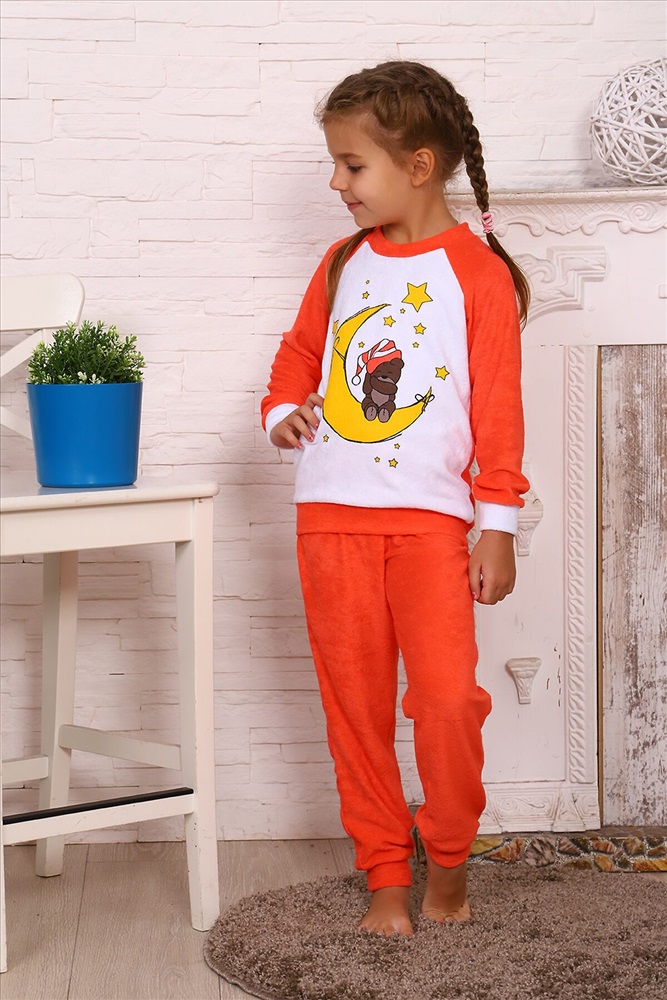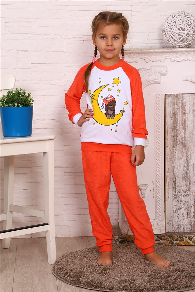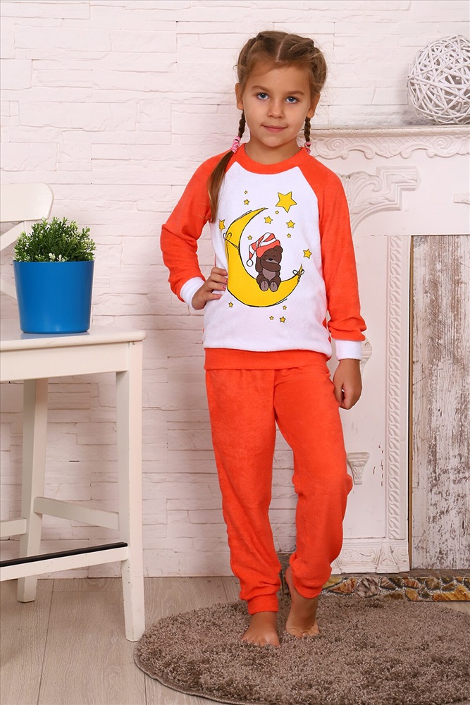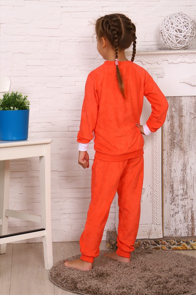Страна производства: Россия Костюмчик домашний из мягкой махры на девочку. Брючки прямые на манжете, кофточка рукав реглан на поясе, впереди печать