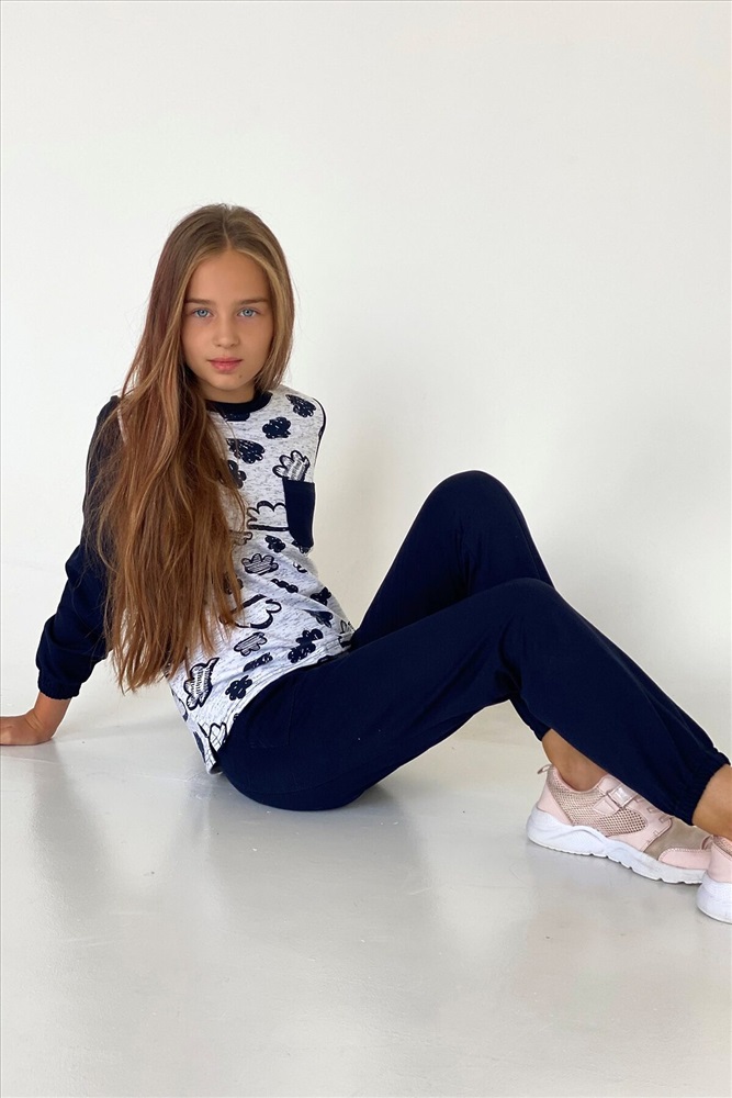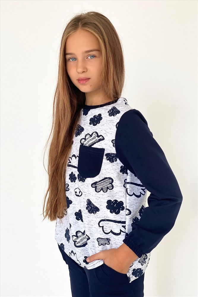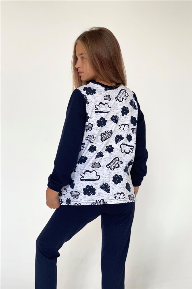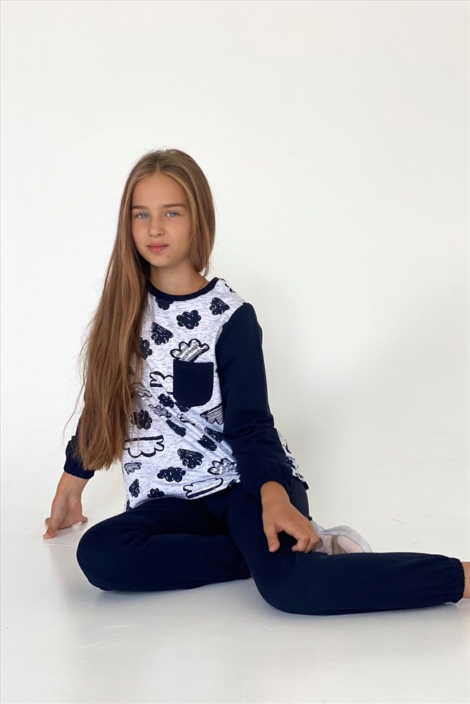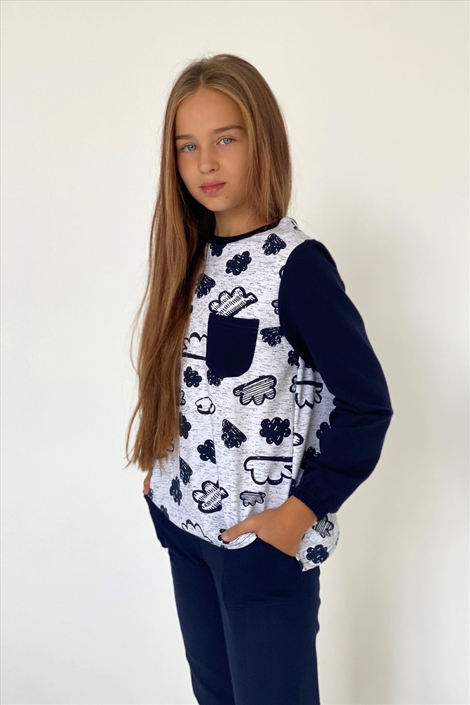 Костюм детский состоит из кофты и брюк, кофта с нагрудным кармашком, брюки со средним швом, накладными кармашками.