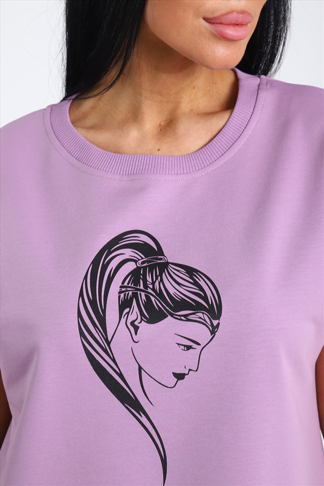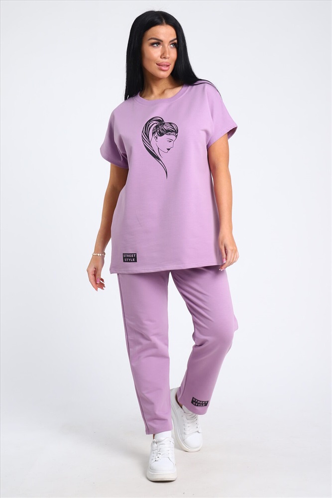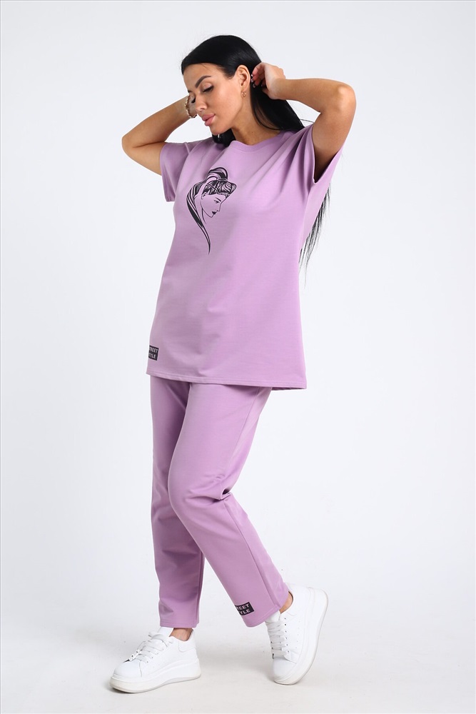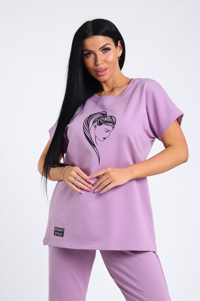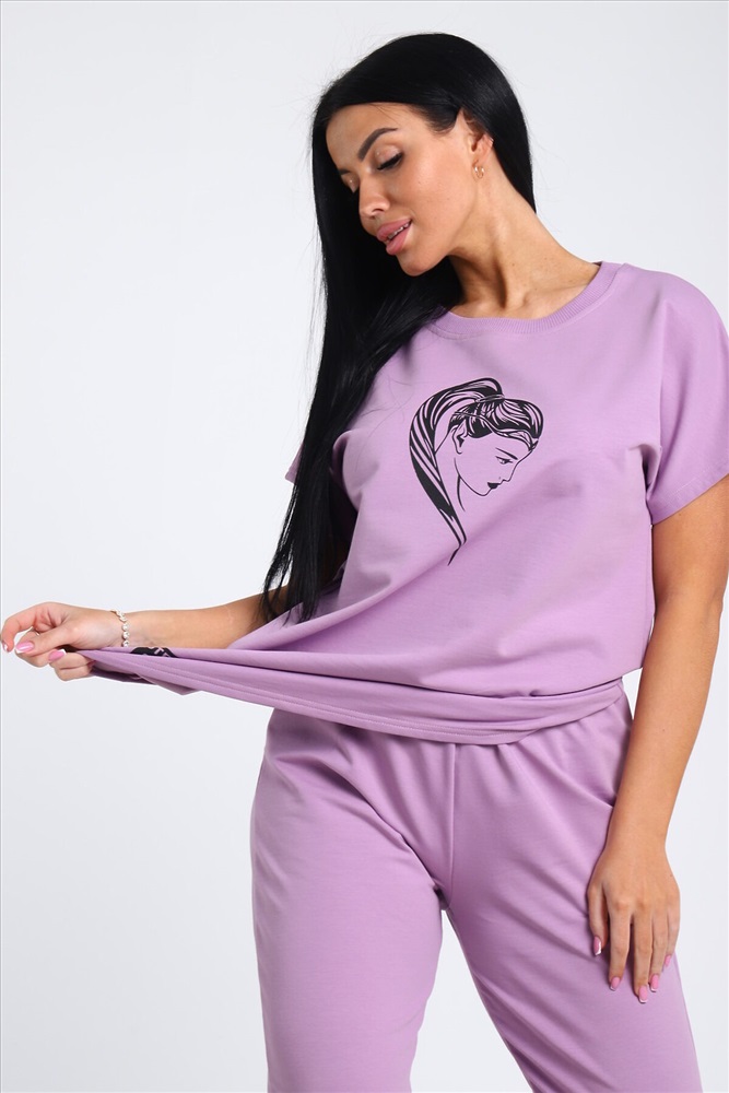 Страна производства: Россия Легкий женский костюм прямого силуэта. Верх двойки - футболка с коротким рукавом и округлой горловиной. Футболка свободная с принтом. Низ - прямые брюки без карманов, пояс на резинке. Данная модель подойдет как и для повседневной носки, так и для дома. Удобный и приятный костюм. Рост модели на фото 165, размер 48.