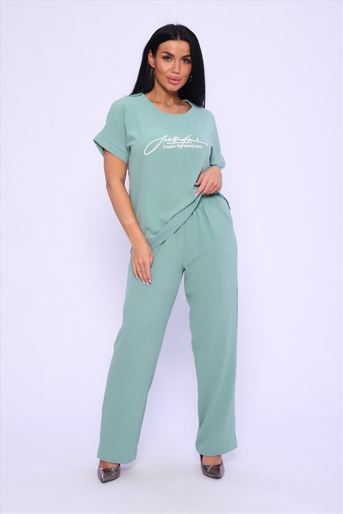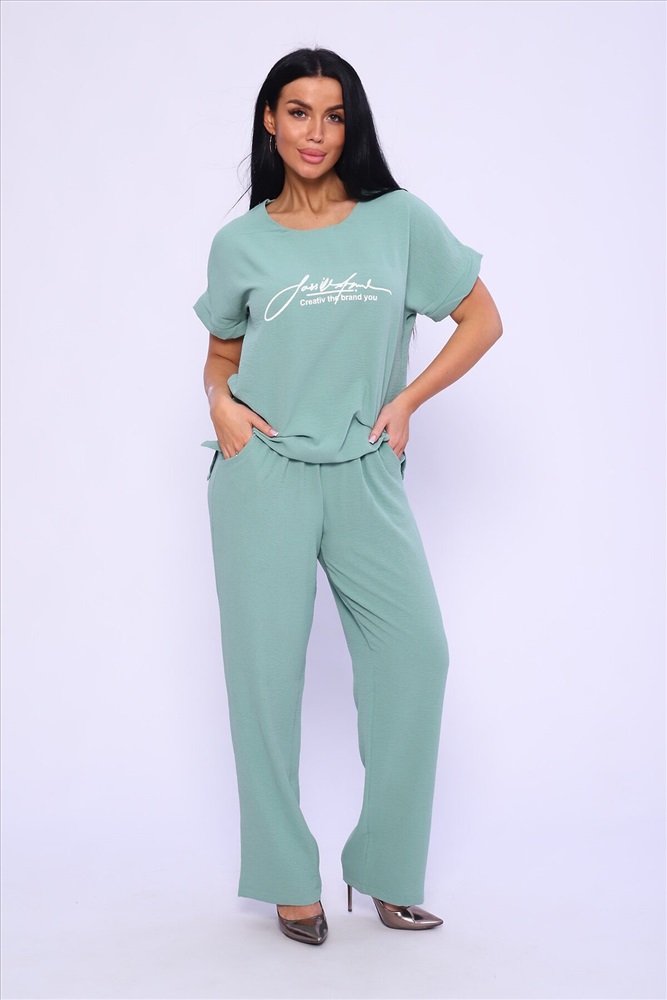 ID товара: 978196 Состав: 100% Полиэстер Сезон: Весна/Лето Длина: Полная Фасон: Прямой Рукав: короткие Крой брючин: Прямой Рисунок: Надпись Тип карманов: С отрезным бочком Декоративные элементы: Печатный принт Основная ткань: Полиэстер Стиль: повседневный Вид ткани: Сингапур Страна бренда: Россия Страна производства: Россия Женская двойка прямого кроя. Футболка костюма с коротким цельнокроеным рукавом, округлой горловиной и принтом на передней полочке, брюки с поясом на резинке (4 см) и карманами. Комплект достаточно свободный, поэтому подойдет для повседневной носки, как и для дома, так и на прогулку. Костюм представлен в двух приятных расцветках, выполнен из легкой ткани - сингапур, что идеально подойдет для жаркой погоды, красивый, но при этом простой и удобный. Комментарии к товару