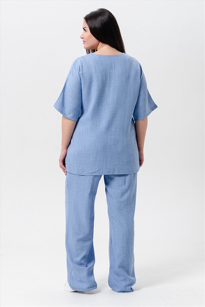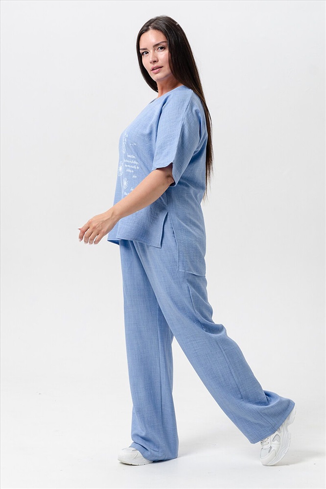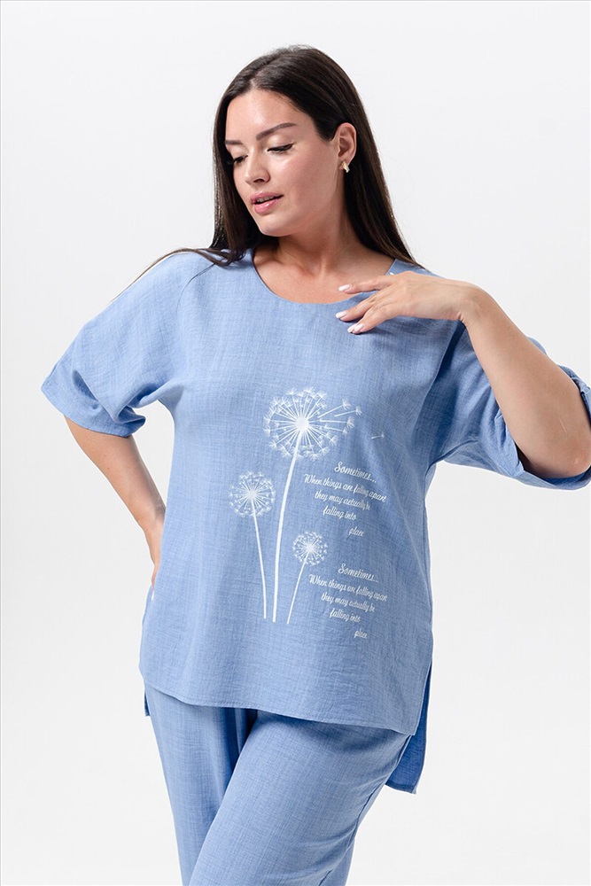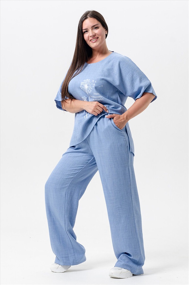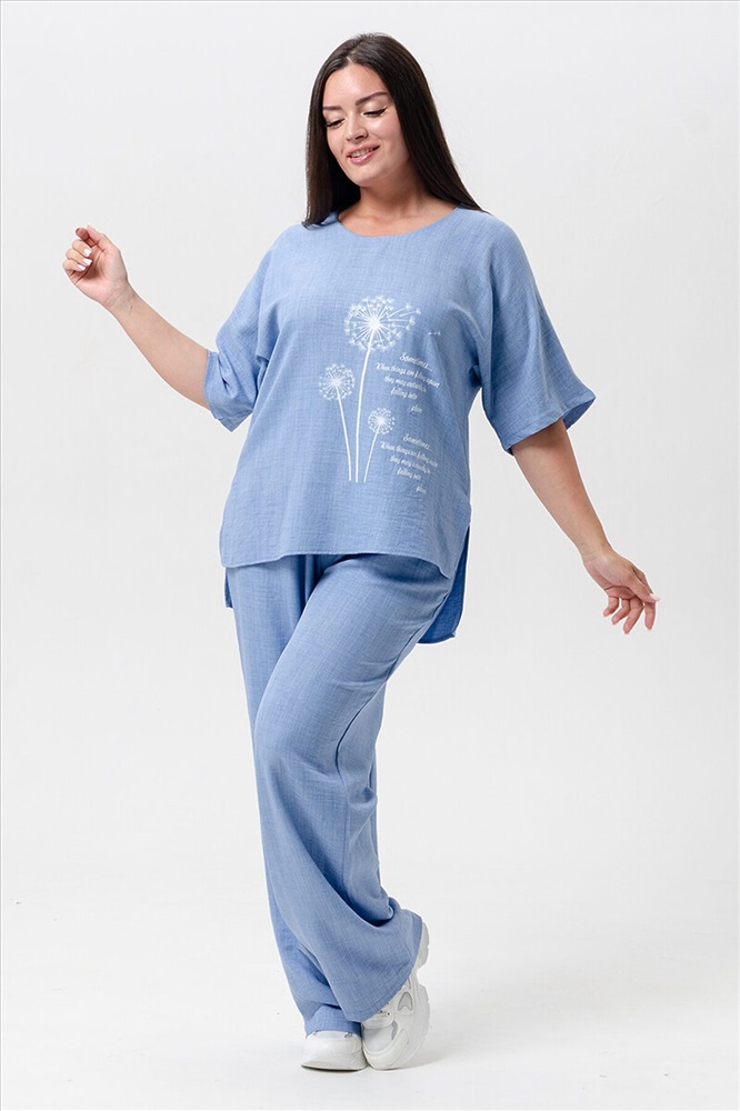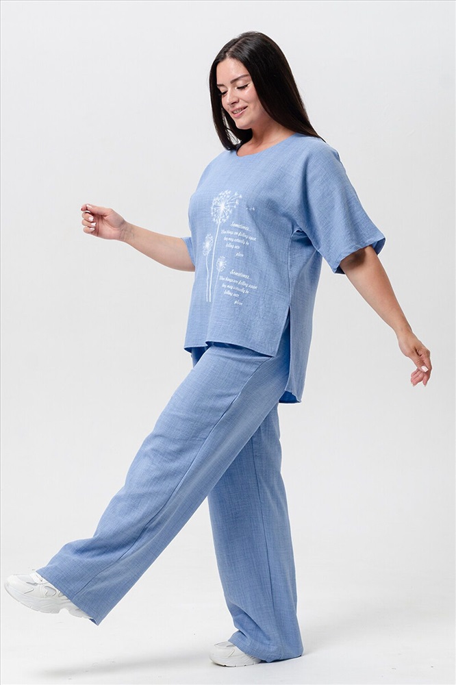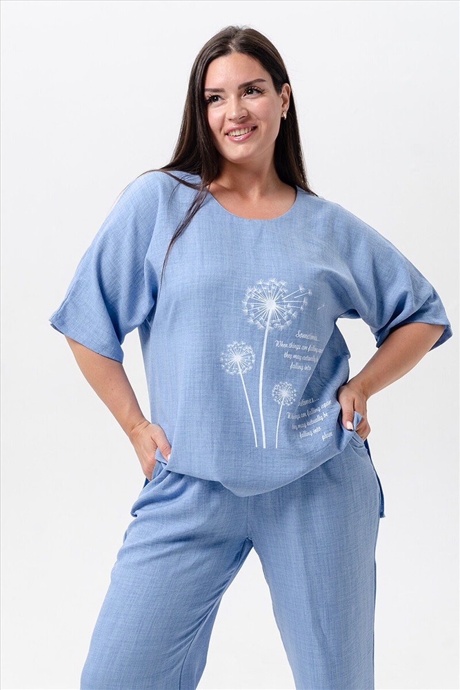 ID товара: 1027050 Состав: 100% Лён Сезон: Весна/Лето Фасон: Свободный крой Рукав: Короткие Крой брючин: Прямой Рисунок: Цветы Тип карманов: Прорезные Вид ткани: Лен Страна бренда: Россия Страна производства: Россия Женская двойка прямого кроя. Футболка костюма с цельнокроеным рукавом (до локтя, длина от горловины), округлой горловиной и принтом одуванчик на передней полочке, футболку дополняют разрезы снизу по бокам, брюки с поясом на резинке и карманами. Комплект достаточно свободный, поэтому подойдет для повседневной носки, как и для дома, так и на прогулку. Костюм представлен в двух приятных расцветках, выполнен из легкой ткани - лен, что идеально подойдет для жаркой погоды, красивый, но при этом простой и удобный. (фотомодель носит 46 размер, размер костюма на ней 50-52). Комментарии к товару
