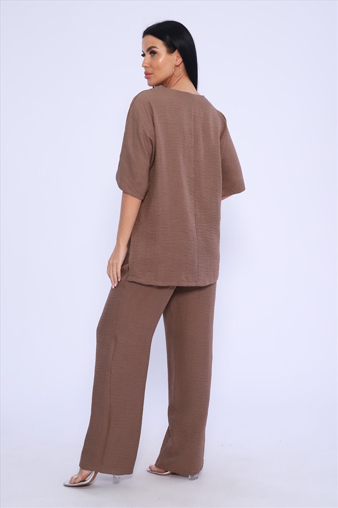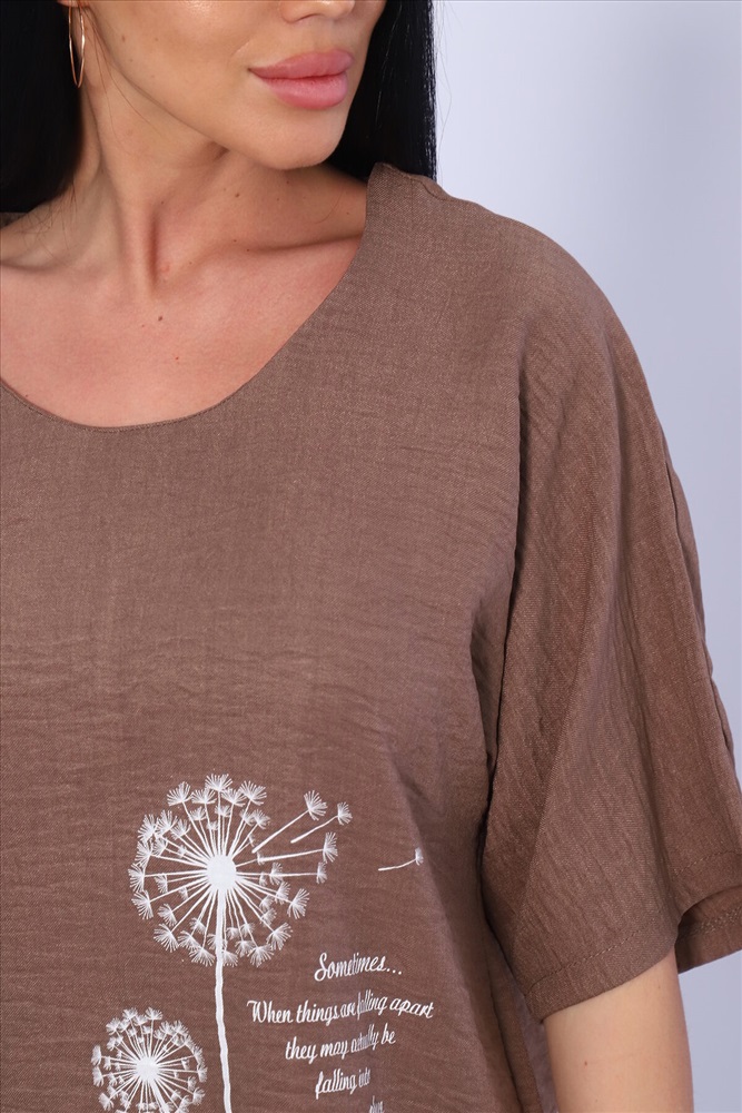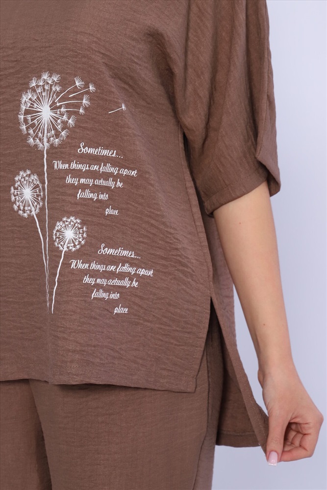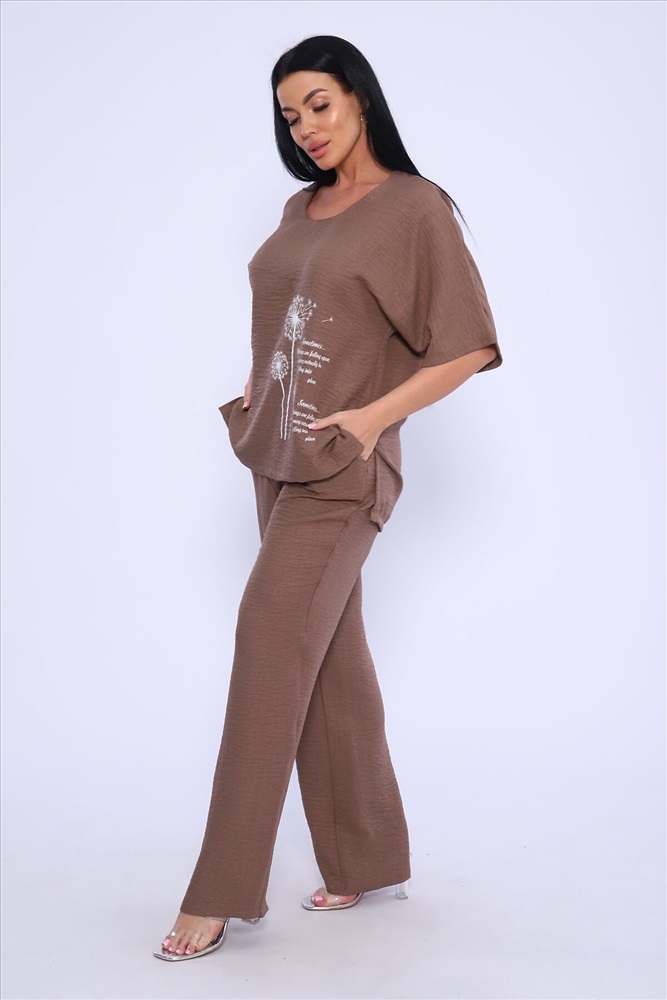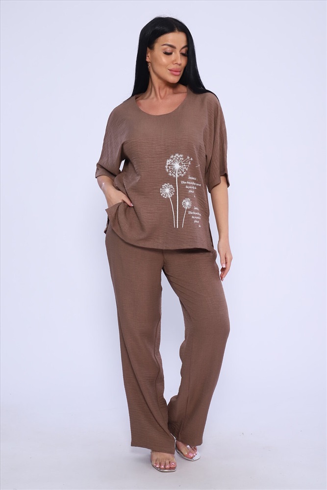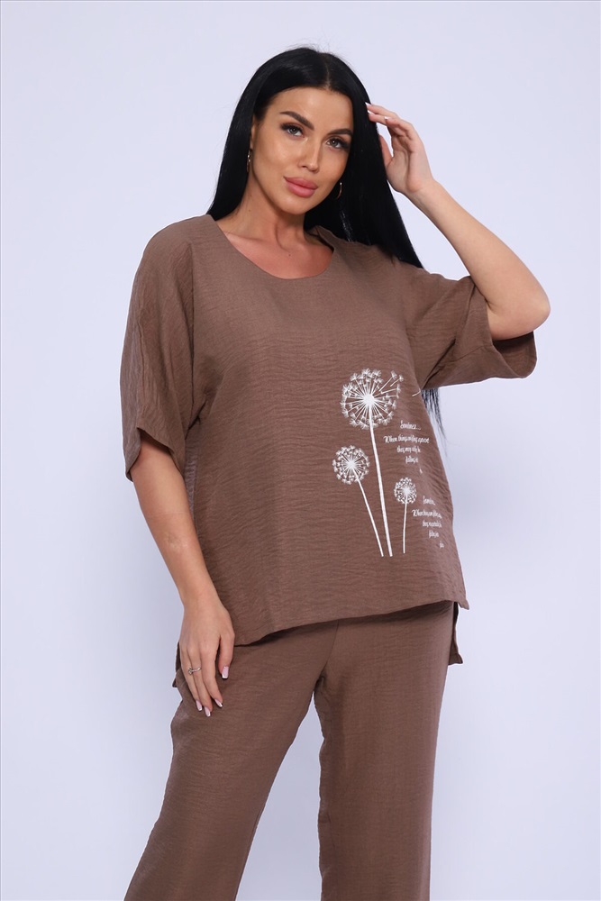 ID товара: 983388 Состав: 100% Лён Сезон: Весна/Лето Длина: Полная Фасон: Свободный Рукав: короткие Крой брючин: Широкий Рисунок: цветочный Тип карманов: В шве Декоративные элементы: Принт Стиль: повседневный Вид ткани: Лен Страна бренда: Россия Страна производства: Россия Женская двойка прямого кроя. Футболка костюма с цельнокроеным рукавом (до локтя, длина от горловины), округлой горловиной и принтом одуванчик на передней полочке, футболку дополняют разрезы снизу по бокам, брюки с поясом на резинке и карманами. Комплект достаточно свободный, поэтому подойдет для повседневной носки, как и для дома, так и на прогулку. Костюм представлен в двух приятных расцветках, выполнен из легкой ткани - лен, что идеально подойдет для жаркой погоды, красивый, но при этом простой и удобный. (фотомодель носит 46 размер, размер костюма на ней 50-52). Комментарии к товару