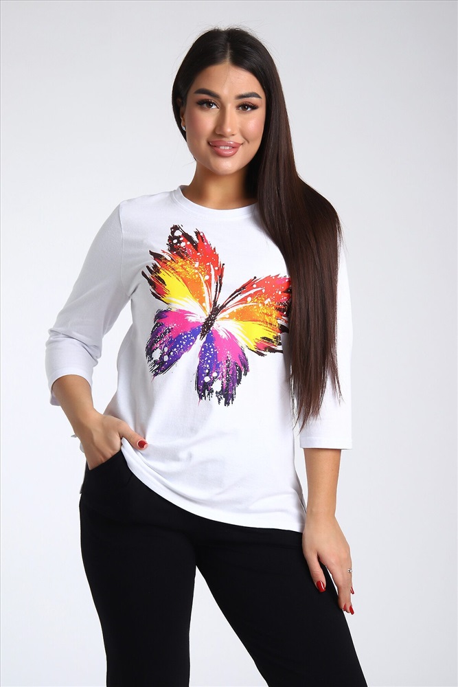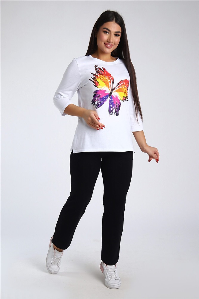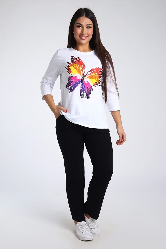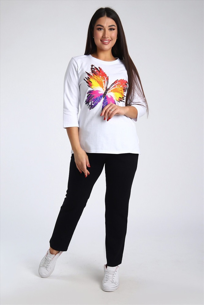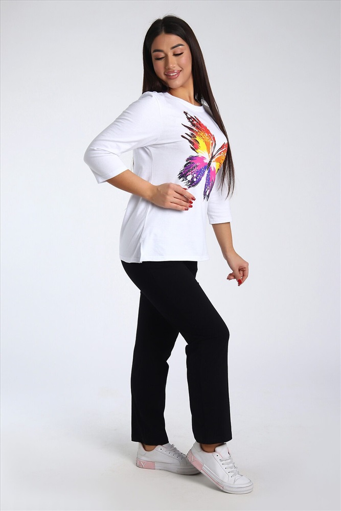 ID товара: 985572 Состав: Верх- 100% Хлопок, низ- 95% Хлопок, 5% Лайкра Сезон: Весна/Лето Длина: Полная Фасон: Полуприлегающий Рукав: 3/4 Крой брючин: Зауженный Рисунок: бабочки Тип карманов: В шве Декоративные элементы: Принт Основная ткань: Хлопок Стиль: повседневный Вид ткани: Кулирка, кулирка с лайкрой Страна бренда: Россия Страна производства: Россия Женский костюм из двух видов ткани (хлопок-верх, с добавлением лайкры-низ). Комплект состоит из футболки с принтом и классических брюк с карманами. Подходит для повседневного использования. Комментарии к товару