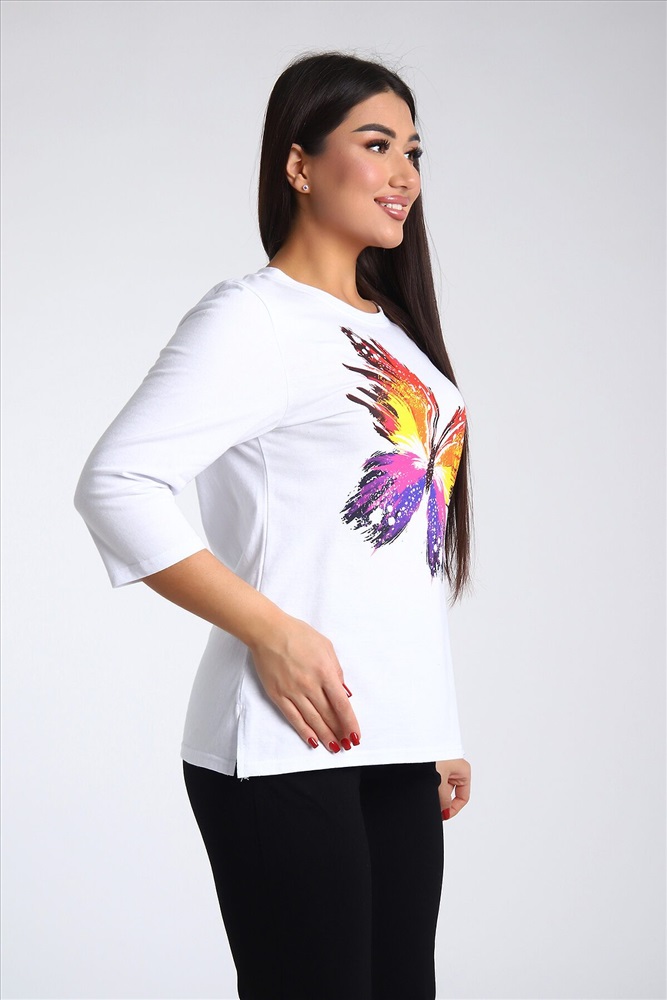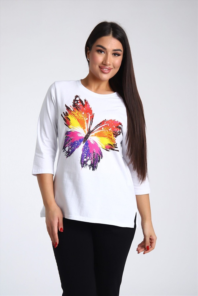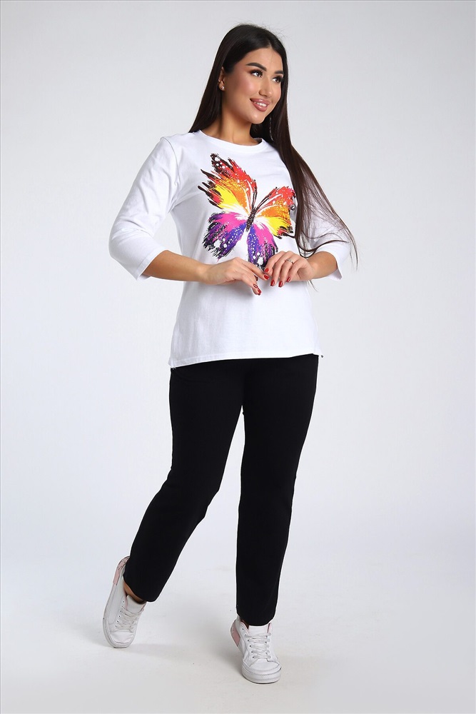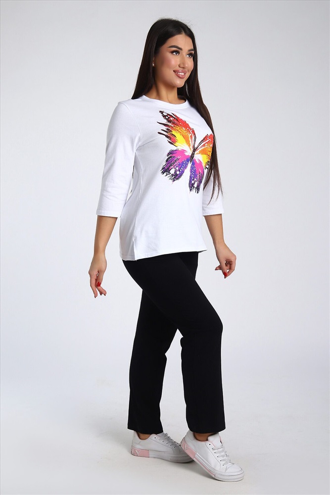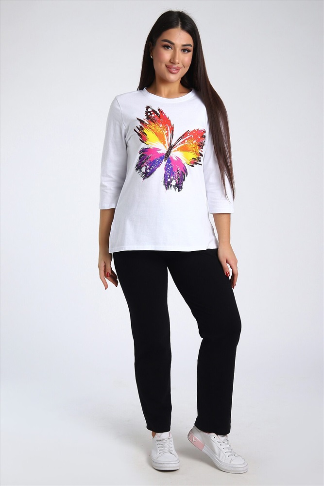 ID товара: 985572 Состав: Верх- 100% Хлопок, низ- 95% Хлопок, 5% Лайкра Сезон: Весна/Лето Длина: Полная Фасон: Полуприлегающий Рукав: 3/4 Крой брючин: Зауженный Рисунок: бабочки Тип карманов: В шве Декоративные элементы: Принт Основная ткань: Хлопок Стиль: повседневный Вид ткани: Кулирка, кулирка с лайкрой Страна бренда: Россия Страна производства: Россия Женский костюм из двух видов ткани (хлопок-верх, с добавлением лайкры-низ). Комплект состоит из футболки с принтом и классических брюк с карманами. Подходит для повседневного использования. Комментарии к товару
