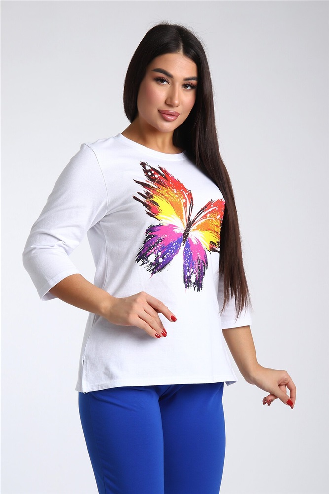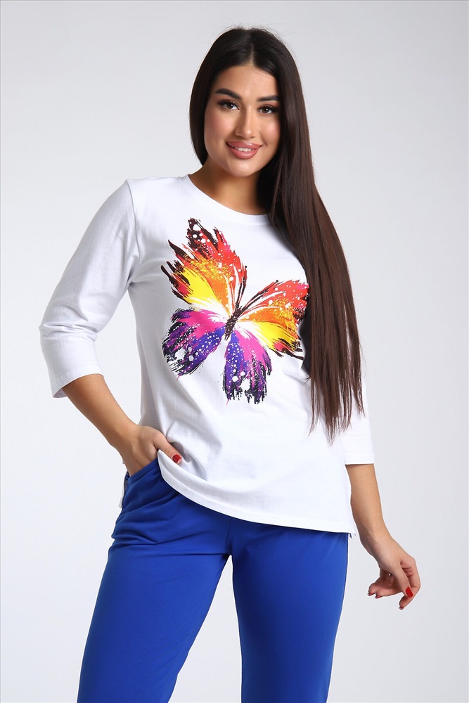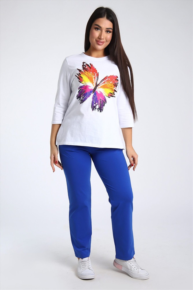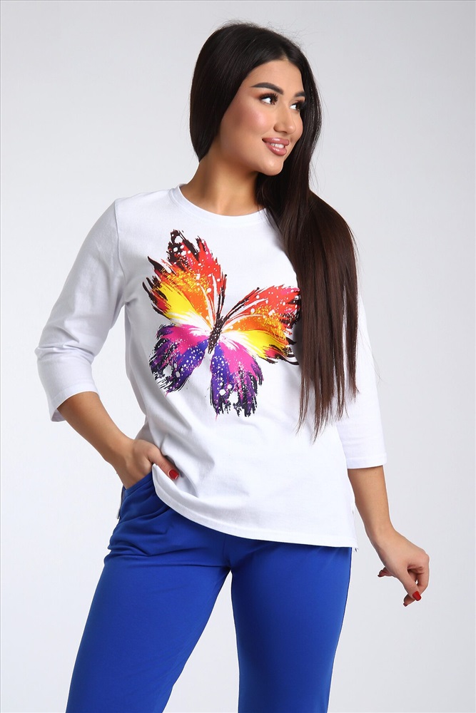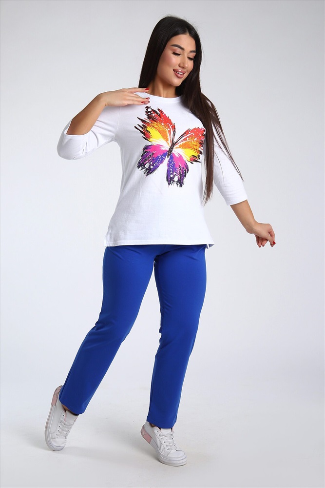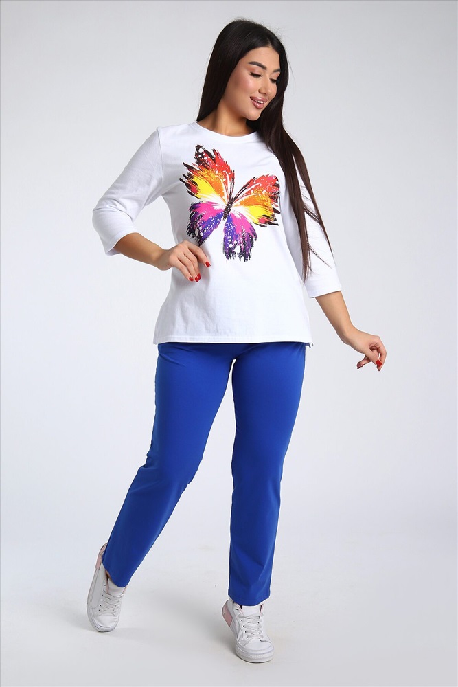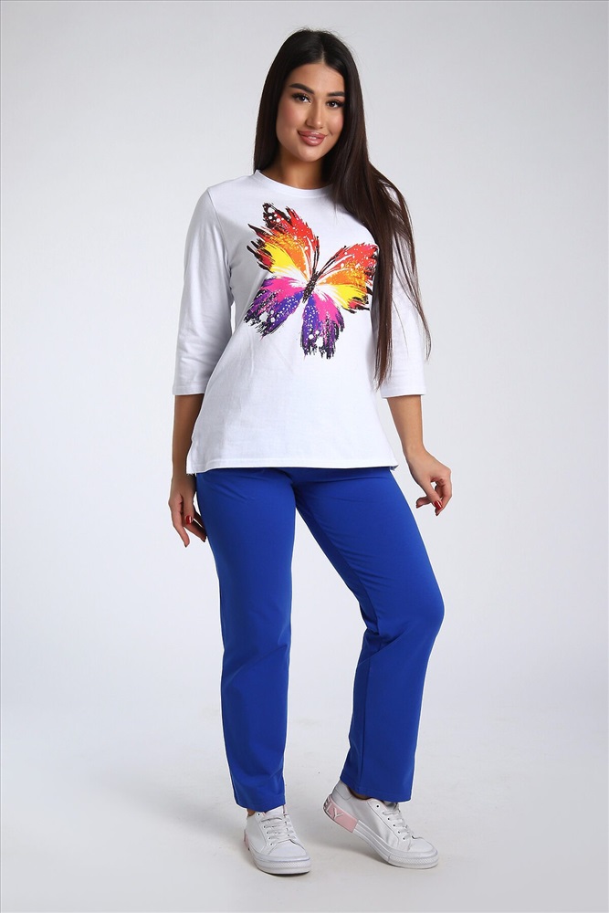 Страна производства: Россия Женский костюм из двух видов ткани (хлопок-верх, с добавлением лайкры-низ). Комплект состоит из футболки с принтом и классических брюк с карманами. Подходит для повседневного использования.