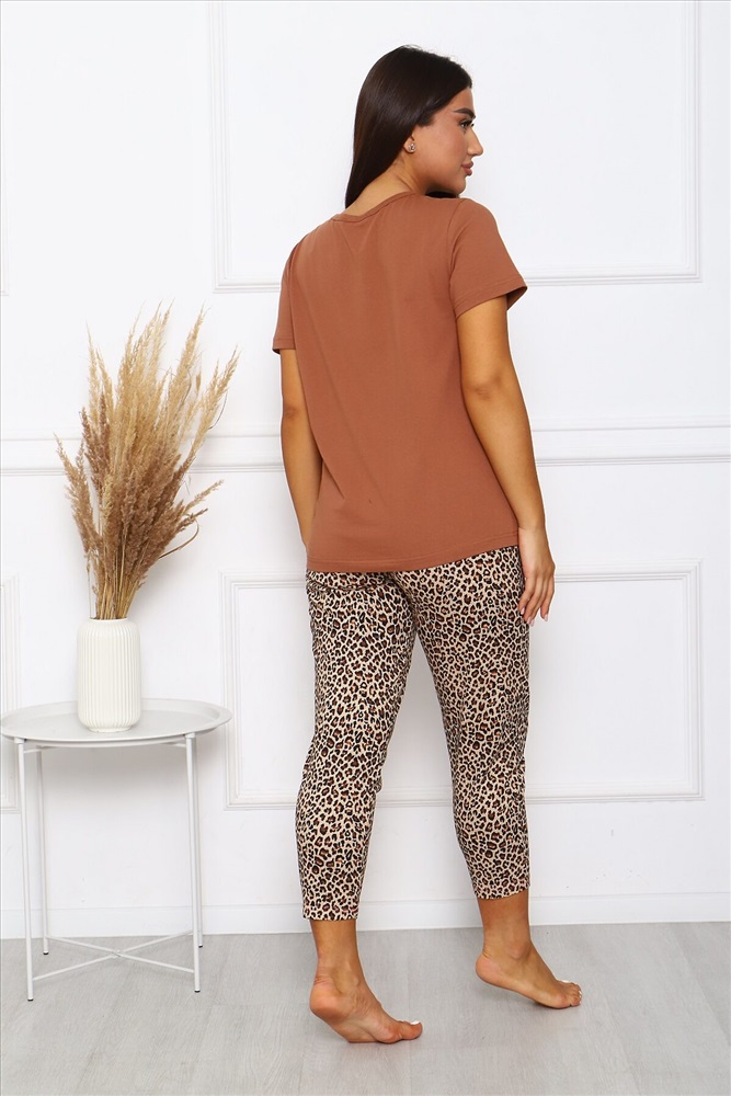 Страна производства: Россия Костюм женский Леопард состоит из брюк кроя бананы с карманами в боках, футболка классическая с короткими рукавами и с принтом на полочке.