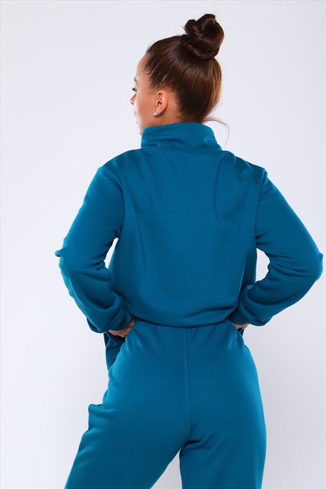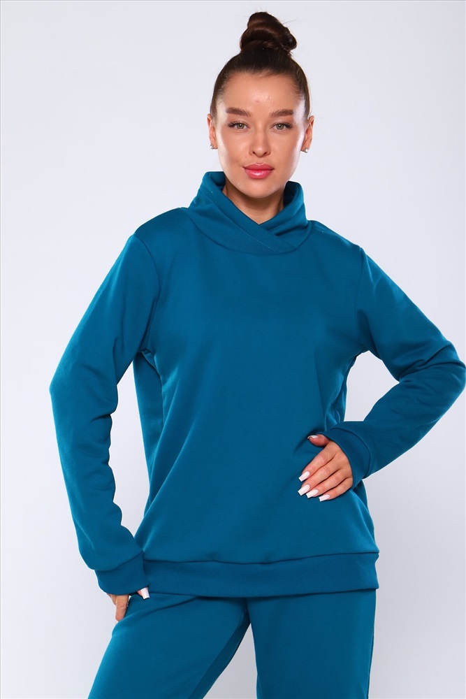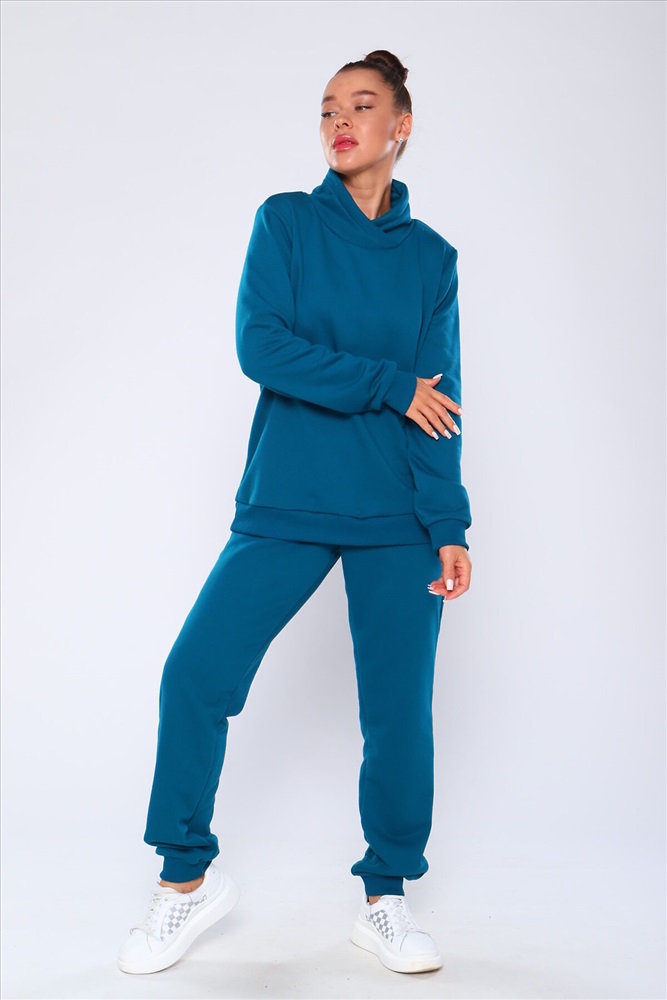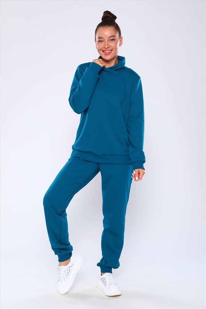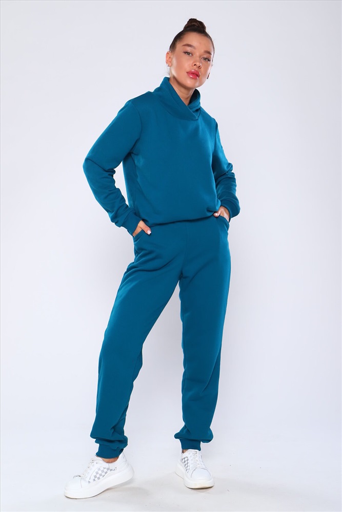 Костюм состоит из толстовки без капюшона с брюками, выполнен из плотного хлопкового трикотажа - футер 3-х нитка с петлей. Пояс и манжеты толстовки на резинке. Толстовка с высоким горлом, без карманов. Брюки с высокой посадкой на резинке, с боковыми карманами. Низ брюк отделан резинкой.
