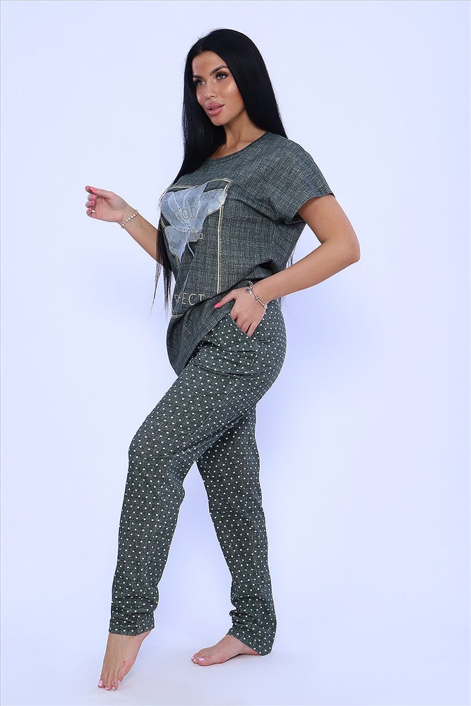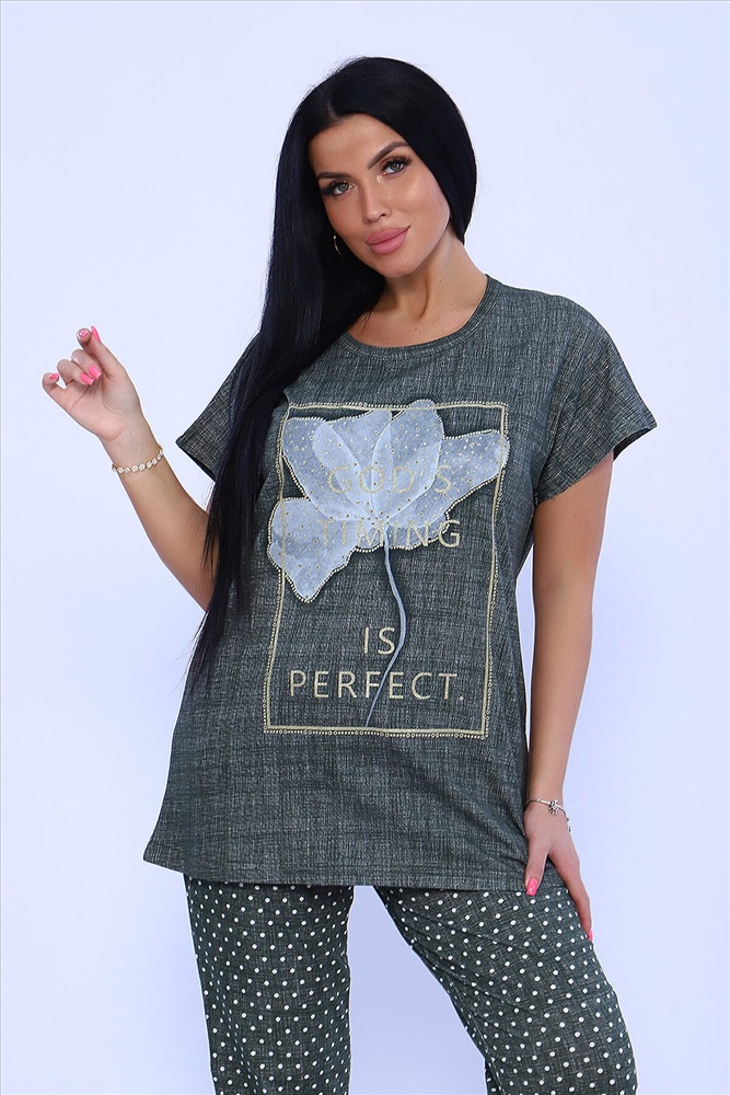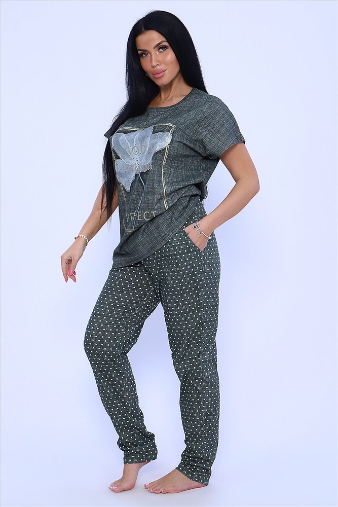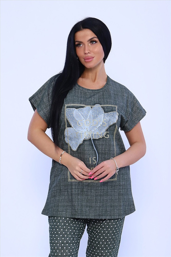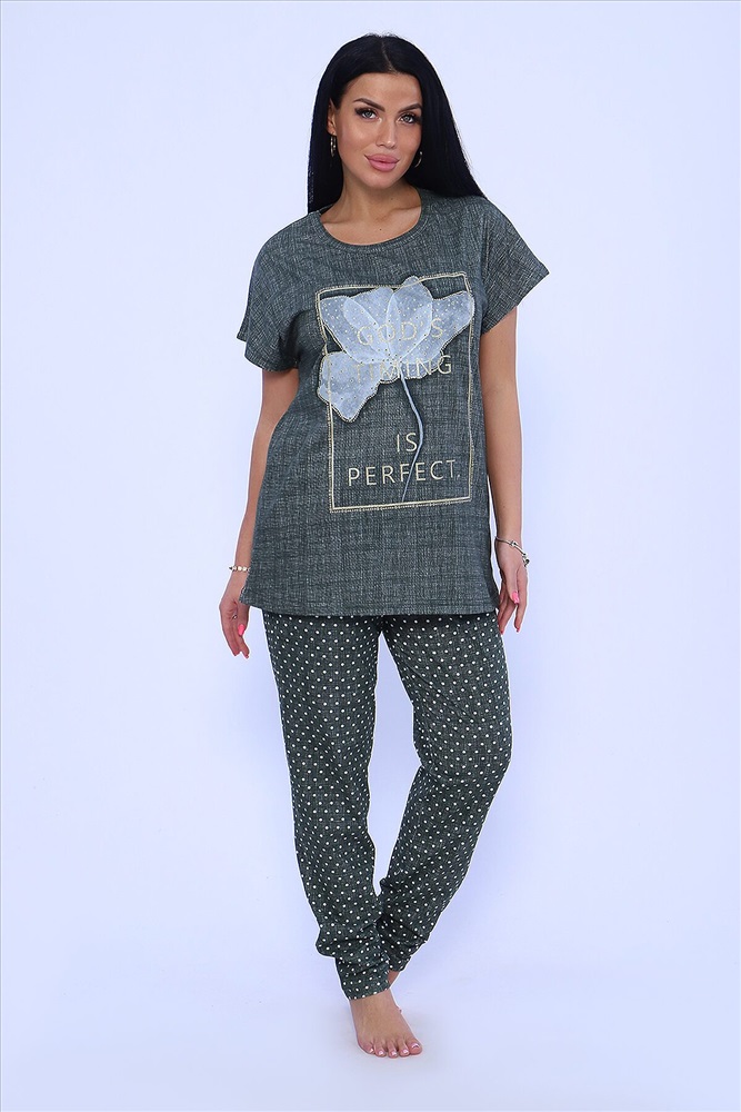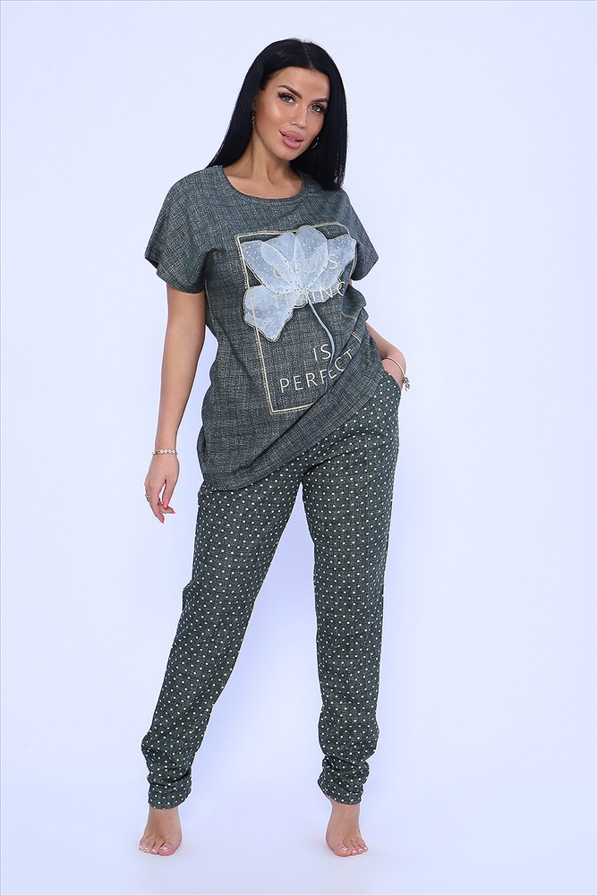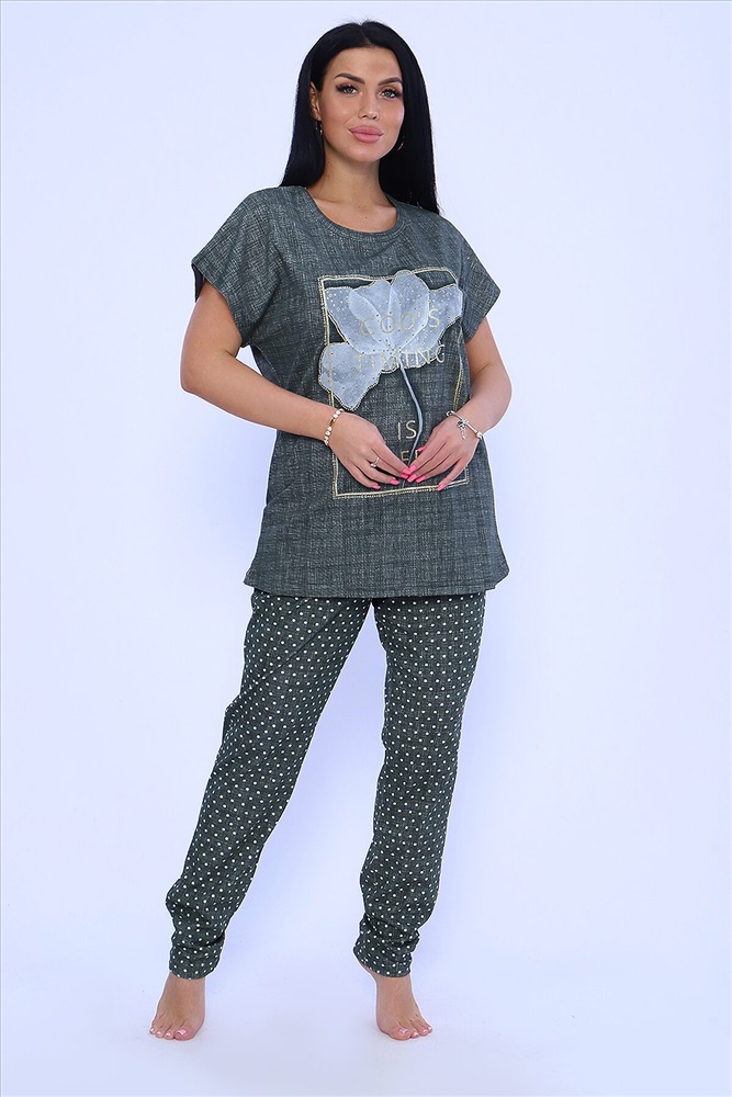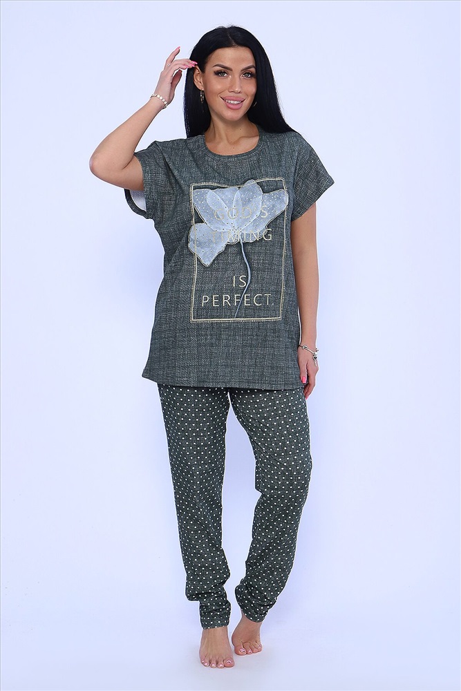 ID товара: 953913 Состав: Хлопок 100% Сезон: Демисезон Длина: Средняя Фасон: Прямой Рукав: Короткий Основная ткань: Хлопок Стиль: Повседневный Вид ткани: Кулирка Страна бренда: Россия Страна производства: Россия Классический и удобный трикотажный костюм с брюками из 100%-го хлопка! В комплекте костюма представлены кофта свободного кроя и брюки универсальной посадки. Кофта украшена ярким принтом в виде дивного и нежного цветка в золоченой рамке. Костюм - идеальный вариант домашней одежды для женщин, также прекрасно подойдет и для повседневной носки. Комментарии к товару