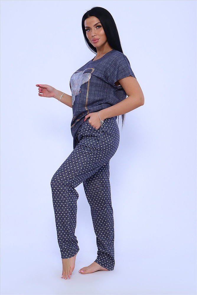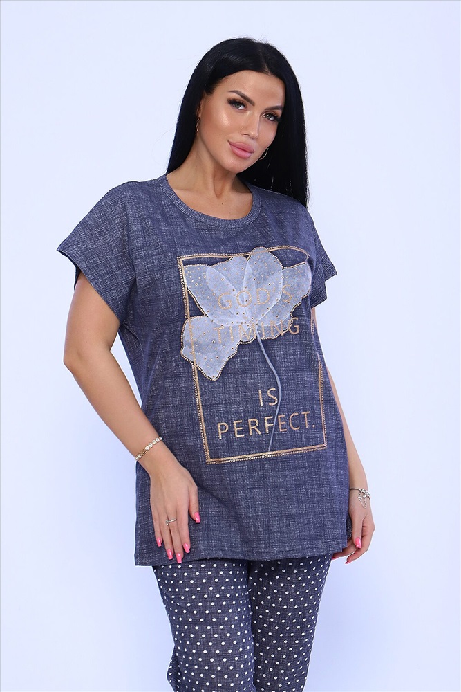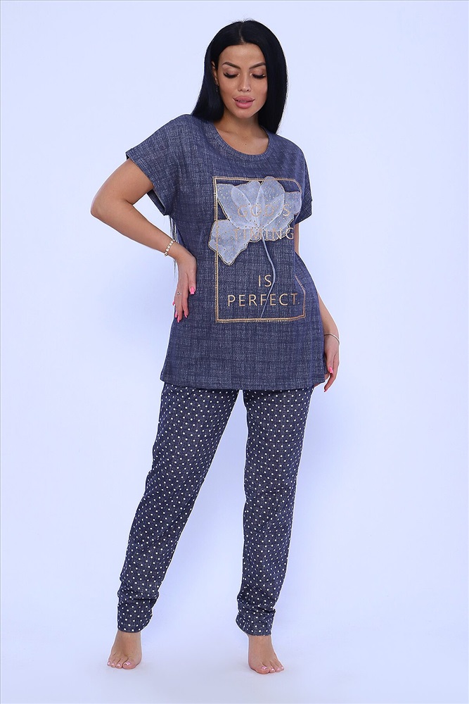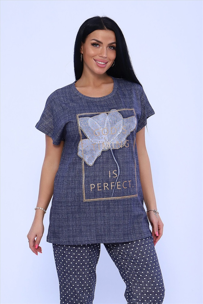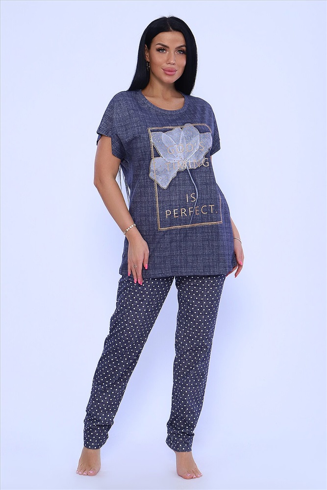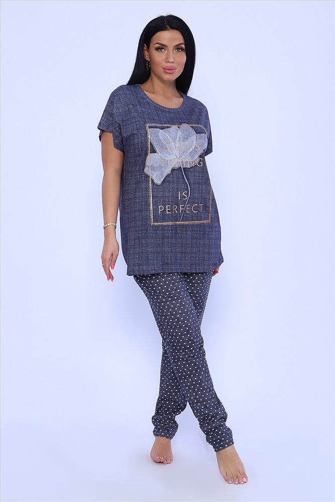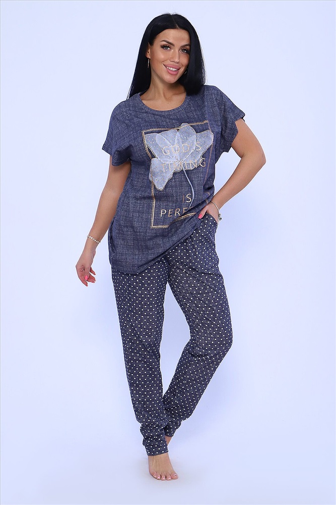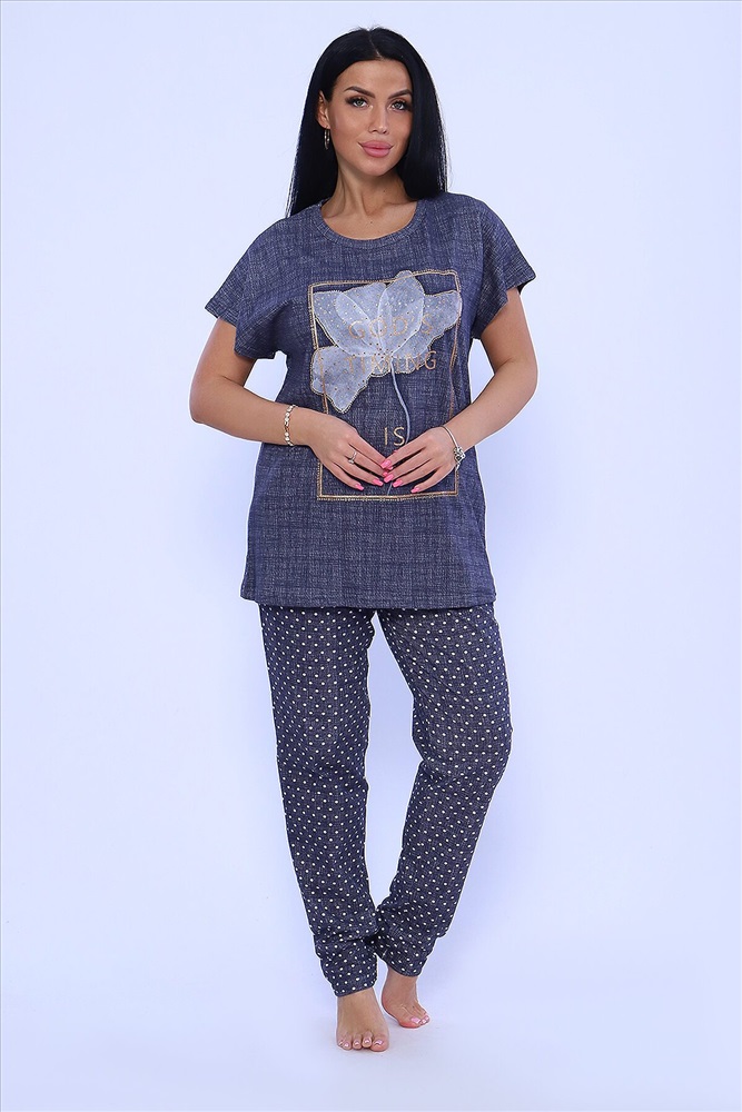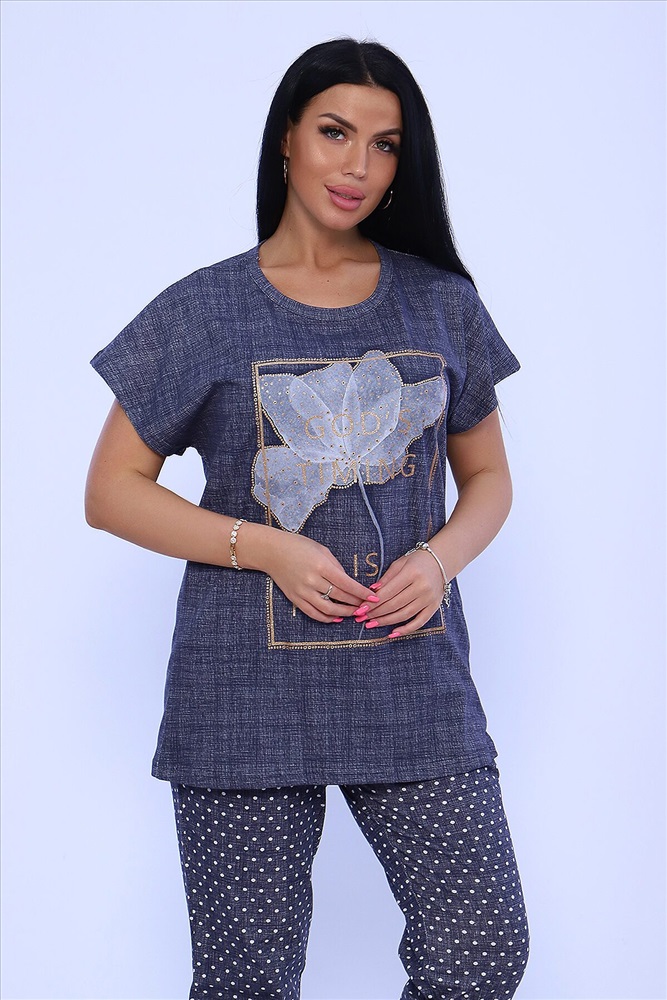 ID товара: 953914 Состав: Хлопок 100% Сезон: Демисезон Длина: Средняя Фасон: Прямой Рукав: Короткий Основная ткань: Хлопок Стиль: Повседневный Вид ткани: Кулирка Страна бренда: Россия Страна производства: Россия Классический и удобный трикотажный костюм с брюками из 100%-го хлопка! В комплекте костюма представлены кофта свободного кроя и брюки универсальной посадки. Кофта украшена ярким принтом в виде дивного и нежного цветка в золоченой рамке. Костюм - идеальный вариант домашней одежды для женщин, также прекрасно подойдет и для повседневной носки. Комментарии к товару