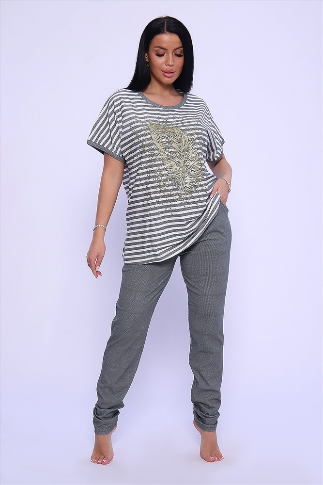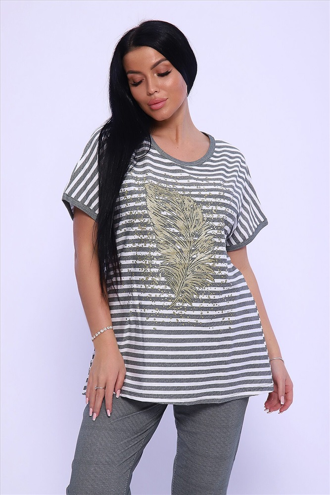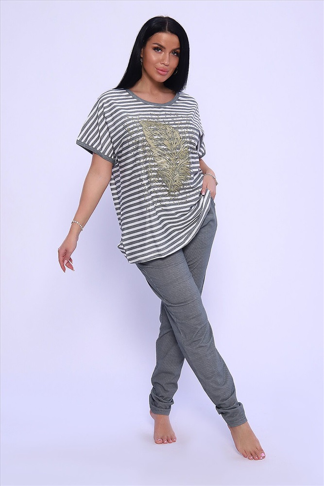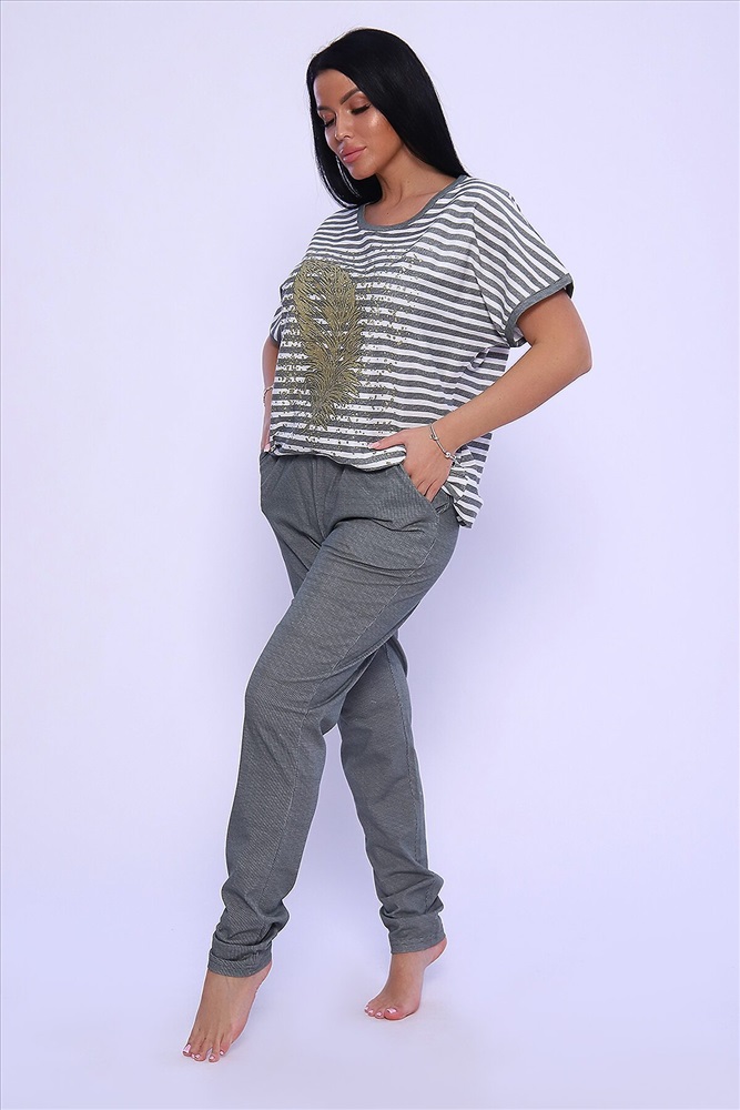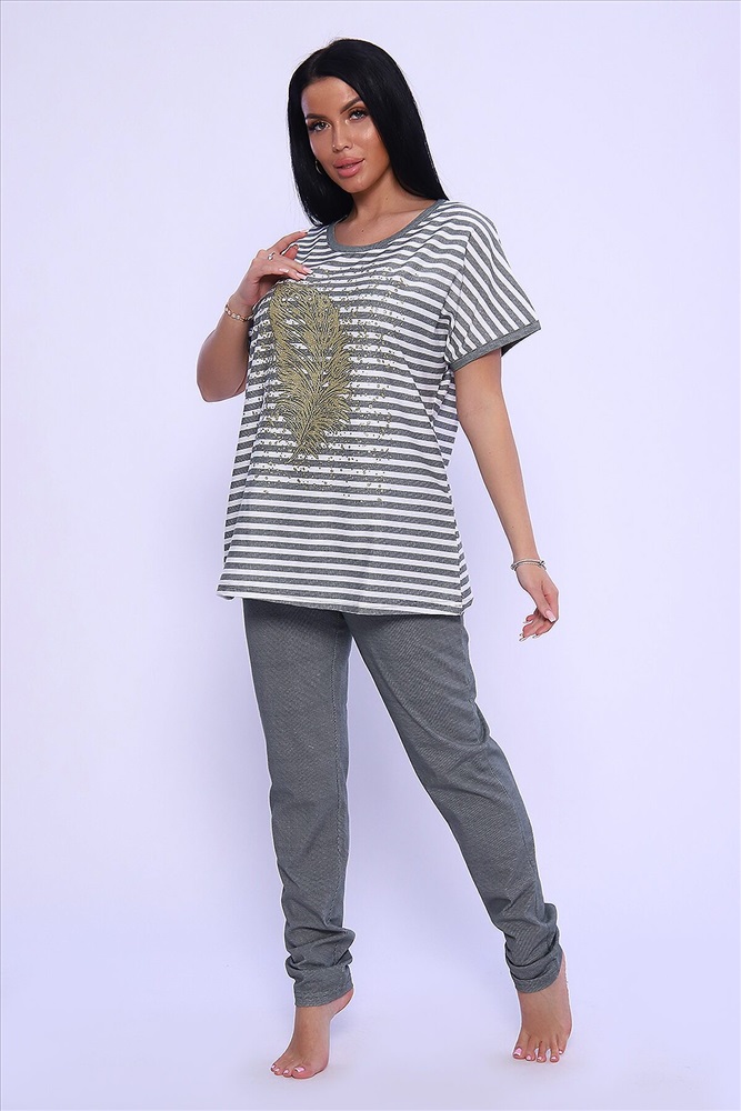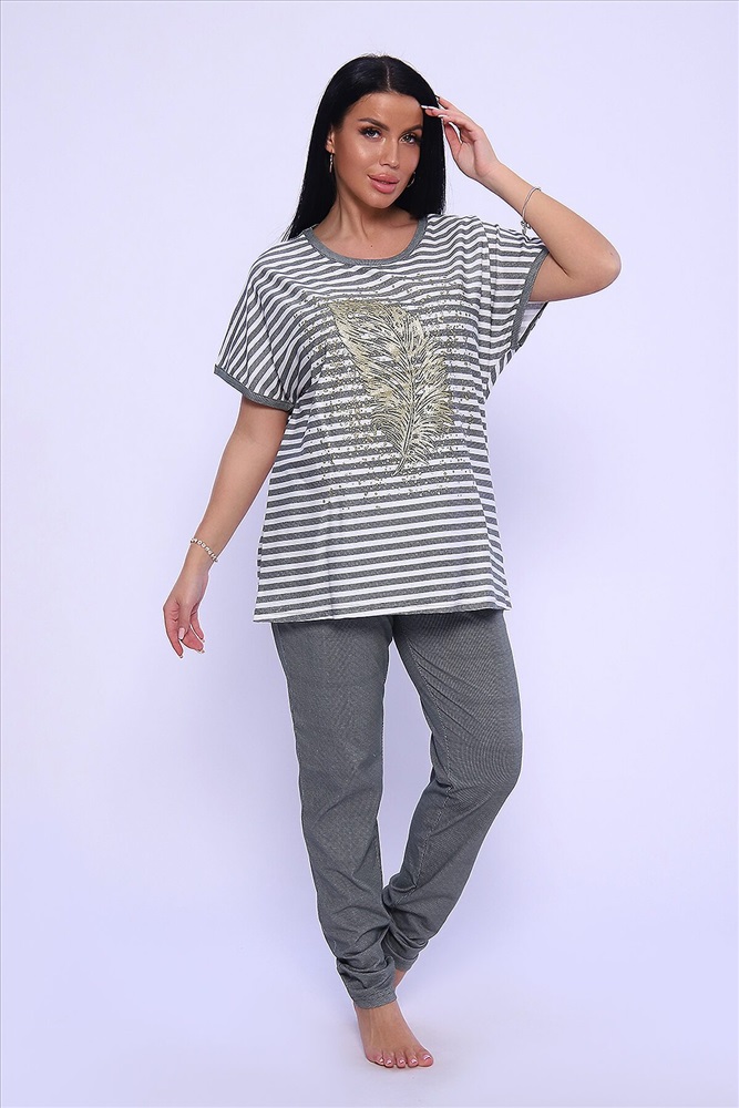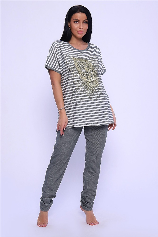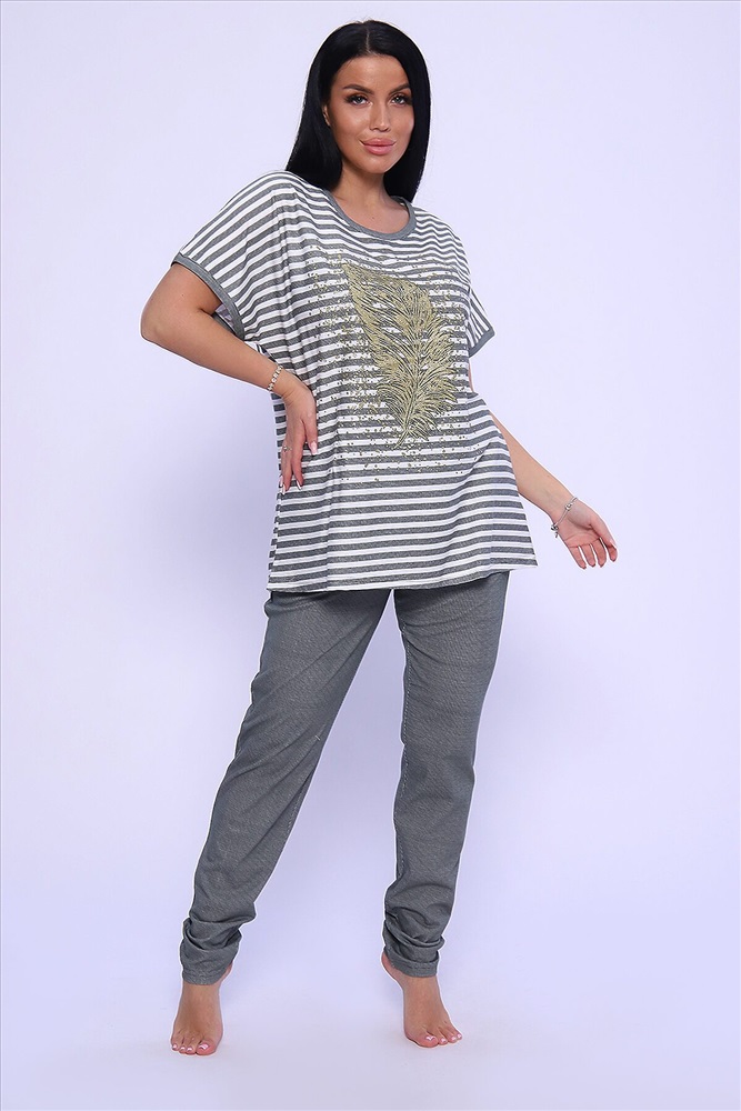 ID товара: 950089 Состав: Хлопок 100% Сезон: Демисезон Длина: Средняя Фасон: Прямой Рукав: короткие Крой брючин: Облегающий Рисунок: Полоски Тип карманов: С отрезным бочком Основная ткань: Хлопок Стиль: Повседневный Вид ткани: Кулирка Страна бренда: Россия Страна производства: Россия Универсальный женский костюм из кулирки (хлопок 100%) просто находка для любительниц комфорта и стиля! Костюм представлен в модном oversize стиле, поэтому идеально подход для женщин больших размеров и тех, кто любит просторную одежду. Костюм состоит из объемной кофты в горизонтальную линейку и брюк на резинке, которые великолепно садятся по фигуре, не стесняя движений. Кофта декорирована стильными принтом в виде пера жар-птицы, что придает изделию особый шик. Костюм прекрасно подходит как для домашних посиделок, так и для активных занятий на свежем воздухе. Не упустите возможность дополнить свой гардероб этим прекрасным комплектом! Комментарии к товару